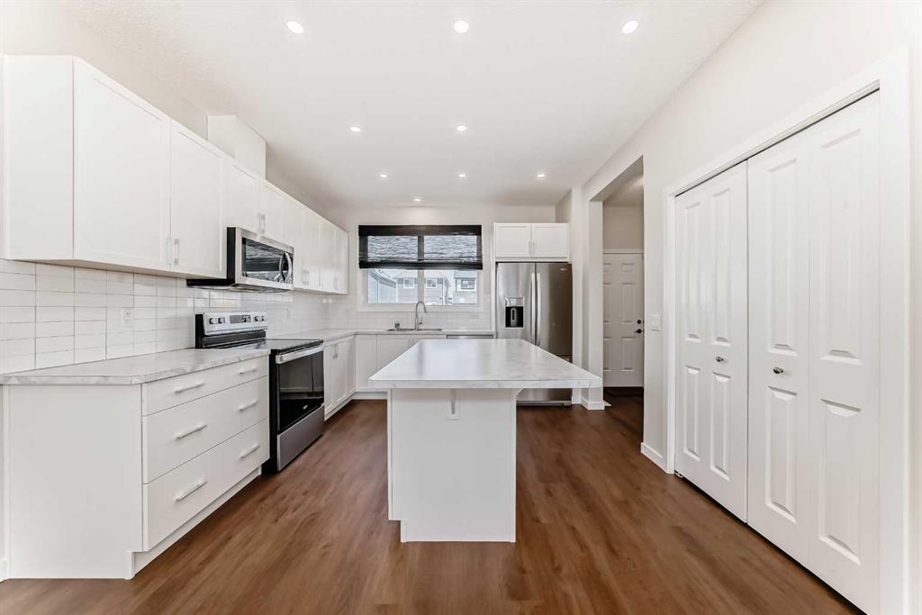 The bright and stylish kitchen features white cabinetry, stainless steel appliances—including a brand-new dishwasher—and durable vinyl plank flooring. The efficient L-shaped layout offers ample counter space, plenty of storage, and a central island perfect for quick breakfasts or entertaining guests.