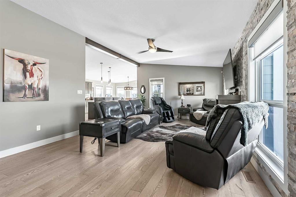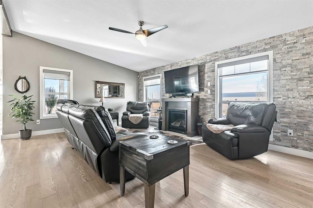 Where refined country living meets thoughtful design, this exceptional 4.82-acre equestrian estate offers privacy, security, and comfort -15 minutes to South Calgary or Okotoks. Tucked into a peaceful setting, you’ll enjoy wide-open space with quick access to shopping, dining, schools, and recreation. Enter through 12-foot double electric gates and follow the newly asphalted, slurry-sealed driveway to a custom 2,143 sq ft bungalow by Triple M Homes, perfectly positioned to capture mountain and pasture views. Inside, vaulted ceilings and abundant natural light create an airy, welcoming atmosphere. The living room is anchored by a gas fireplace with a striking brick feature wall — a warm focal point for gathering and relaxation. Floor plug-ins add flexibility for furniture placement and lighting.