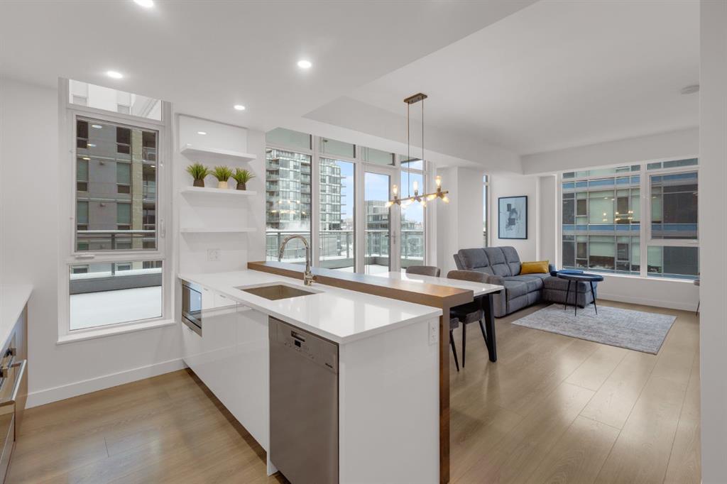 THE RESIDENCE This northwest corner suite is presented in pristine condition with partial views of the Bow River Valley. The thoughtful floor plan features bedrooms at opposite ends of the unit for maximum privacy—ideal for guests or a quiet home office. The kitchen features a premium appliance package, including Miele, Fulgor, and Blomberg, accented by quartz counters. Strategic upgrades include integrated LED lighting and a smart lock.