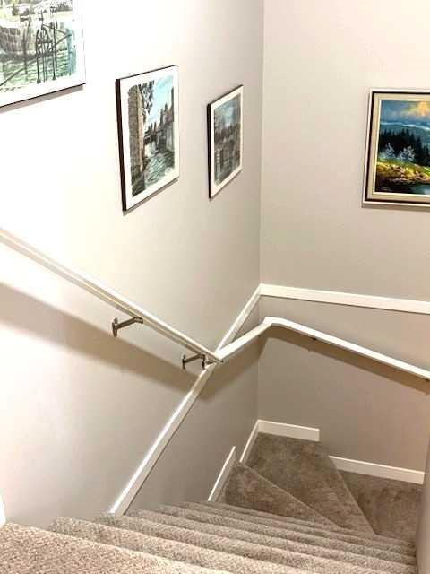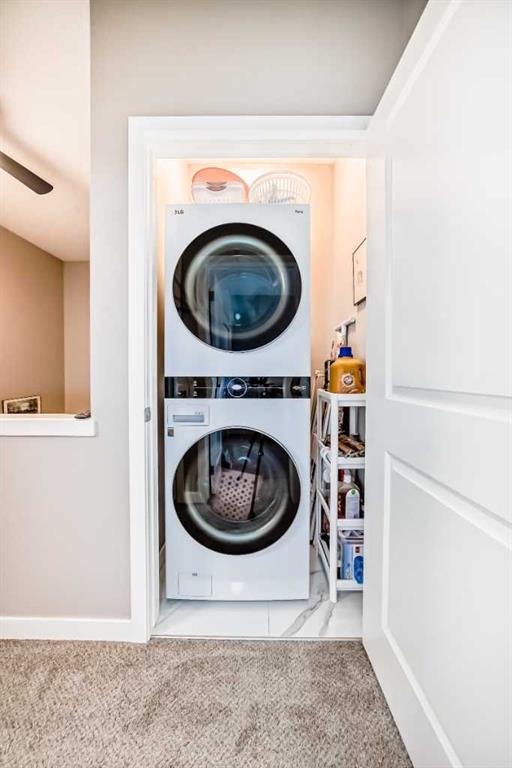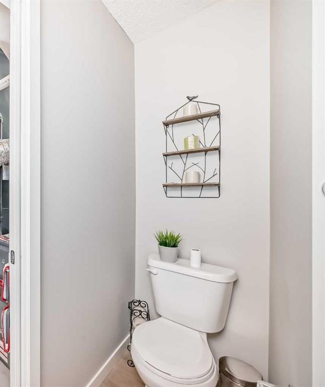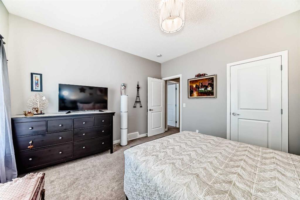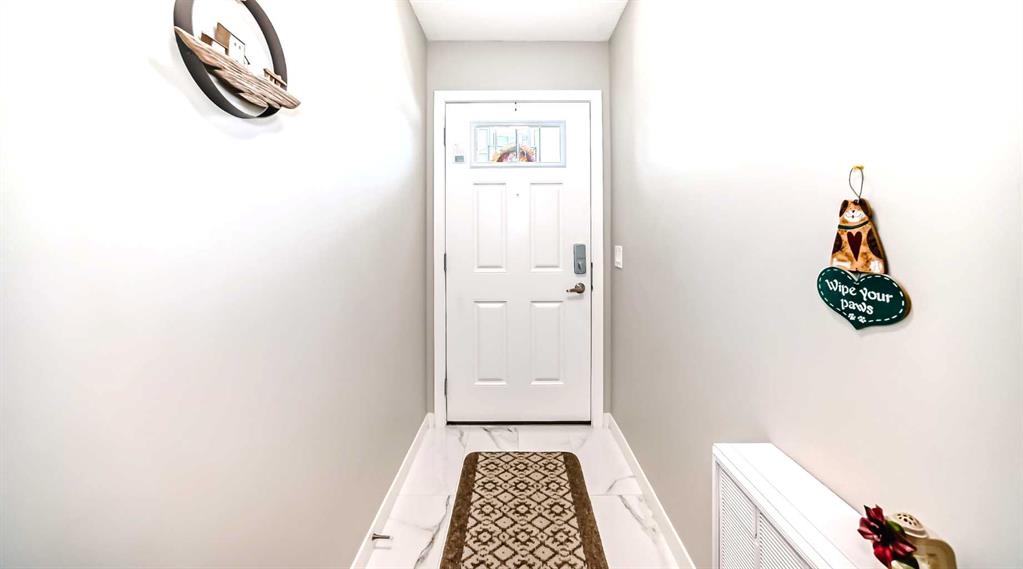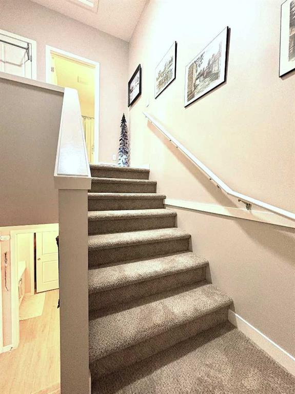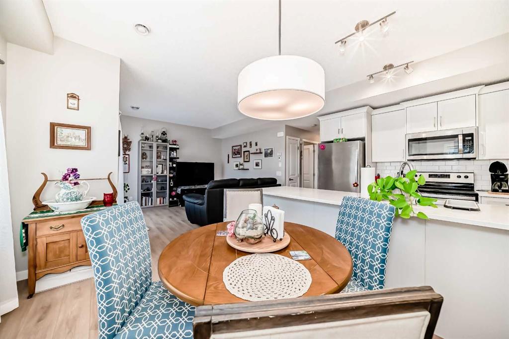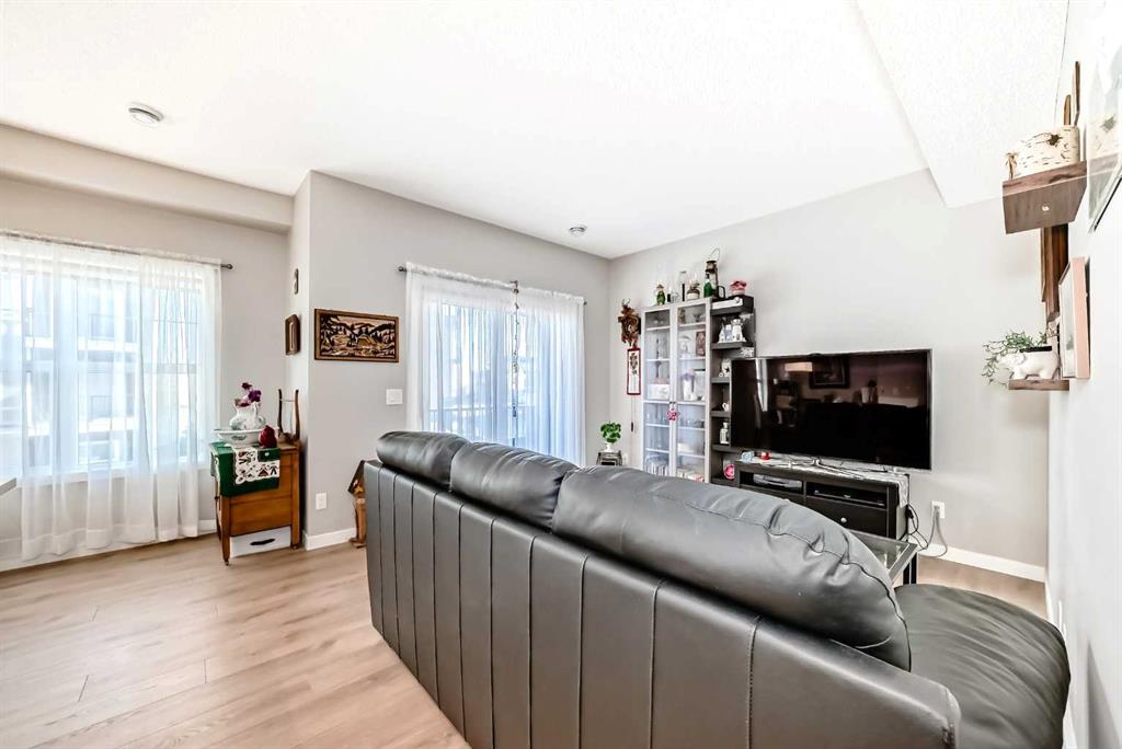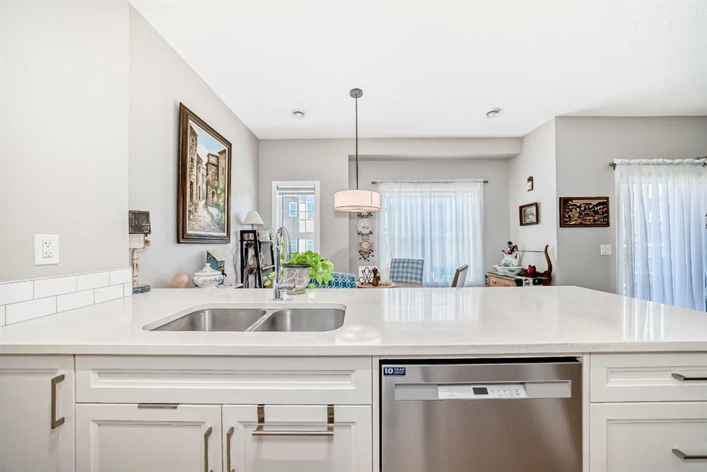 Welcome to this immaculate, upgraded townhome in the desirable community of Fireside, Cochrane, featuring peaceful pond and green space views that create a tranquil, nature-inspired setting. The bright, open-concept layout showcases a modern kitchen with quartz countertops, white shaker-style cabinetry with pull-out drawers, stainless steel appliances, and breakfast bar; other upgrades include wide plank flooring, plush carpets, 9-foot ceilings, quartz counters throughout, and energy-efficient LED lighting. Large windows and patio doors open to two private balconies with views of the pond, ideal for morning coffee or evening relaxation. The home offers two spacious bedrooms, including a primary bedroom with a walk-in closet, a full bathroom and a stylish powder room, upper-floor laundry, ample storage, as well as a separate storage unit, and a titled parking at the side of the front door, just perfect for off loading groceries and everyday errands. Located in a well-managed, family-friendly complex close to schools, parks, walking paths, shopping, and recreation, with easy access to Calgary and approximately one hour from Banff and Canmore, this home delivers exceptional value and lifestyle.