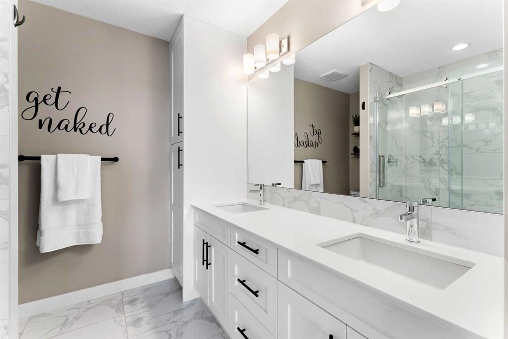 The primary suite delivers a spa like experience with a comfort height double vanity with drawers, full height linen tower, undermount sinks with 2cm quartz countertops, and a generous walk in shower with sliding glass door. Throughout the home, enjoy LVP flooring on the main level, upgraded tile in the bathrooms, knockdown ceilings, Hunter Douglas Silhouettes, and a stacked Samsung laundry pair.