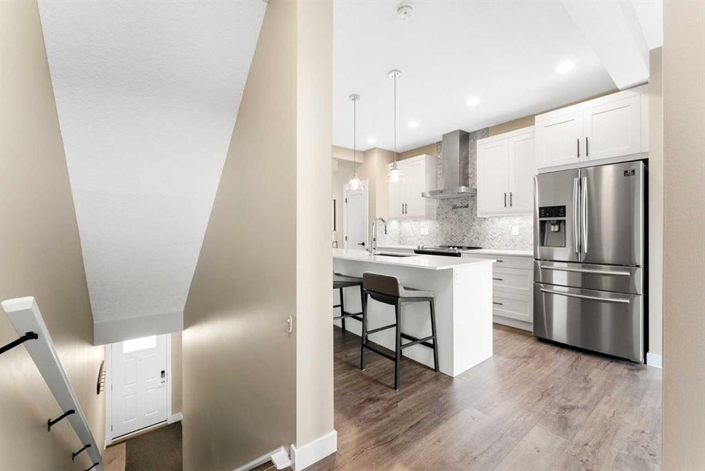 The chef inspired kitchen exudes sophistication with 2cm quartz countertops, upgraded soft close cabinetry, a full height tile backsplash, chimney style hood fan, silgranit double undermount sink with premium faucet, pendant lighting over an impressive 8’9″ island, and upgraded stainless steel appliances with water/ice.