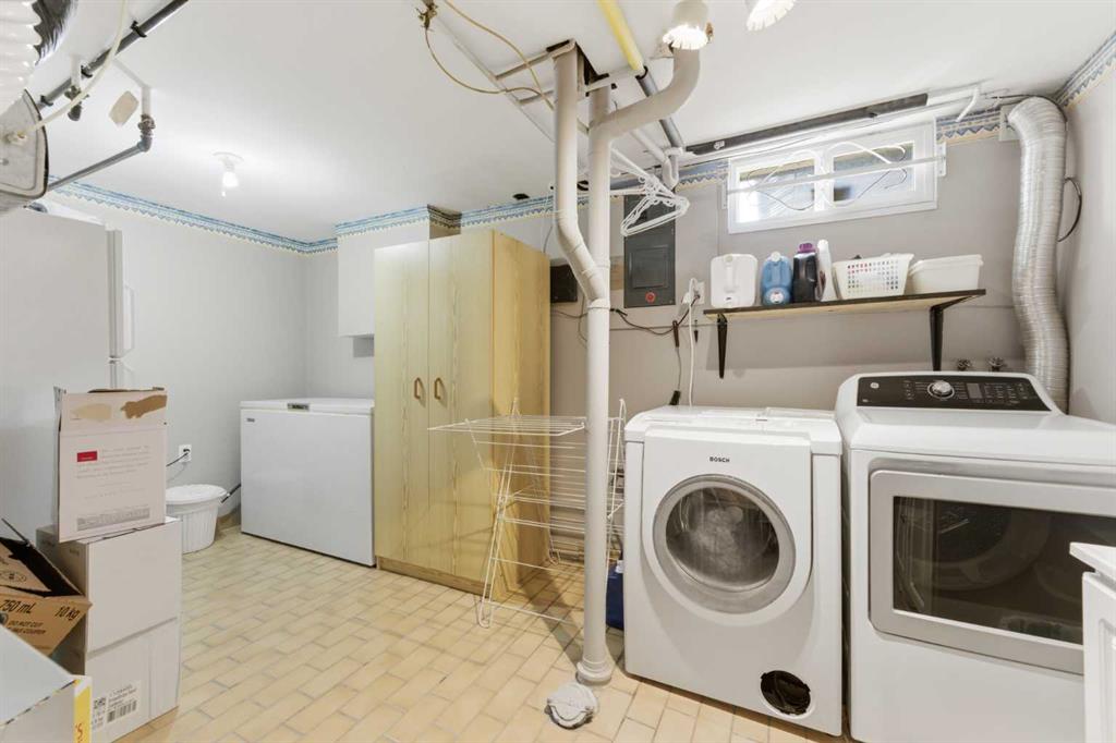 Step inside to a bright, open main floor featuring original hardwood flooring and a functional layout designed for both everyday living and entertaining. The kitchen offers timeless appeal with custom solid wood cabinetry—expertly crafted by a skilled woodworker—alongside white appliances, tile flooring, and a large window above the sink that fills the space with natural light. A versatile main floor bedroom or office and a full 4-piece bathroom complete this level.