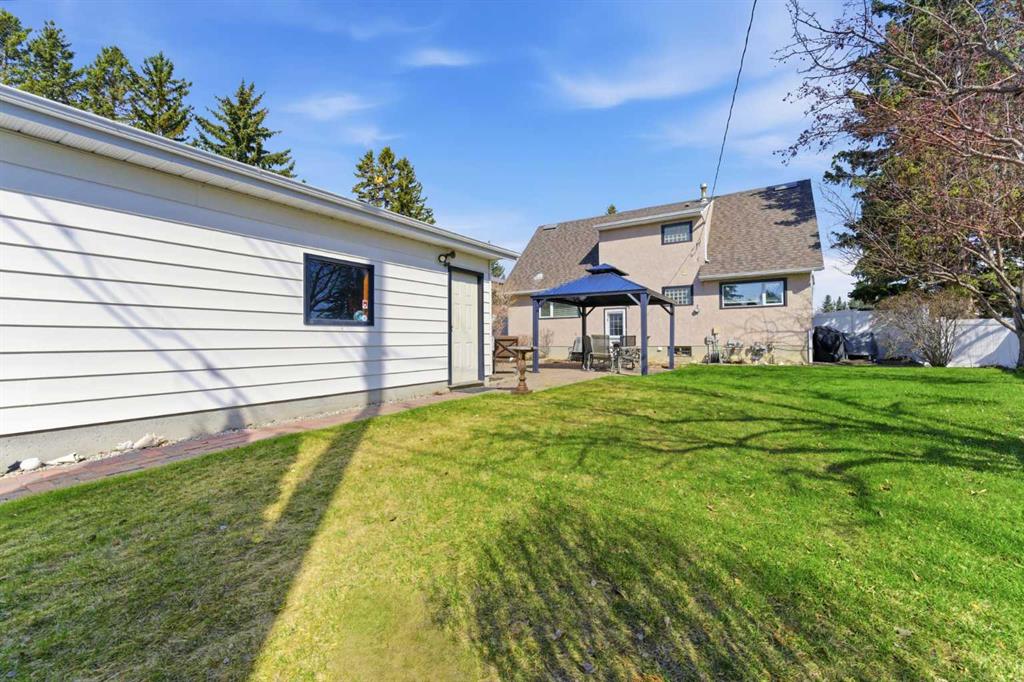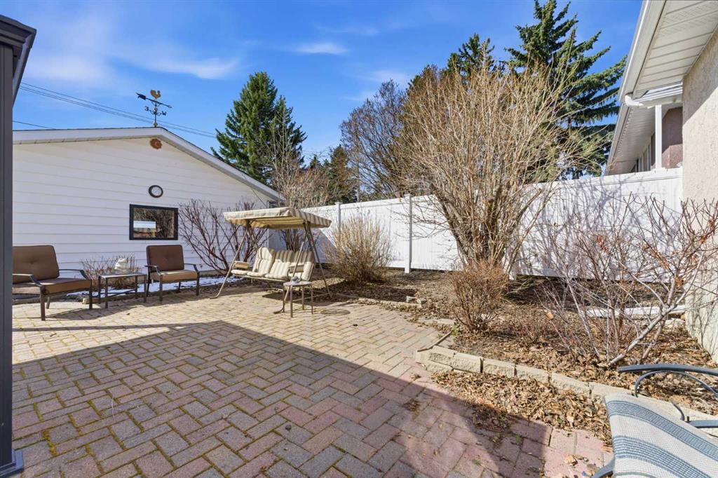 Outside, enjoy the thoughtfully landscaped yard with mature trees, a brick patio, and a new vinyl fence—perfect for relaxing or entertaining in your private outdoor space. The exposed aggregate walkway adds to the home’s curb appeal, while the double detached garage provides ample parking and storage.
