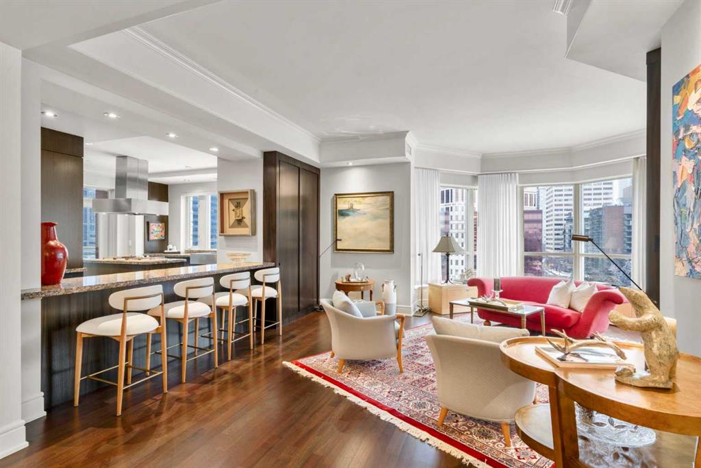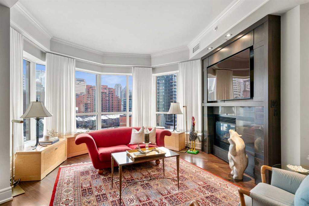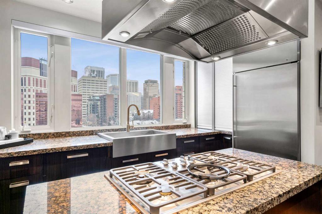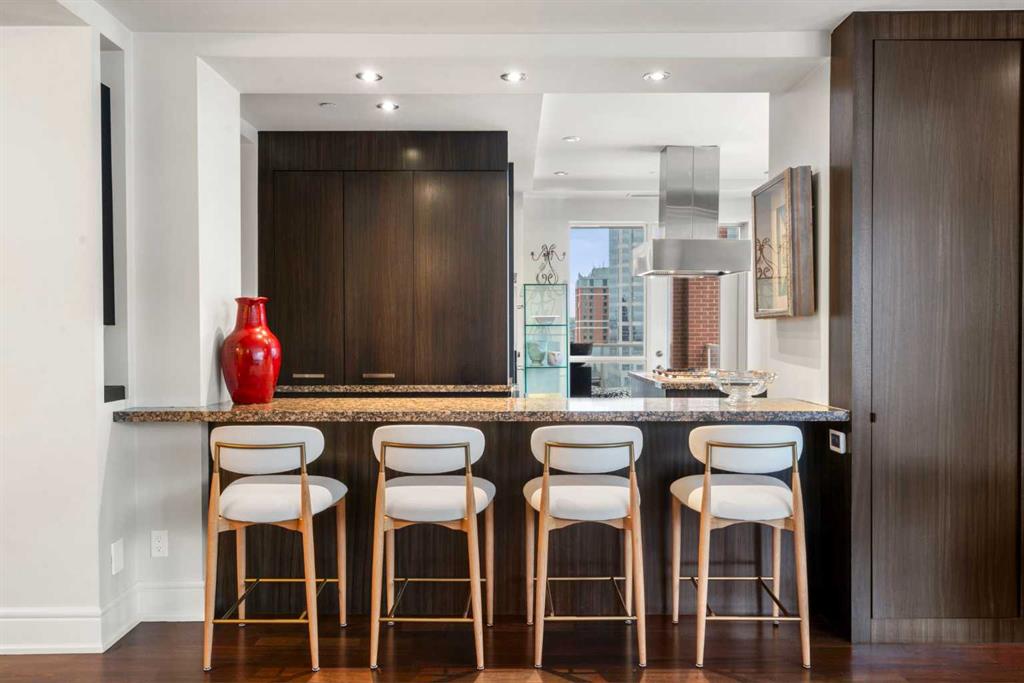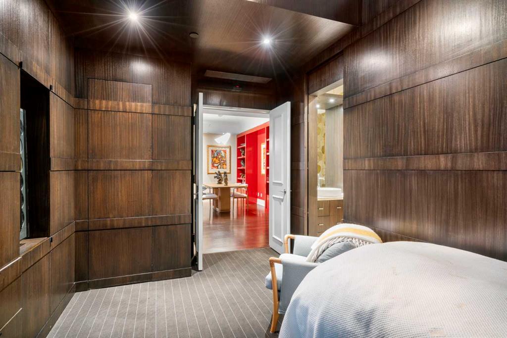 Welcome to Princeton Hall, one of Calgary’s most prestigious and renowned residential addresses, ideally situated in the heart of Eau Claire, directly along the Bow River and Prince’s Island Park. This exceptional 8th-floor, southwest-facing corner residence offers 1716 sq. ft. of luxurious living space, flooded with natural light through expansive floor-to-ceiling windows showcasing breathtaking views of the river, park, and downtown skyline. Meticulously redesigned by pre-eminent interior designer Douglas Cridland, the home is a refined contemporary masterpiece featuring rich solid hardwood flooring, exotic zebra wood paneling, custom solid wood built-ins, coffered ceilings, gas fireplaces, B&O sound system, luxurious wool carpeting in the bedrooms, Hunter Douglas window coverings, and central AC. The open concept living and dining areas are ideal for both elegant entertaining and everyday comfort featuring floor to ceiling windows, fireplace with custom feature wall, plus feature shelving in the dining area. The primary suite is a private retreat, totally separated from the main living area, featuring two walls of windows, a dual sided fireplace to the ensuite, wall-mounted TV, boutique style wood paneled walk-in closet, in addition to a full wall of built-in drawers and cabinets, custom blinds, a spa-inspired 5-piece ensuite with freestanding wet tub, multiple head walk-in shower, granite counters, private water closet and granite tiled walls. The second bedroom / den showcases stunning wood paneling, plus discreetly concealed 3 piece ensuite and closets. The gourmet kitchen impresses with extensive custom cabinetry, thick granite counters, an oversized storage rich island, dual sized deep sink, professional appliances including gas cooktop with designer hood fan, built-in wall oven, microwave/oven, warming drawer, wine and bar fridges, Monogram fridge, dishwasher, and sleek aluminum pull-down cabinet doors that allow the storage to be concealed. The unique eating bar affords additional storage. The generous covered terrace with a gas BBQ line extends the living space. The beautifully finished service room combines in-suite laundry and storage. Exclusive features include private elevator access directly into the suite, two titled heated underground parking stalls, and an oversized titled storage locker. Princeton Hall offers a truly elevated lifestyle with 24 hour concierge, grand two story lobby, fitness center with steam and sauna, temperature controlled wine cellar and tasting room, private function and board rooms, owner’s lounge, guest suite, visitor parking, and a heated underground parkade with car wash. Steps from river pathways, downtown offices, boutique shopping, fine dining, Kensington, and major routes, this remarkable residence presents a rare opportunity to own an extraordinary home in one of Western Canada’s most distinguished condominium developments.