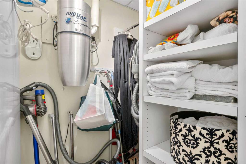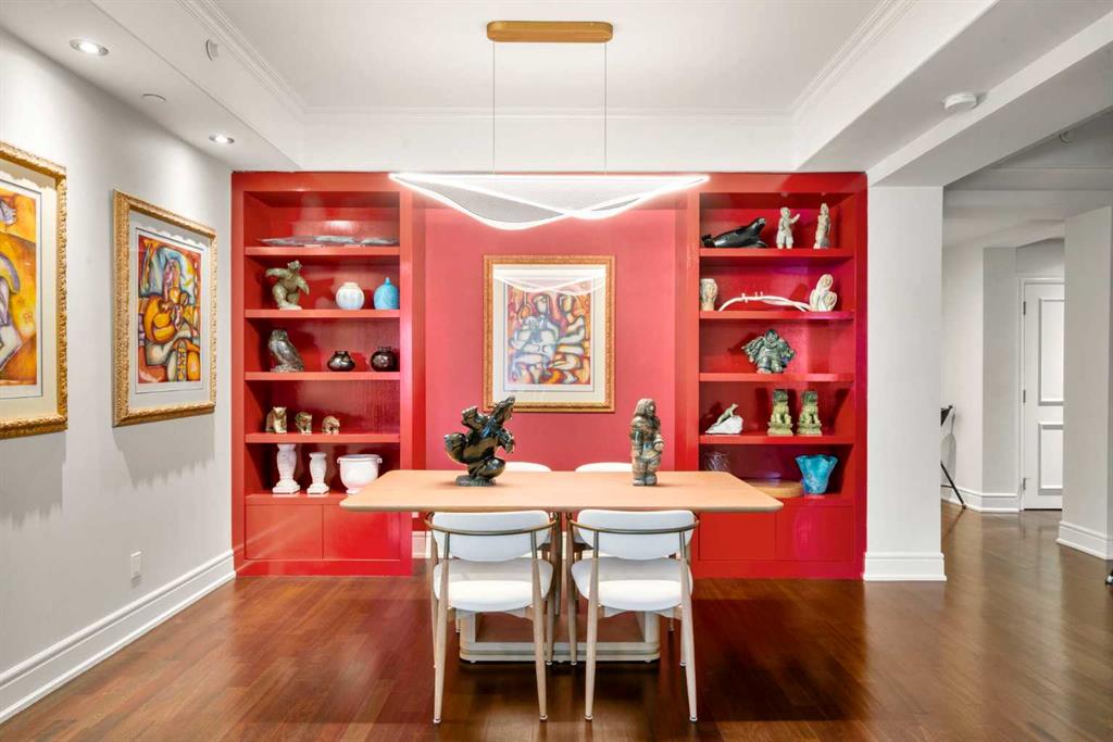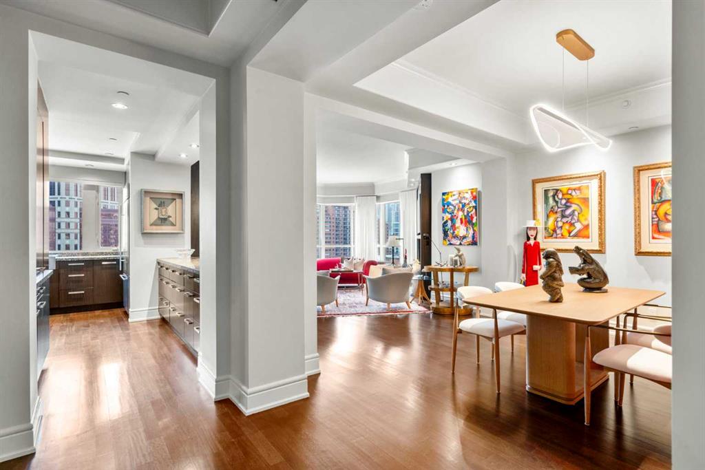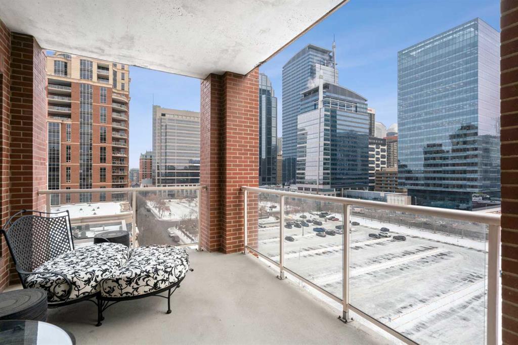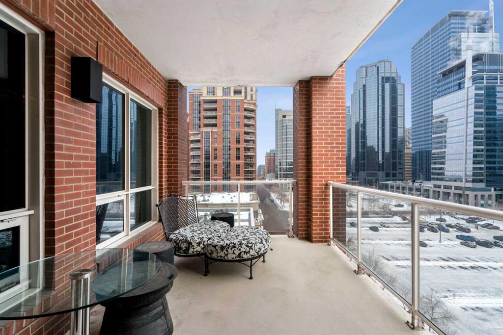 Welcome to Princeton Hall, one of Calgary’s most prestigious and renowned residential addresses, ideally situated in the heart of Eau Claire, directly along the Bow River and Prince’s Island Park. This exceptional 8th-floor, southwest-facing corner residence offers 1716 sq. ft. of luxurious living space, flooded with natural light through expansive floor-to-ceiling windows showcasing breathtaking views of the river, park, and downtown skyline. Meticulously redesigned by pre-eminent interior designer Douglas Cridland, the home is a refined contemporary masterpiece featuring rich solid hardwood flooring, exotic zebra wood paneling, custom solid wood built-ins, coffered ceilings, gas fireplaces, B&O sound system, luxurious wool carpeting in the bedrooms, Hunter Douglas window coverings, and central AC. The open concept living and dining areas are ideal for both elegant entertaining and everyday comfort featuring floor to ceiling windows, fireplace with custom feature wall, plus feature shelving in the dining area. The primary suite is a private retreat, totally separated from the main living area, featuring two walls of windows, a dual sided fireplace to the ensuite, wall-mounted TV, boutique style wood paneled walk-in closet, in addition to a full wall of built-in drawers and cabinets, custom blinds, a spa-inspired 5-piece ensuite with freestanding wet tub, multiple head walk-in shower, granite counters, private water closet and granite tiled walls. The second bedroom / den showcases stunning wood paneling, plus discreetly concealed 3 piece ensuite and closets. The gourmet kitchen impresses with extensive custom cabinetry, thick granite counters, an oversized storage rich island, dual sized deep sink, professional appliances including gas cooktop with designer hood fan, built-in wall oven, microwave/oven, warming drawer, wine and bar fridges, Monogram fridge, dishwasher, and sleek aluminum pull-down cabinet doors that allow the storage to be concealed. The unique eating bar affords additional storage. The generous covered terrace with a gas BBQ line extends the living space. The beautifully finished service room combines in-suite laundry and storage. Exclusive features include private elevator access directly into the suite, two titled heated underground parking stalls, and an oversized titled storage locker. Princeton Hall offers a truly elevated lifestyle with 24 hour concierge, grand two story lobby, fitness center with steam and sauna, temperature controlled wine cellar and tasting room, private function and board rooms, owner’s lounge, guest suite, visitor parking, and a heated underground parkade with car wash. Steps from river pathways, downtown offices, boutique shopping, fine dining, Kensington, and major routes, this remarkable residence presents a rare opportunity to own an extraordinary home in one of Western Canada’s most distinguished condominium developments.