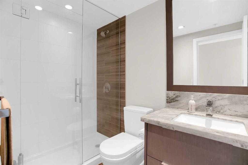 Exceptional value in this modern 2-bedroom + den, 2-bathroom corner residence in the sought-after Evolution Fuse tower in East Village. With expansive floor-to-ceiling Low-E windows, this home is bathed in natural light and showcases stunning views of the Bow River, St. Patrick’s Island, and the vibrant East Village skyline. The thoughtfully designed open-concept layout offers both style and functionality. The living area provides the perfect setting to enjoy morning coffee with sunrise river views, while the separate dining space comfortably accommodates sit-down dinners and entertaining. The contemporary kitchen features glossy white upper cabinetry paired with warm wood-grain lower cabinets, granite countertops with full-height backsplash, an undermount sink, and premium stainless steel appliances. The primary retreat includes a walk-in closet and a spa-inspired 4-piece ensuite complete with granite vanity and in-floor radiant heating. The second bedroom is well-sized and ideally positioned near the 3-piece bath for privacy. A generous den offers excellent flexibility for a home office or additional storage. Step outside to the oversized balcony with gas BBQ hookup — the perfect vantage point for summer evenings, city lights, and even Stampede fireworks. Additional highlights include in-suite full-size front-loading washer and dryer, underground parking, and a separate storage locker. Residents of Evolution enjoy concierge service, a fully equipped fitness centre with steam room and sauna, secure underground visitor parking, and a beautifully designed garden terrace. Located in one of Calgary’s most dynamic riverfront communities, East Village places you steps from river pathways, parks, restaurants, cafés, the Central Library, Studio Bell, and the LRT. With the future Event Centre and arena development underway, this location continues to grow in both lifestyle appeal and long-term value. Make this lifestyle yours. Ideal for professionals, urban buyers, or investors seeking strong rental potential in a premier downtown setting.