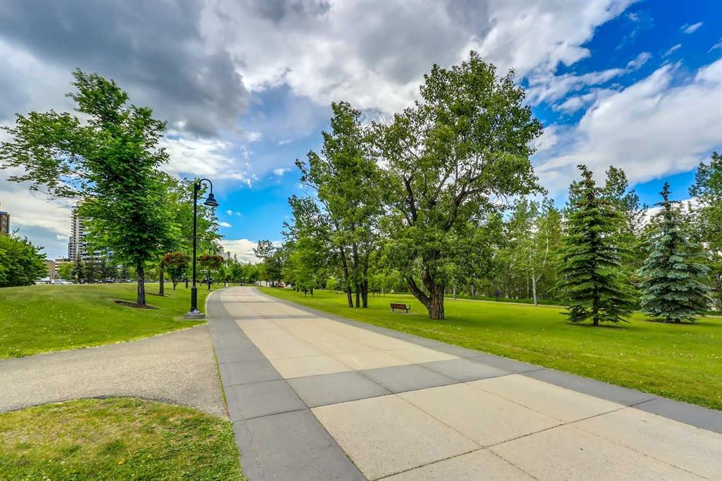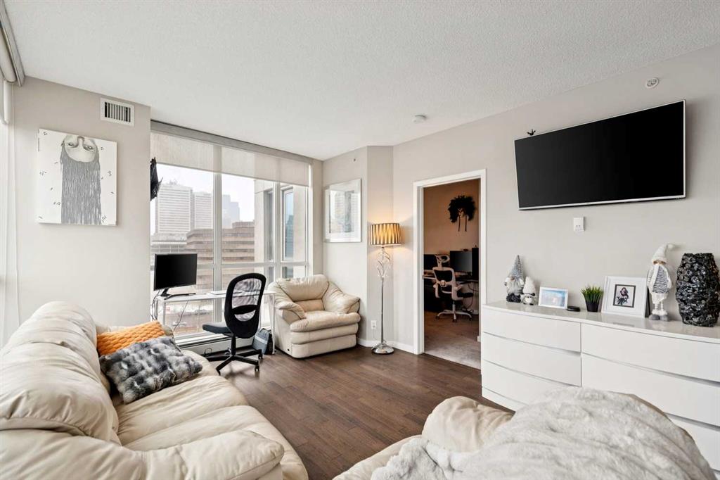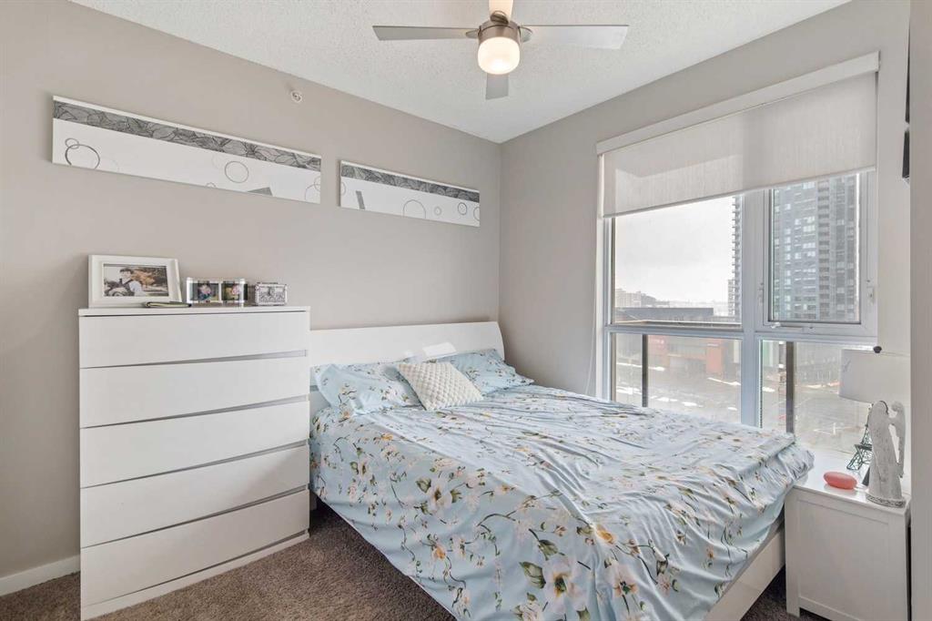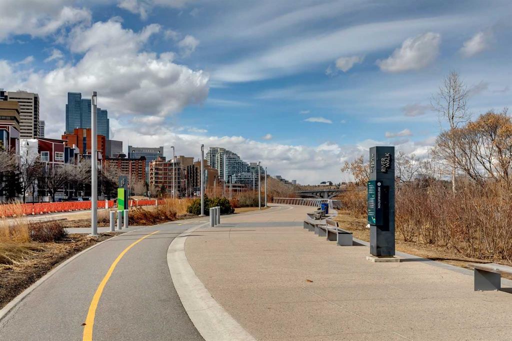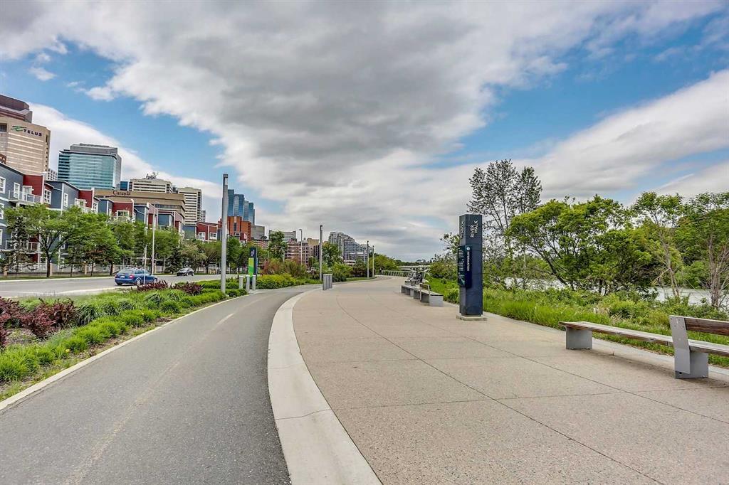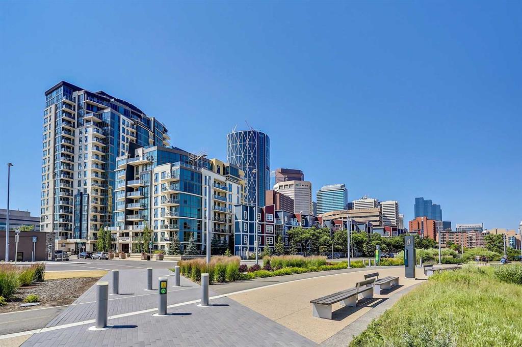 Welcome to Riverfront Pointe—where modern, sophisticated urban living meets everyday convenience in the heart of East Village, one of Calgary’s most vibrant and evolving communities. This thoughtfully designed 2BD/2BA condo offers an ideal layout for urban professionals, couples, or roommates seeking both comfort and flexibility. The MASTER BEDROOM features a full-size closet, 4-piece ensuite, and easily fits a king-sized bed, while the SECOND BEDROOM is generously sized with its own full bathroom—perfect for guests or shared living. FLOOR-TO-CEILING WINDOWS flood the space with natural light, enhancing the open-concept design. The kitchen features S/S APPLIANCES and flows seamlessly into the living and dining areas—ideal for entertaining or unwinding after a long day. Step outside to your expansive S/SW-FACING BALCONY, perfect for summer evenings and front-row views of the Stampede fireworks. A true standout is the RARE TITLED TANDEM PARKING STALL – FITS TWO FULL-SIZE VEHICLES – IN A HEATED, SECURED PARKADE—an exceptional find in a downtown location. Positioned above the third floor—where homes are typically quieter—THIS UNIT OFFERS A PEACEFUL ESCAPE from street-level noise, while still being steps from everything East Village has to offer. Enjoy 24-HOUR SECURITY, an ON-SITE GYM, and unbeatable access to the Bow River pathways, Superstore, Shoppers Drug Mart, Winners, and countless dining and lifestyle amenities. With the NEW EVENT CENTRE AND ENTERTAINMENT DISTRICT just a few blocks away, East Village continues to evolve—making this not only a home, but a smart investment in location and lifestyle. Set on a quiet cul-de-sac with ample visitor parking and pet-friendly (with board approval), this building offers both comfort and convenience. Units with this combination of layout, location, and titled tandem parking rarely come available—don’t miss this opportunity. Call your favourite realtor and book a private showing today!