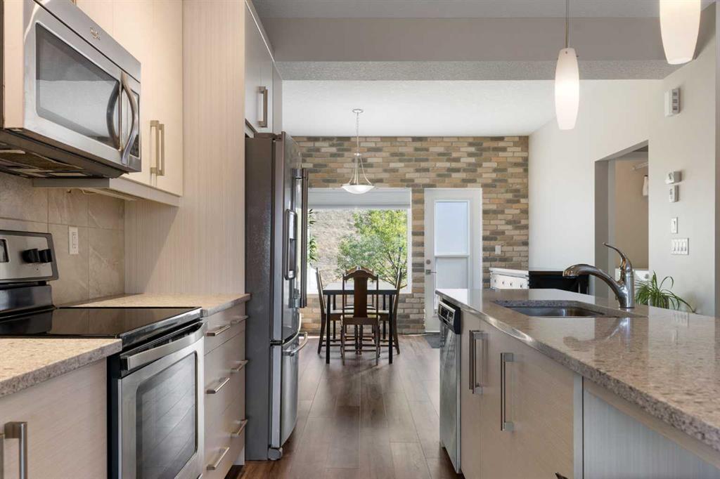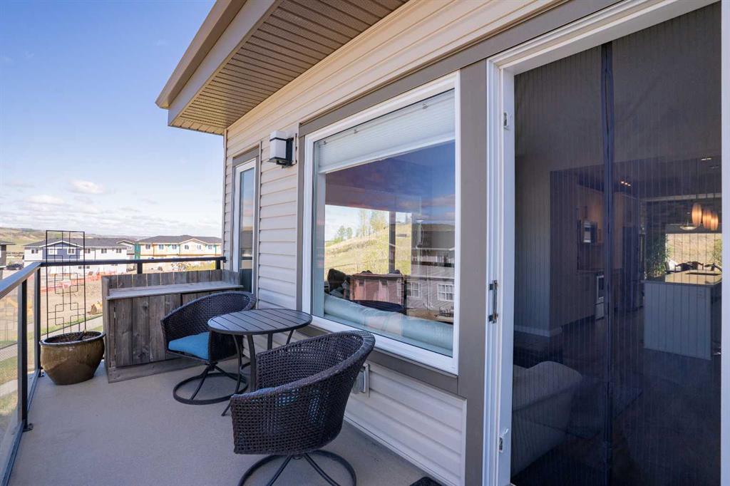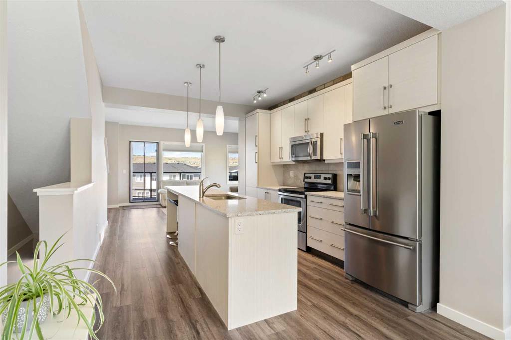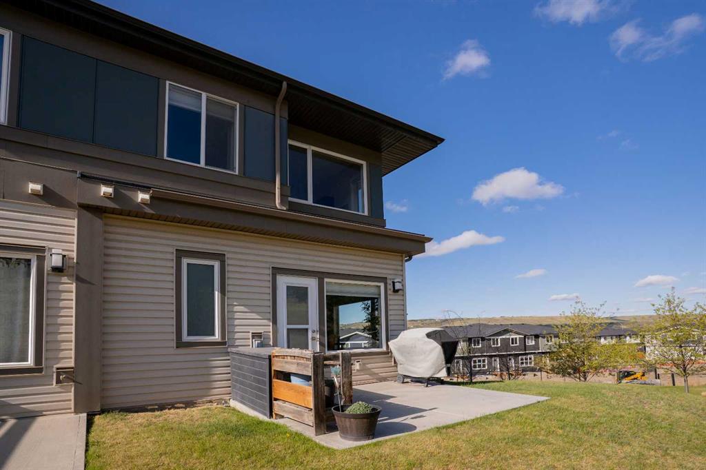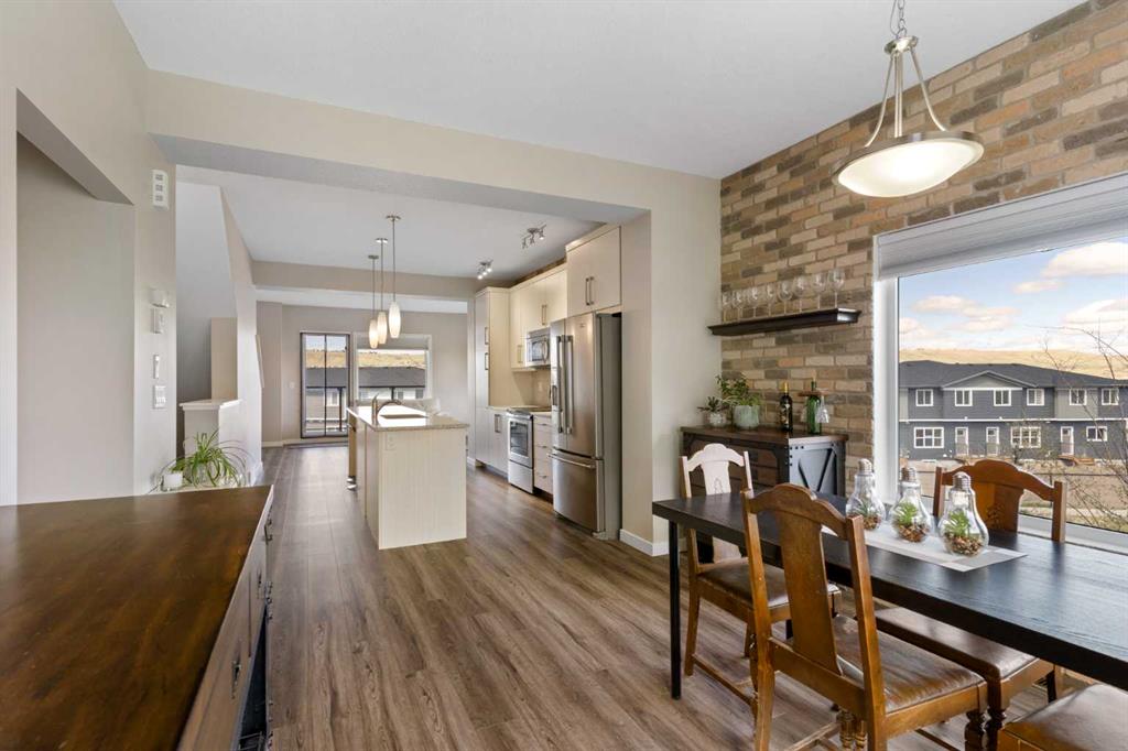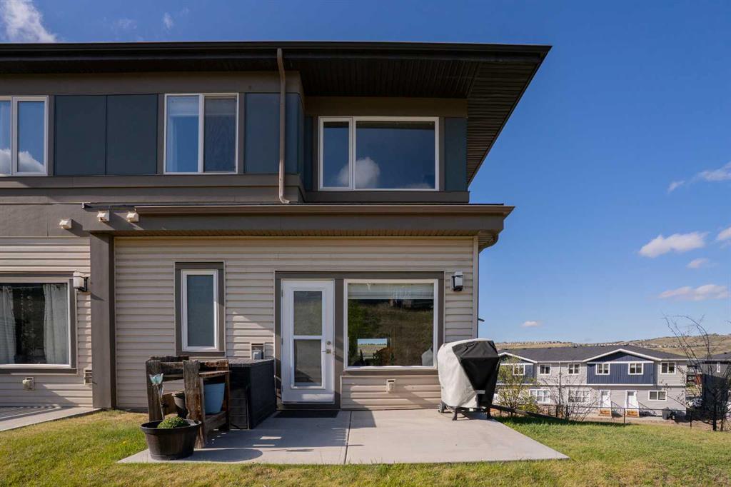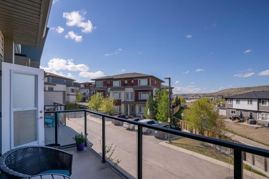 Welcome to this bright and stylish 3-storey corner townhouse in The Rise, backing onto green space for added privacy and natural light. The open-concept main level features a modern kitchen with central island, spacious living and dining areas, brick accent wall, main floor laundry, and A/C rough-in. Enjoy both a front balcony and private rear outdoor space, perfect for relaxing or entertaining. Upstairs offers 3 bedrooms and 2.5 bathrooms, creating one of the most functional layouts in the complex, with elevated views toward Cochrane. The oversized tandem garage comfortably fits two vehicles with extra room for storage. Ideally located close to parks, schools, pathways, and amenities, with quick access to downtown Cochrane, the Jack Tennant Memorial Bridge, Highway 1, and the mountains.