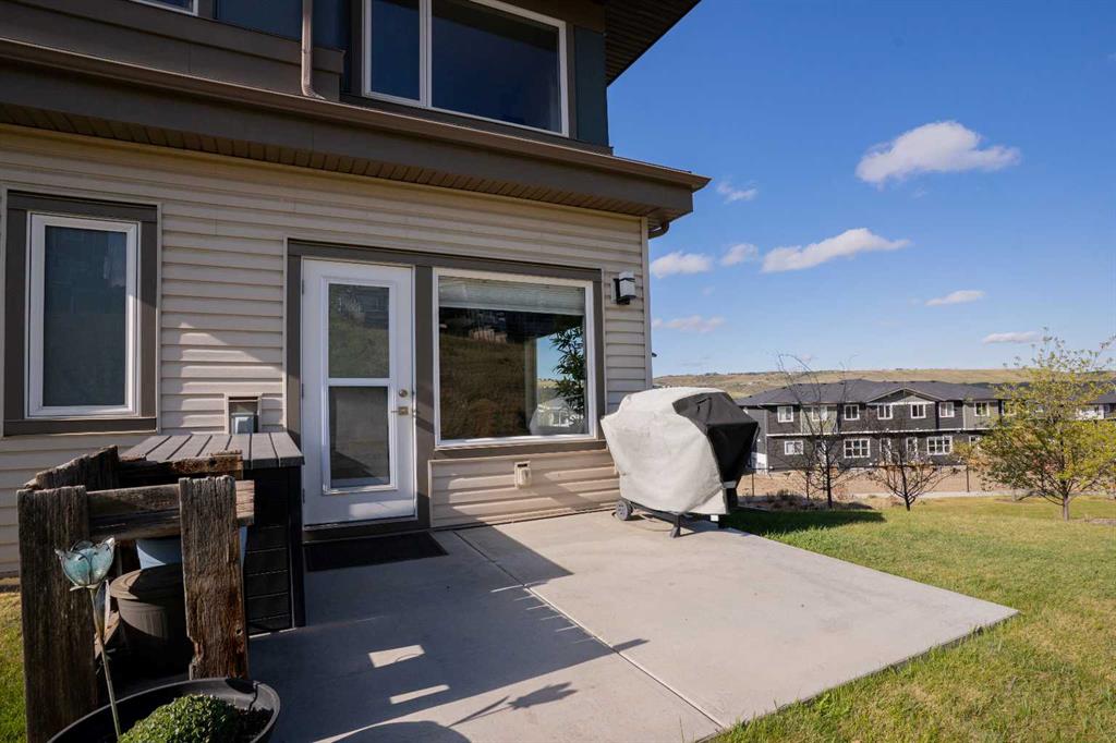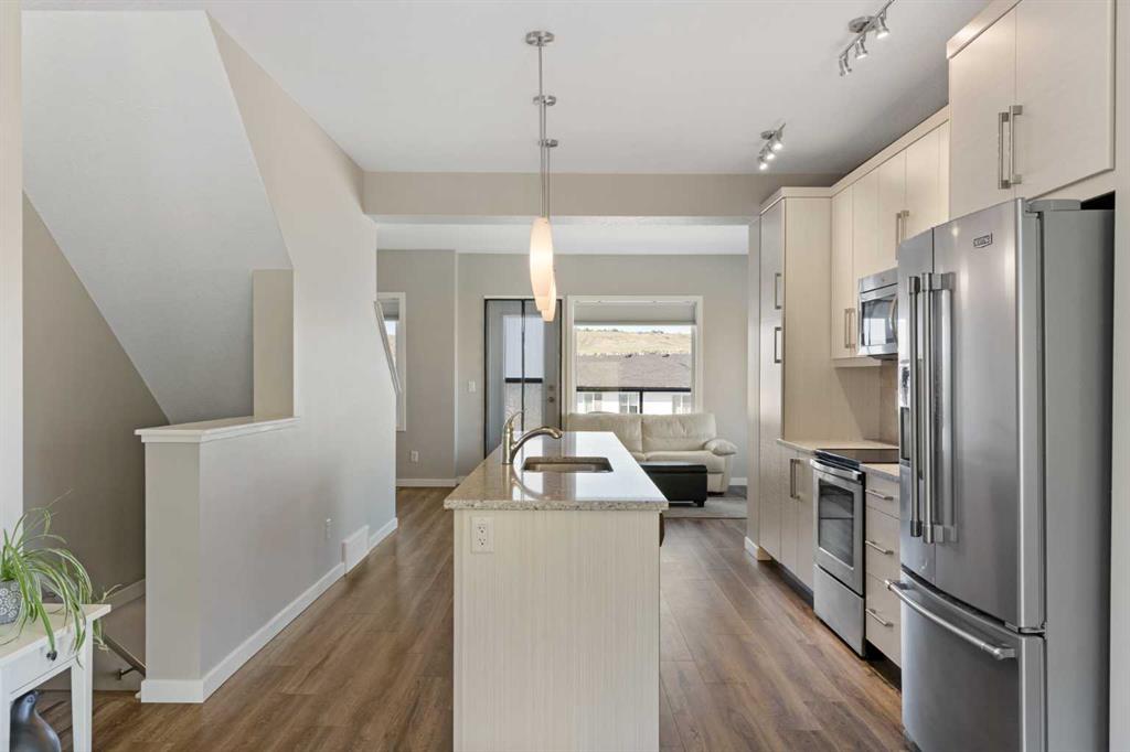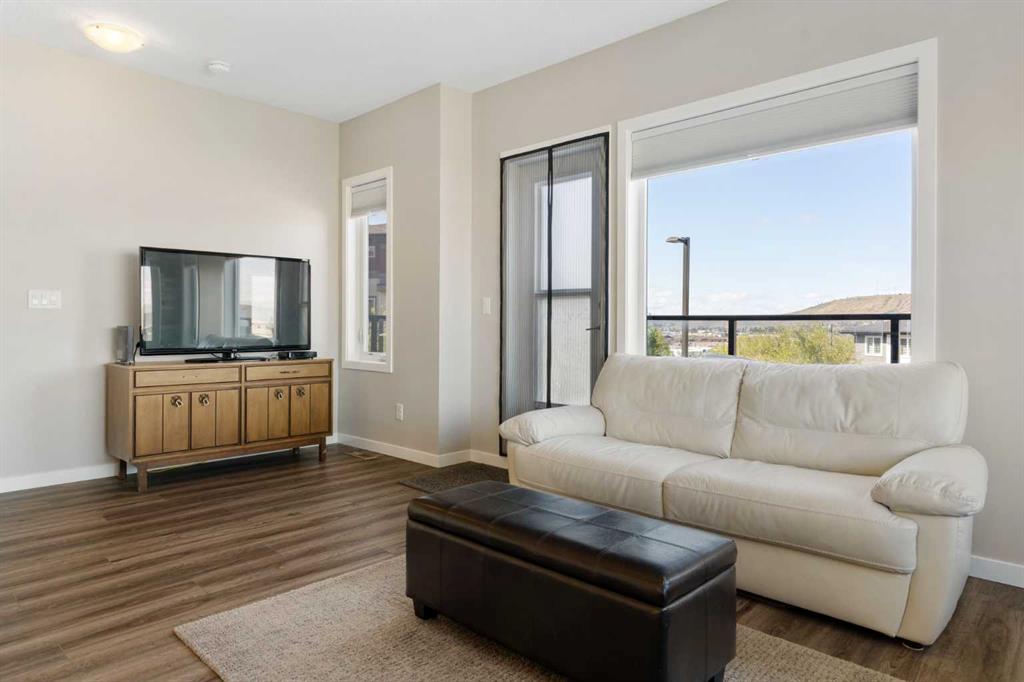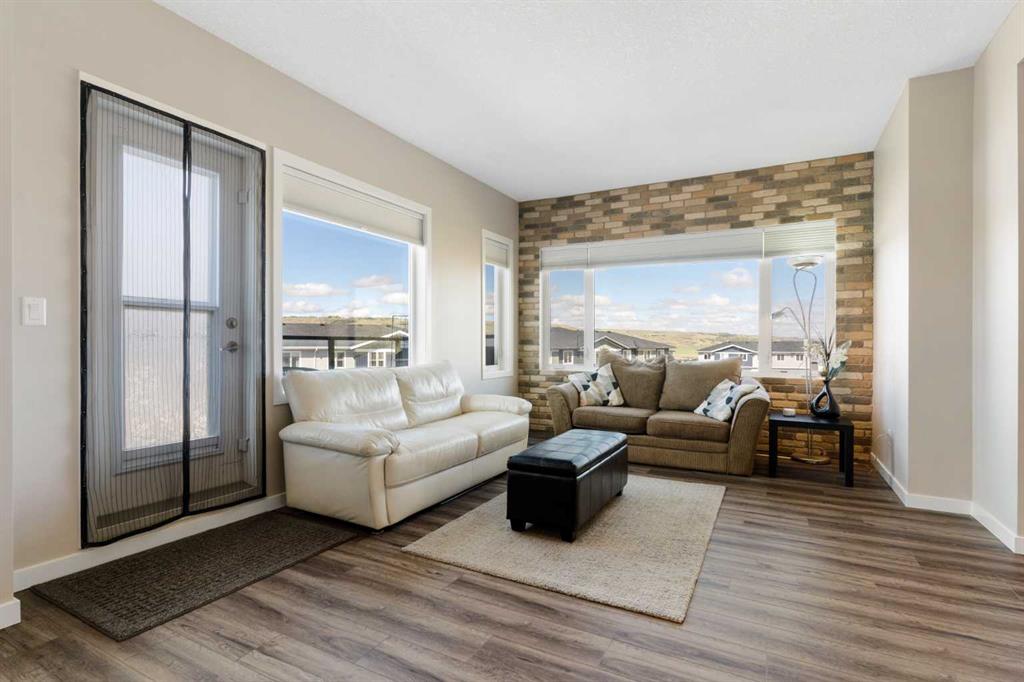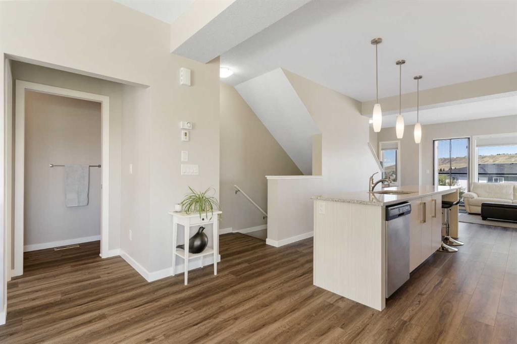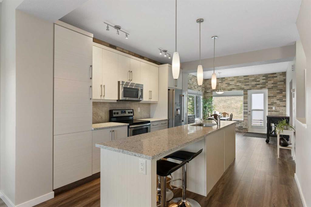Welcome to this bright and stylish 3-storey corner townhouse in The Rise, backing onto green space for added privacy and natural light. The open-concept main level features a modern kitchen with central island, spacious living and dining areas, brick accent wall, main floor laundry, and A/C rough-in. Enjoy both a front balcony and private rear outdoor space, perfect for relaxing or entertaining. Upstairs offers 3 bedrooms and 2.5 bathrooms, creating one of the most functional layouts in the complex, with elevated views toward Cochrane. The oversized tandem garage comfortably fits two vehicles with extra room for storage. Ideally located close to parks, schools, pathways, and amenities, with quick access to downtown Cochrane, the Jack Tennant Memorial Bridge, Highway 1, and the mountains.