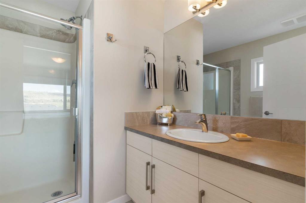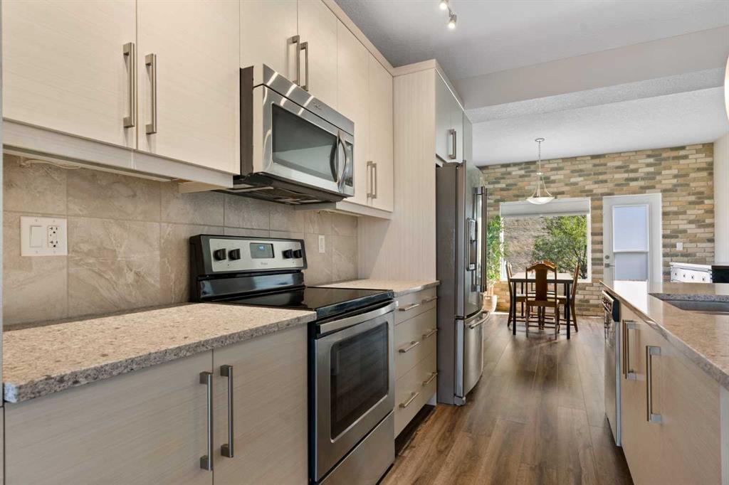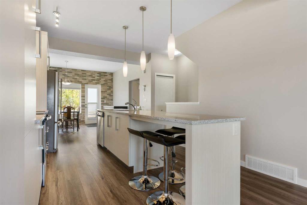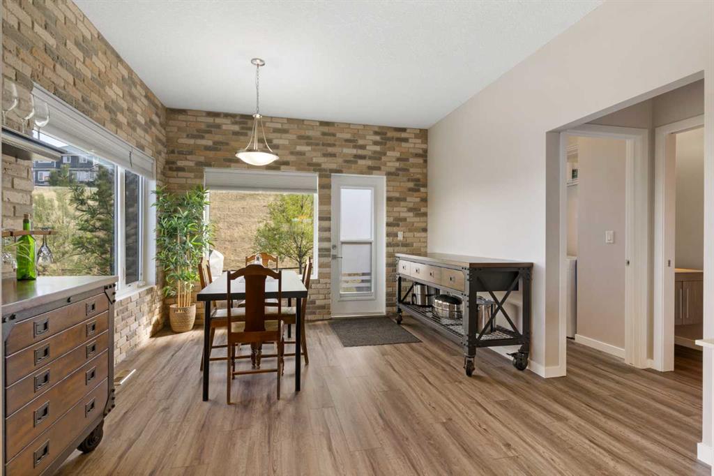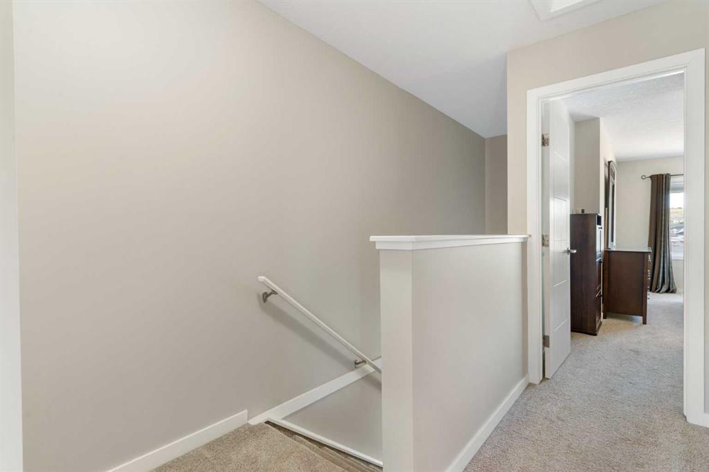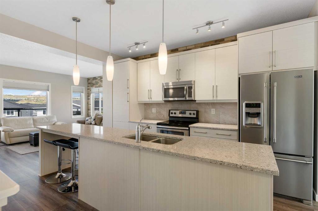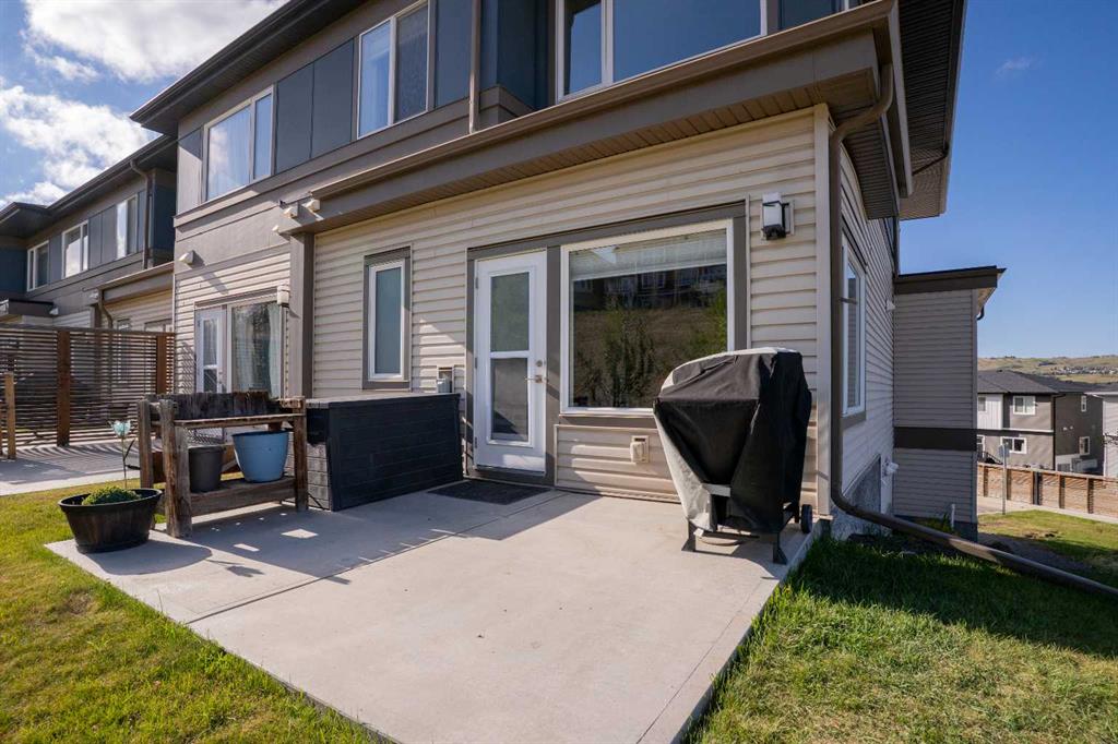 Welcome to this bright and stylish 3-storey corner townhouse in The Rise, backing onto green space for added privacy and natural light. The open-concept main level features a modern kitchen with central island, spacious living and dining areas, brick accent wall, main floor laundry, and A/C rough-in. Enjoy both a front balcony and private rear outdoor space, perfect for relaxing or entertaining. Upstairs offers 3 bedrooms and 2.5 bathrooms, creating one of the most functional layouts in the complex, with elevated views toward Cochrane. The oversized tandem garage comfortably fits two vehicles with extra room for storage. Ideally located close to parks, schools, pathways, and amenities, with quick access to downtown Cochrane, the Jack Tennant Memorial Bridge, Highway 1, and the mountains.