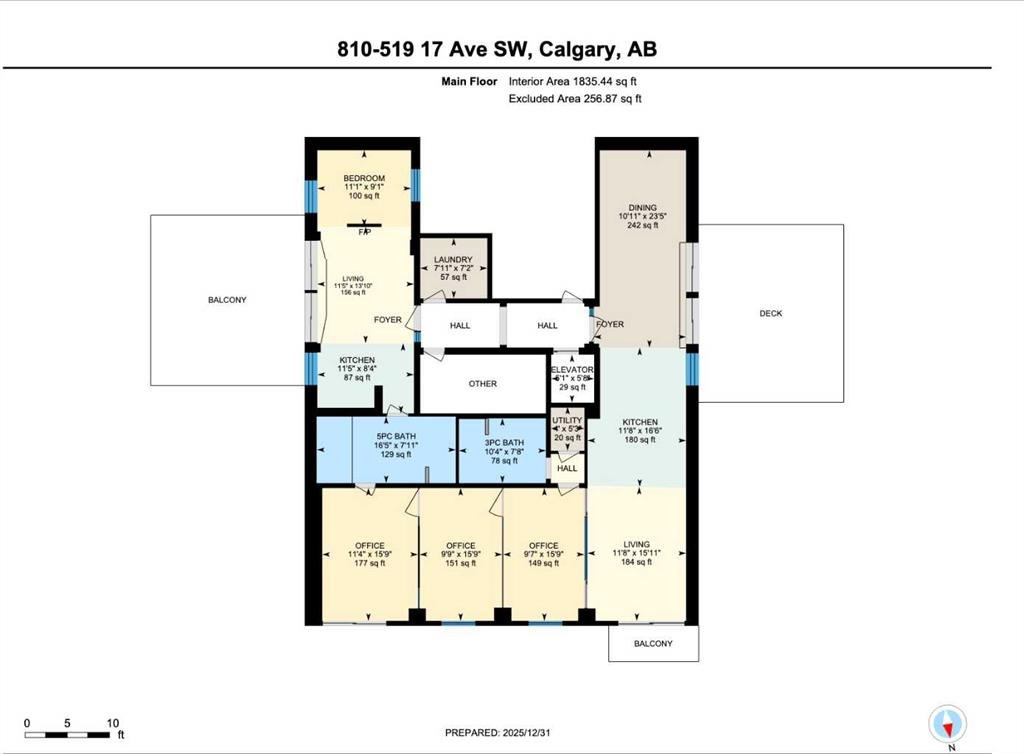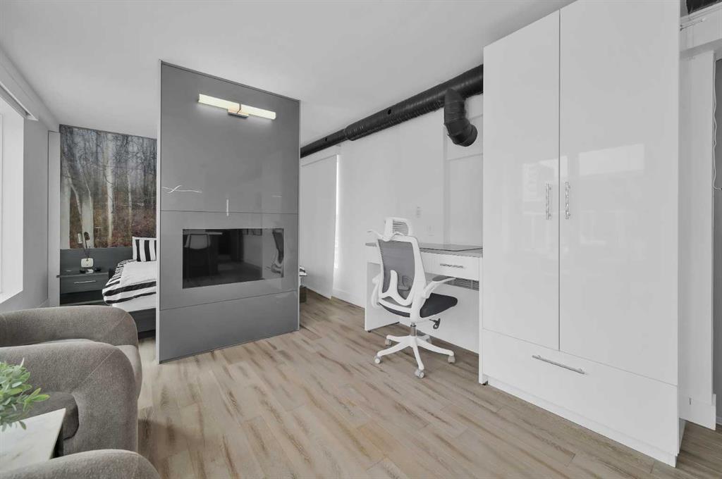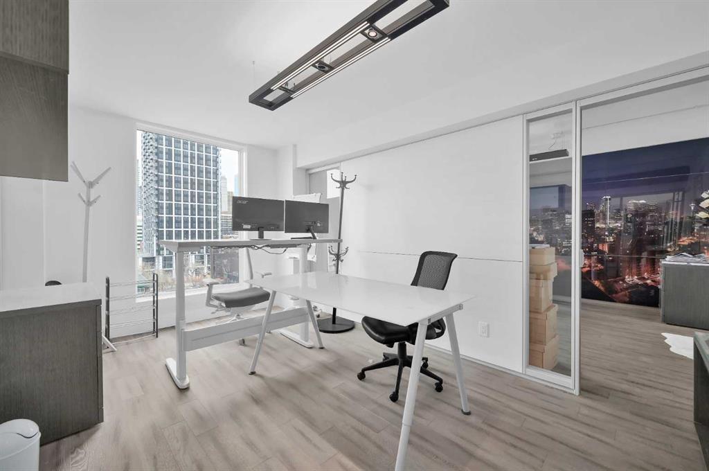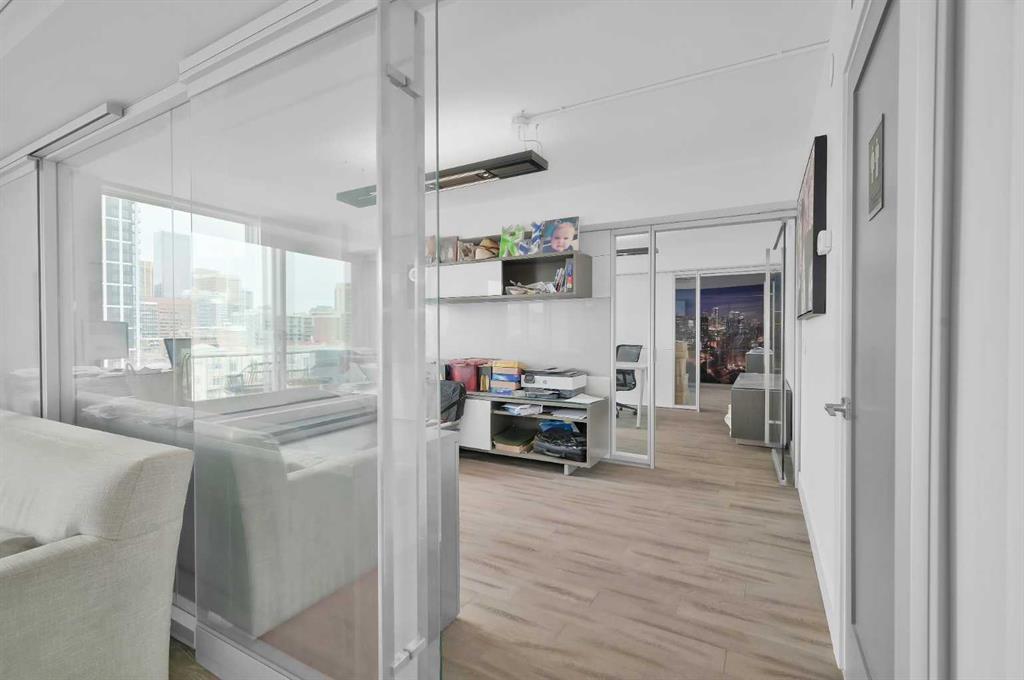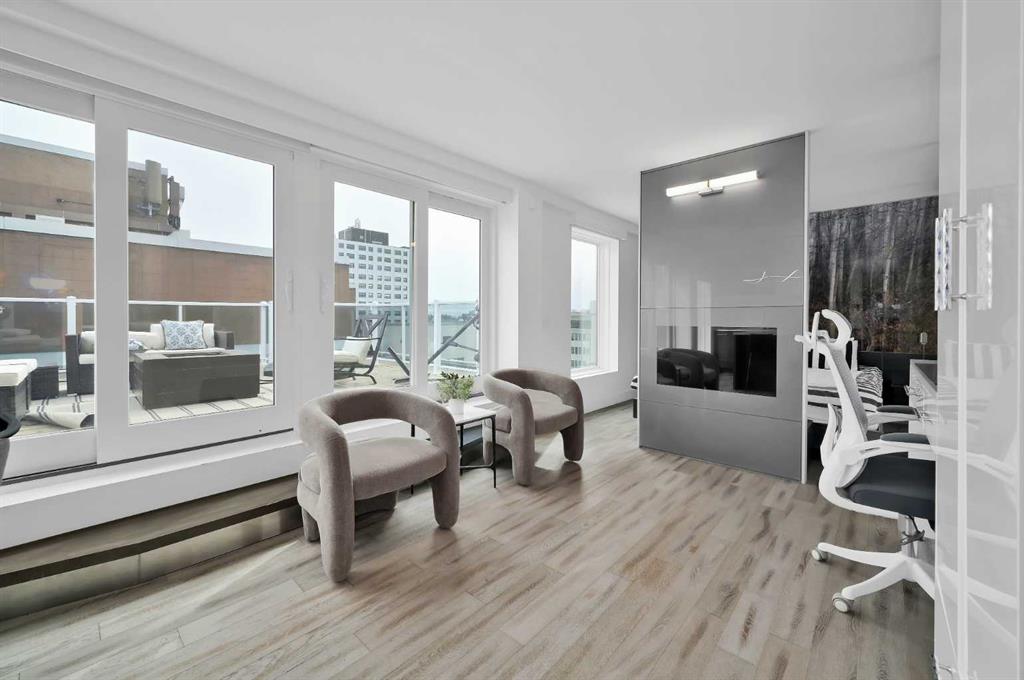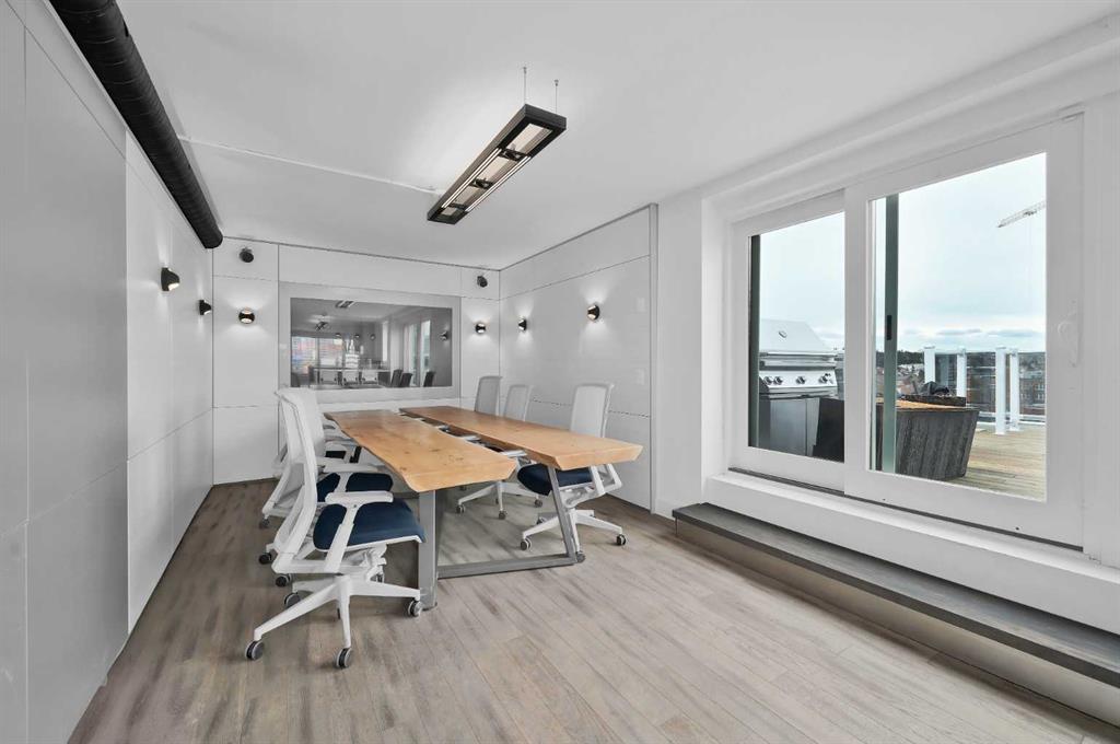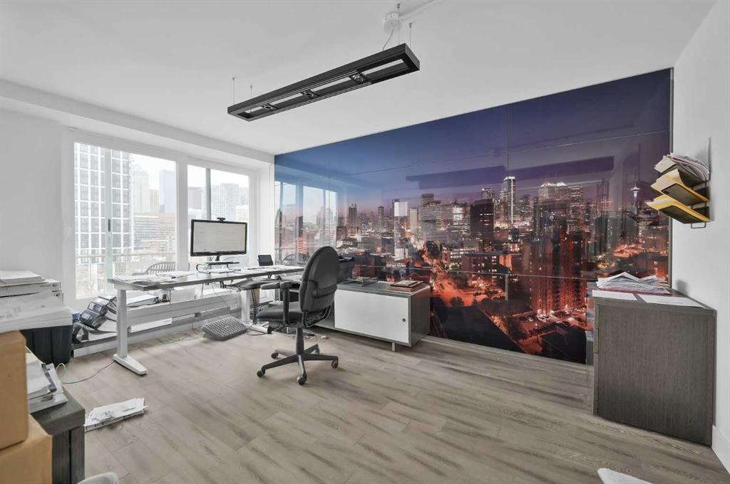 The opposite wing is currently configured for business use with multiple office/flex rooms, 3 piece bathroom , second kitchen, dining area with with walkout access to an additional outdoor patio, and a living/lounge space, with walkout access to a balcony with more city views. The office spaces offer excellent versatility and can easily be converted into bedrooms to suit your needs.