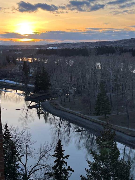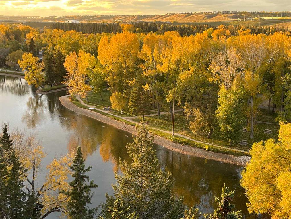 Perched on the 8th floor, this exceptional condo offers **one of the largest floor plans in the building** and showcases truly breathtaking views overlooking Bowness Park and the picturesque Bow River. From vibrant seasonal landscapes to stunning natural light displays and dramatic sunsets, the expansive private balcony provides a front-row seat to it all. Step inside to a generous foyer that welcomes you into a thoughtfully designed open-concept layout. The spacious hallway leads to a bright and airy kitchen featuring expansive countertops, ample cabinetry, and upgraded stainless steel appliances — perfect for everyday living and entertaining alike. The dining area flows seamlessly into the inviting living room, which opens directly onto the oversized private balcony, blending indoor and outdoor living naturally. Tucked just around the corner for added privacy, the large primary bedroom and well-sized second bedroom both offer impressive city views. A 4-piece bathroom with a newer receptacle adds modern functionality, while a substantial in-suite storage room completes this well-appointed home. This well-managed **18+ adult living** complex offers an array of desirable amenities, including a fitness centre, sauna, social room, and rooftop terraces. Enjoy the convenience of inclusive utilities, free common laundry pet-friendly living (with board approval and fee), and immediate access to the scenic pathways, green spaces, and recreational opportunities of Bowness Park and the Bow River. An incredible opportunity to enjoy spacious, low-maintenance living with unmatched views in a highly sought-after location.