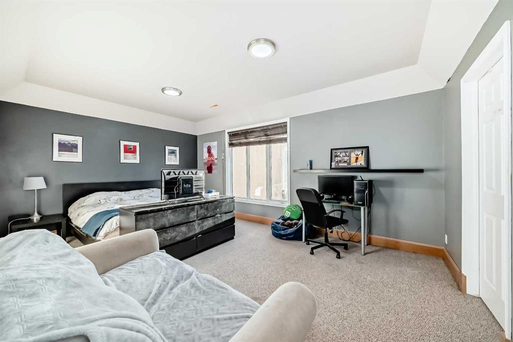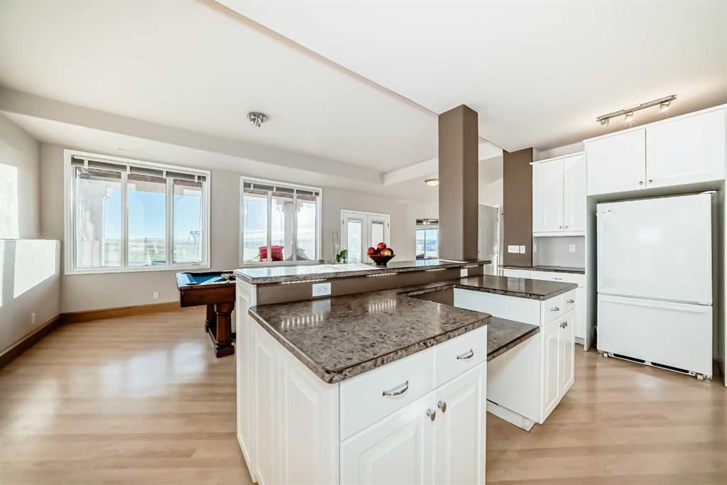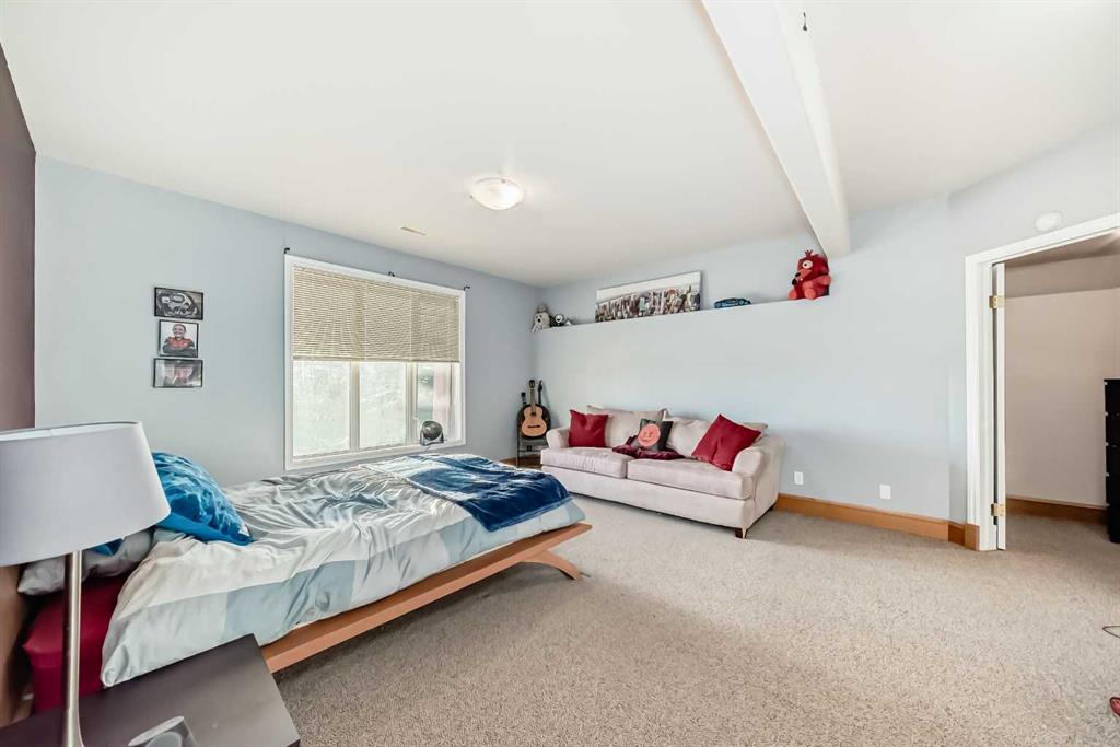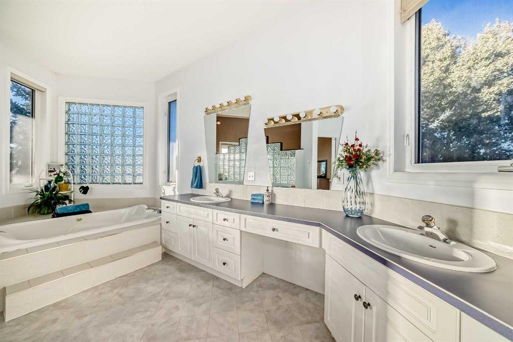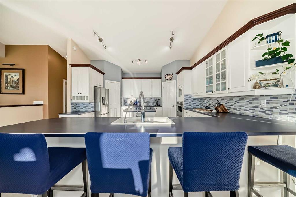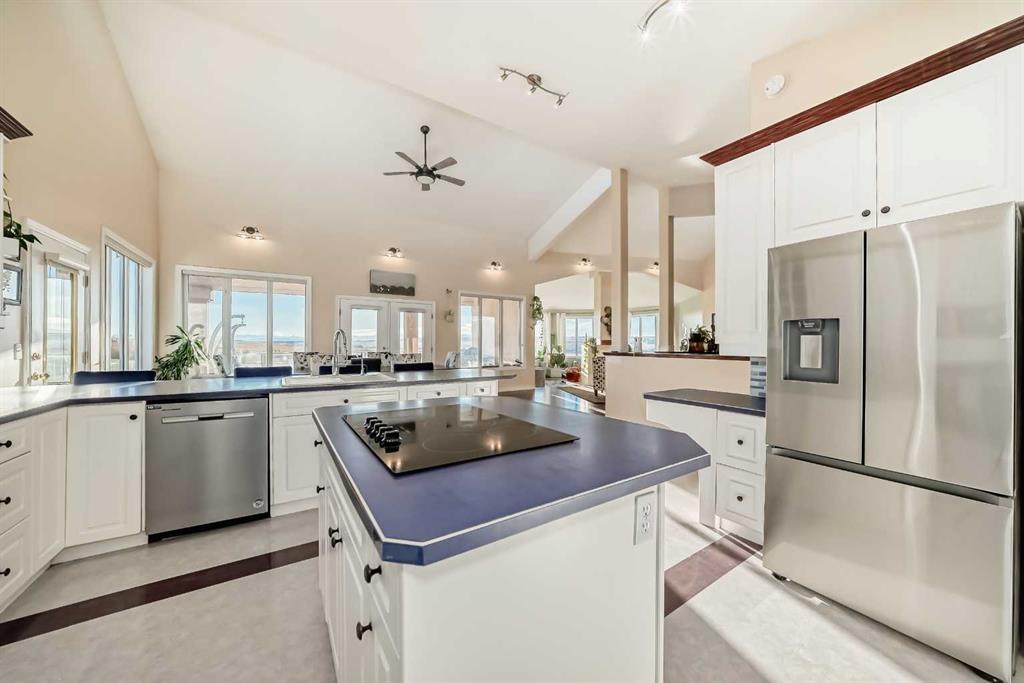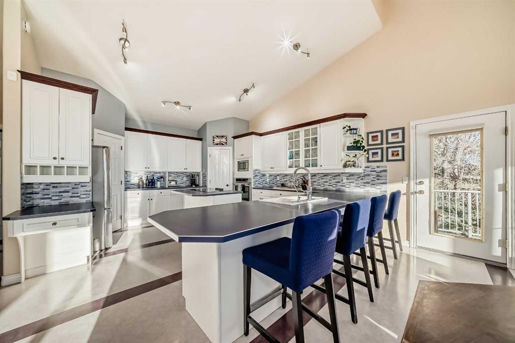 This spacious walkout bungalow, with its vaulted ceilings, is filled with natural light and mountain views from nearly every room. The open-concept main level features soaring ceilings, a cozy double sided gas fireplace, and expansive windows framing the western skyline. The bright kitchen is designed for gathering with a large island, two pantries, breakfast bar seating, and patio doors leading to large deck for effortless indoor-outdoor living. The main floor includes a generous primary suite with a 5-piece ensuite and walk-in closet with its own private deck. There are two additional bedrooms including one with a loft that’s currently used as an office and a full bath. The large laundry/mudroom with sink and cabinets has space for everyone’s stuff including the pet supplies! The walkout basement with infloor heating offers over 2000 sf of developed space and incredible versatility for extended family or independent teens. Featuring a 2-bedroom illegal suite, with full kitchen, family room, and unique bathroom ( door separating sink area from toilet and shower) and private patio access overlooking the pond and rolling landscape. Outdoors, the property is thoughtfully developed with mature trees, a tranquil water feature, and space for kids to explore. Mr and Mrs Duck return every year to swim in the pond! Plenty of wildlife beyond “the deer” including a resident fox (with cubs), bald eagles, and owls. There’s ample room for your hobbies too, an attached double garage with a workshop, plus RV parking and extra driveway space. Fast possession possible.