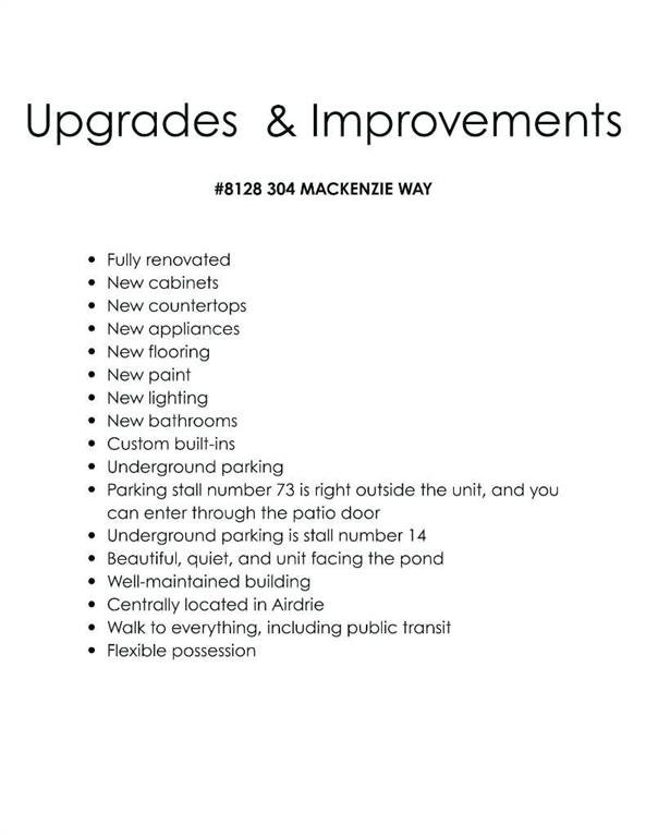 This stunning condo is a rare find — over 1000 sq ft, and beautifully renovated from top to bottom! This unit is set in one of Airdrie’s most peaceful locations, backing onto a serene pond with lots of beautiful nature to obsrve. Inside, every detail has been refreshed: new paint, flooring, trim, light fixtures, knock-down ceilings, and a brand-new kitchen with quartz counters, stylish cabinetry, hidden spice rack, “magic corner” storage, instant hot water tap at the kitchen sink, and all new stainless-steel appliances. Thoughtful touches continue throughout — built-in storage, an extra fridge and freezer, and new washer & dryer. The spacious primary suite offers not one but two walk-in closets with built in storage, and a full ensuite. Enjoy morning coffee or evening sunsets on your large wraparound patio with no neighbours in sight. This well-managed building includes ALL utilities (heat, electricity, water, sewer, garbage, insurance, and reserve fund) — truly worry-free living. Comes with one titled underground stall and one above-ground stall for convenience, as well as a 24 Sq Ft storage cage.