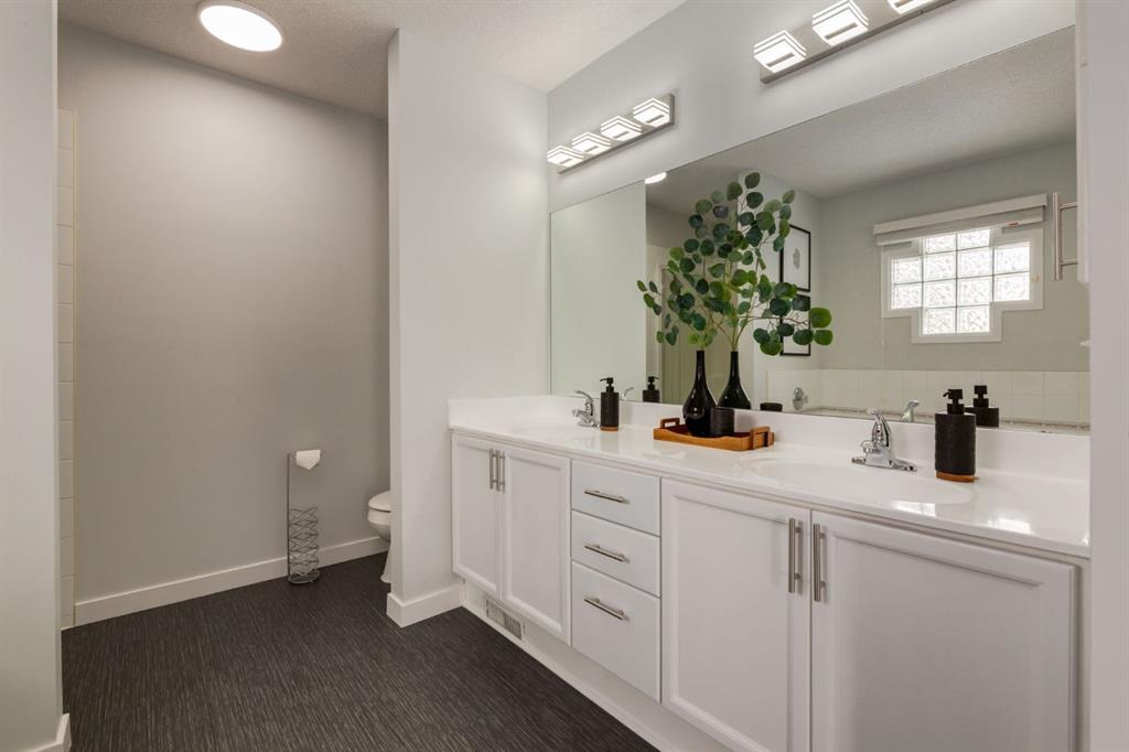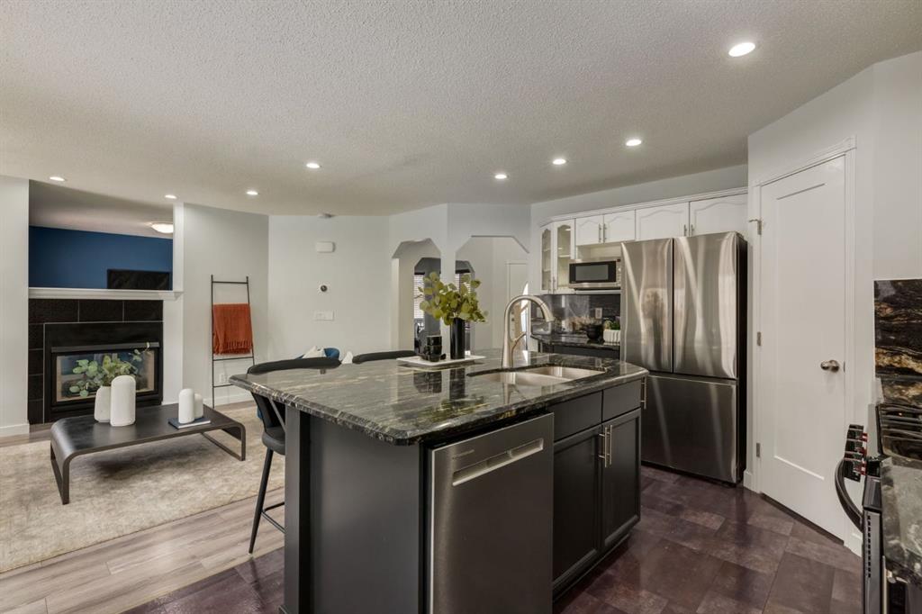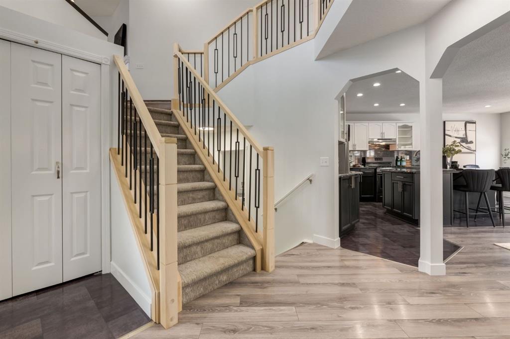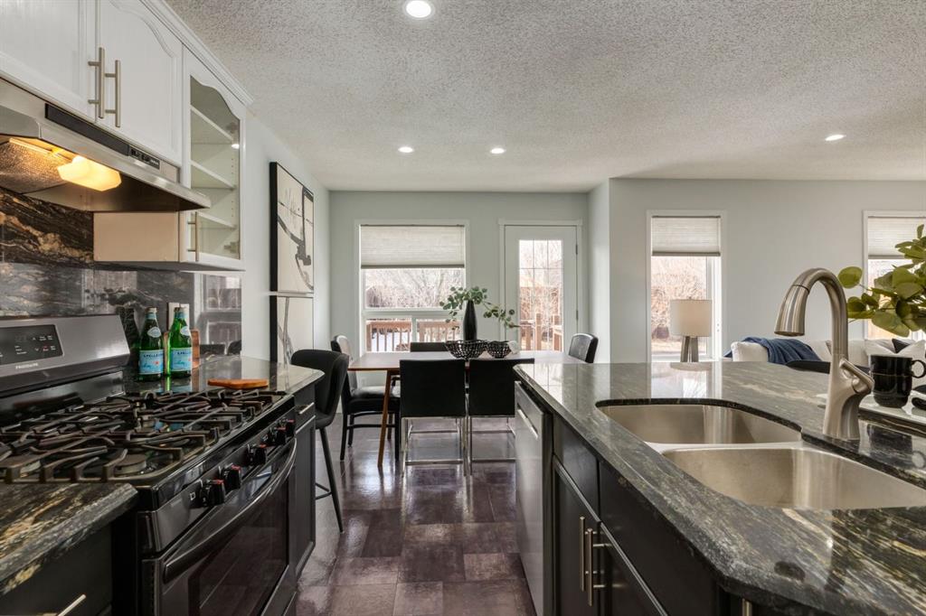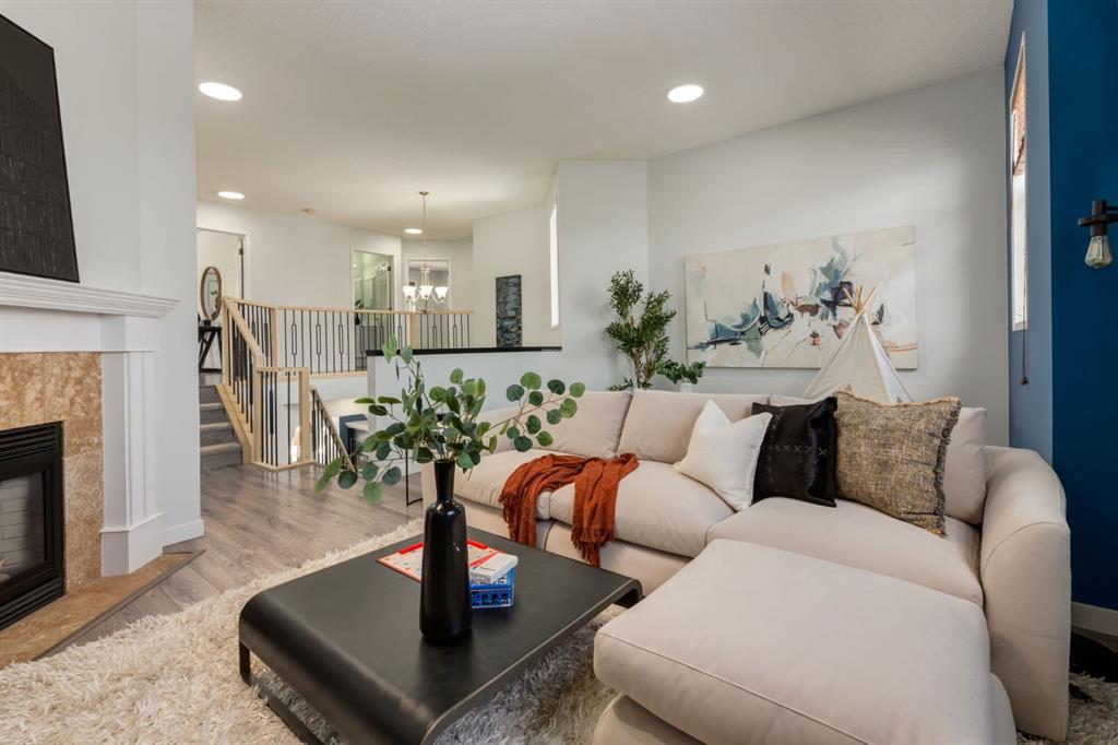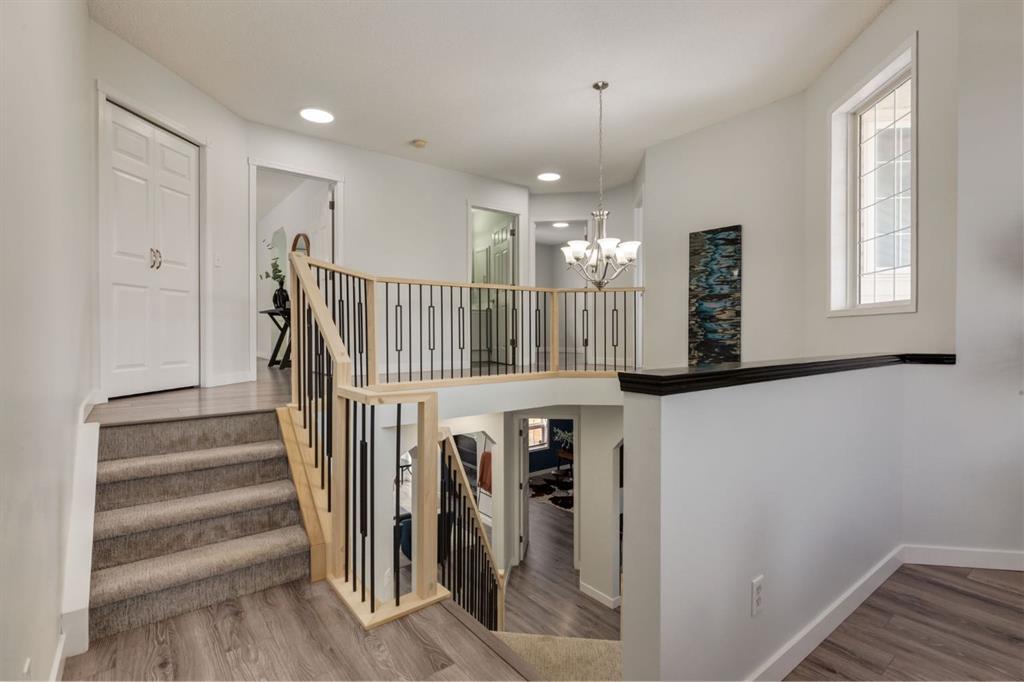 Located on a quiet cul-de-sac in the sought-after community of Hidden Valley this four-bedroom home offers an exceptional blend of privacy, family-friendly living, and tasteful updates. Tucked away from busy traffic, the home provides an unbeatable, peaceful setting where kids can safely play, walk to all levels of schooling, and neighbours connect in a true community atmosphere. As you enter, you are greeted by a spacious entryway with soaring open ceilings, and a beautifully finished metal spindle railing. The open-concept main floor layout provides the perfect place to gather with family and friends and is flooded with natural light through multiple large west facing windows. The large kitchen showcases stainless steel appliances, a gas stove, large kitchen island with bar seating, and a large corner pantry. The kitchen opens to your bright and cheerful living room, which overlooks your enormous backyard, and boasts a cozy two-sided fireplace that is shared with a main floor office. The dining room provides a great amount of space for larger family gatherings and from the main floor you can step outside onto your two-tiered deck to BBQ, relax and unwind in the sunshine in your west facing yard. The backyard is beautifully landscaped with mature trees, has a sprawling lawn space to play in, and comes complete with natural gas hook up, and a hot tub pad with hot tub wiring already in place. The main floor also features a large flex space at the front of the home that could be used as an additional office family room, formal dining room, playroom, or flex space. The main floor is completed by your spacious laundry room, and a sizable powder room. The stairs to upstairs showcase beautiful millwork and black, metal spindles, which are sure to impress. Upstairs boasts a huge bonus room with a stylish accent wall, towering 10.5ft ceilings, a warm fireplace, and affords the perfect place to relax and watch a movie, read a book, or play with your kids. The spacious primary bedroom provides room for king-sized furniture, has large west facing windows, boasts a huge 5-piece bathroom and a sprawling walk-in-closet. Down the hall features 2 additional large bedrooms one of which has the luxury of three large windows. The upstairs is completed with a well-appointed 4 pc bathroom with updated lighting. Downstairs has been fully completed, making this home move-in ready, and features a large media space, an additional bedroom, a den/office, a huge storage room, and a beautiful 3-piece bathrooms with a stand-up shower, stunning tile and elegant vanity. Don’t miss out on the opportunity to own on one of the most peaceful streets in this amazing community. With no through traffic, a new 40yr roof, newer hot water tank, and steps from access to the walking paths, greenspace, and schools, this incredible family home has it all. Live steps from Hidden Valley School (K-3) and Valley Creek School (4-9), and the High School this home makes the perfect place to raise your family.