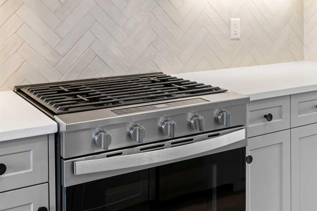 The main level features a bright open-concept layout enhanced by high ceilings and large windows that allow natural light to flow throughout the space. The kitchen is designed to be both stylish and practical, showcasing quartz countertops, a spacious kitchen island, breakfast bar seating, and a gas stove—perfect for everyday cooking or entertaining guests. The seamless connection between the kitchen, dining area, and living room creates a welcoming environment for gatherings and daily living. A convenient two-piece bathroom completes the main floor.