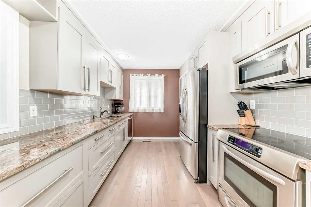 Excellent 3 bedroom up 1/2 duplex with single attached garage, terrific south views of the river valley and C.O.P., situated on an oversized 184 ft deep lot, just steps away from the amazing Silvercreek and Bowmont Park pathway system. This home has been in the family since 1982 and has been lovingly updated over the years, plus features a side entrance to the basement, giving you some options in the future. As you pull up to the property you will notice it’s long double wide driveway, which can accommodate 3 cars, plus additional parking in the oversized single garage. As you enter the main living area you are greeted with hardwood flooring thru-out the entire mainfloor, freshly painted thru-out, plus an updated kitchen that features soft close shaker style cabinets, stainless steel appliances and granite counter tops. The lovely well-lit front living room features a newer cozy electric fireplace with tile surround and a custom mantle, and which leads out to the large 20′ wide south facing deck that features dura decking and amazing views of the river valley and Canada Olympic park. All three bedrooms up are quite large, perfect for roommates or growing families, and the updated main floor bath with tile flooring is perfect to just move in and enjoy. The pantry storage room up is also equipped with laundry rough in’s, in case you are wanting to keep everything all on the mainfloor. The finished basement features a side entrance, roughed in for a dishwasher and additional plumbing, and has direct access to the single garage. The huge sun drenched backyard is perfect for any green thumb / garden enthusiast and kids/pets. Additional upgrades the family has done over the years include; new roof 1 year ago, painted exterior 1 year ago, newer furnace and hot water tank plus all new interior doors and trim. Excellent starter home close to pathways, all levels of schools, the River, Crowfoot Shopping plus great access West to the mountains and only 15 mins to the airport via the Stoney Trail Ring Road. Call your favorite Realtor to view!