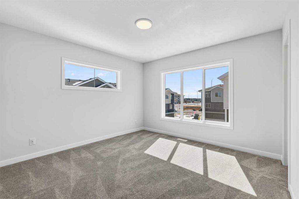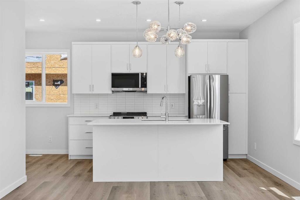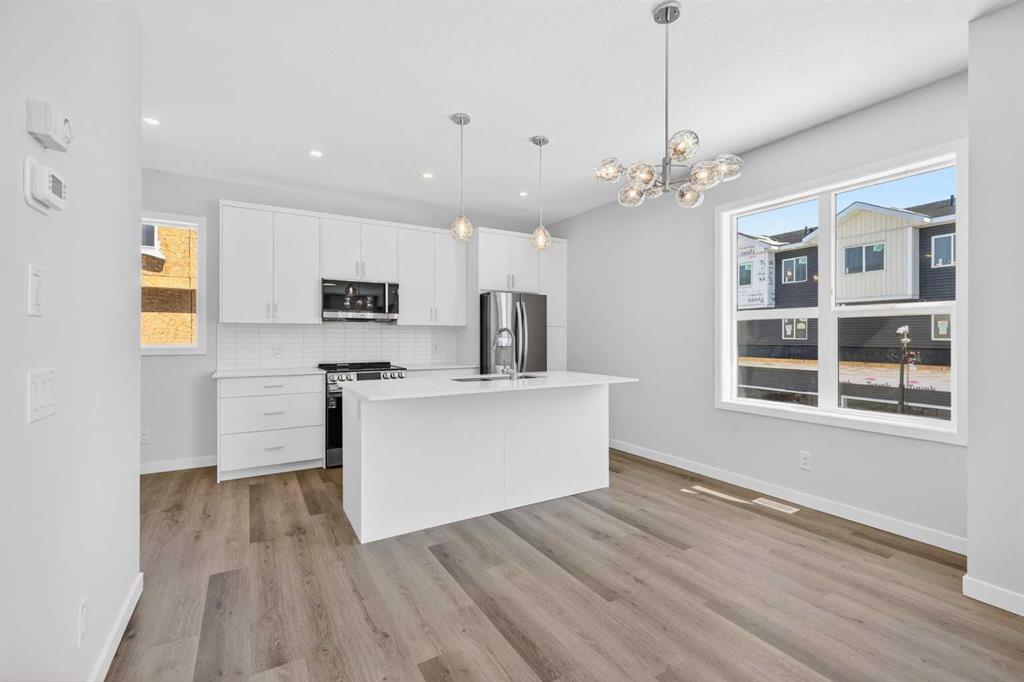 StreetSide proudly presents this exceptionally popular end-unit townhome, where expansive living areas meet modern comforts and sophisticated finishes. The thoughtfully designed floorplan features three spacious upper-level bedrooms and two and a half well appointed bathrooms, complemented by a versatile tech station on the main floor that is perfect for a workspace. The heart of the home is an inviting open-concept main floor, anchored by a large gourmet kitchen featuring a functional breakfast bar for casual dining. This bright living space transitions seamlessly to a private balcony, offering a perfect setting for outdoor relaxation. The interior showcases high end craftsmanship, including modern white slab-style cabinetry with a full bank of drawers for maximum storage. The kitchen is further elevated by polished white quartz countertops and a full suite of premium stainless steel appliances. Durable luxury vinyl flooring runs throughout the primary living areas, while the stairs and upper level are finished with plush carpet over an 8lb underlay for superior comfort. Additional conveniences include an attached double car garage, professionally maintained landscaping, and a lifestyle defined by maintenance free living. Located within Red Embers Point East, this home places you at the heart of the dynamic Redstone neighborhood. Enjoy the ease of a convenient location with quick access to major routes, including Stoney Trail, ensuring you are never far from the city’s best. The community is strategically positioned near future commercial developments, promising shops, services, dining, and entertainment options just moments from your doorstep.