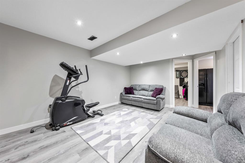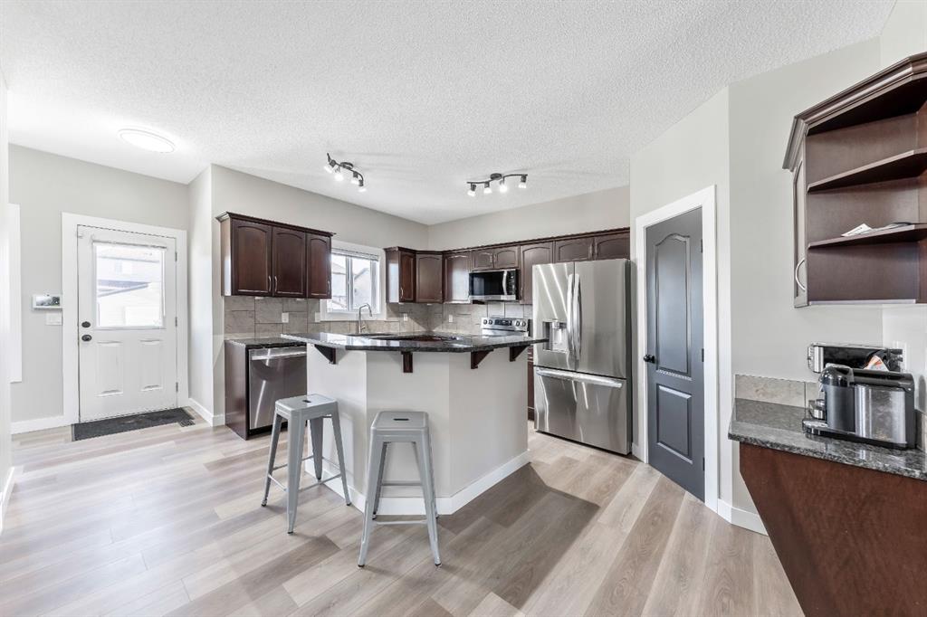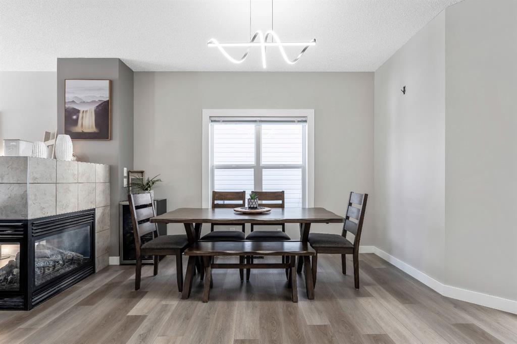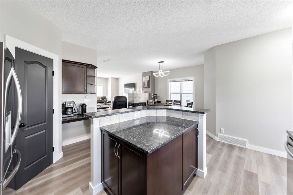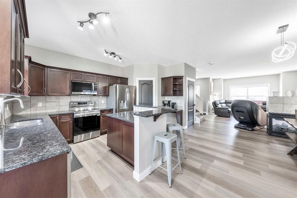 This thoughtfully designed home offers nearly 2,350 square feet of fully developed living space and is ideally located on a quiet street in the family-friendly community of Cimarron. Upon entry, you’re welcomed by soaring 9’ ceilings, a spacious front foyer, gleaming new flooring, and stylish updated light fixtures. The inviting front living room is filled with natural light and features a three-sided fireplace that adds warmth and ambiance. Adjacent is the bright dining area. This seamlessly connects to the chef-inspired kitchen, complete with rich espresso cabinetry, gorgeous granite countertops, new stainless steel appliances, a tile backsplash, and a convenient corner pantry. This level also includes a tucked-away powder room and a rear mudroom area with direct access to the backyard—perfect for entertaining with a large deck, raised garden beds, and a carport. Upstairs, you’ll find two generously sized bedrooms, a full 4-piece bathroom, and an expansive primary retreat. The primary suite is a true sanctuary, offering a large walk-in closet and a private 4-piece ensuite. The fully finished lower level expands your living space with a large rec room, a fourth bedroom, a 4-piece bathroom, a dedicated office, and a laundry room. Ideally located within walking distance to schools, parks, pathways, shopping, and professional services, this home offers both comfort and convenience. Schedule your private showing or view the virtual tour today.