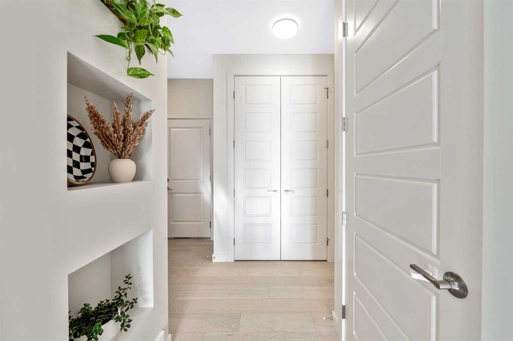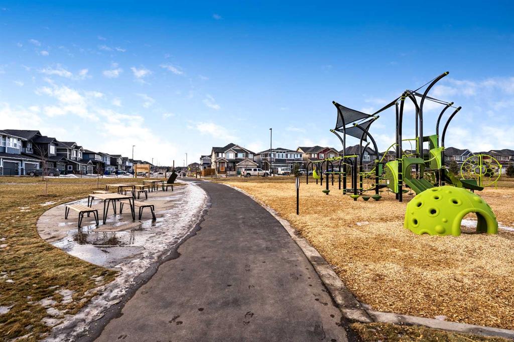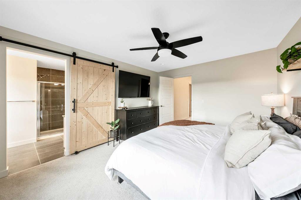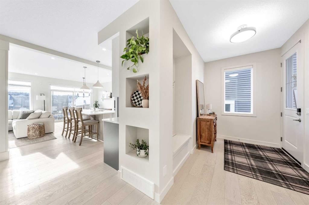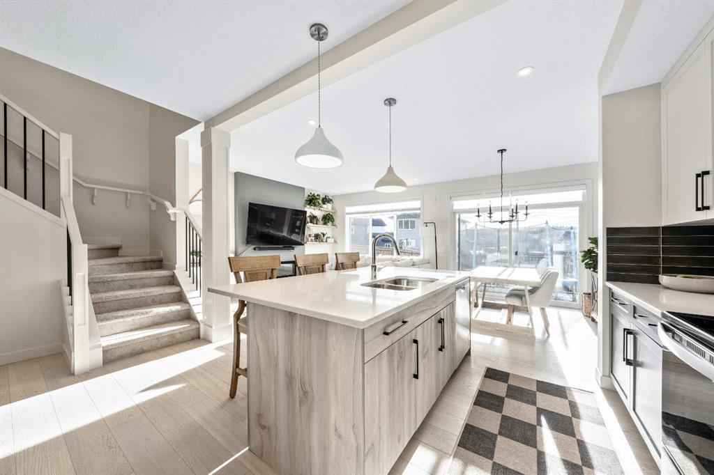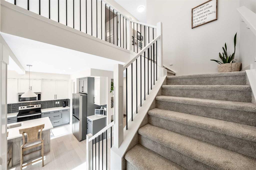 Situated on a quiet street in the centrally located community of Greystone—just steps away from a park and playground—this beautifully upgraded home has show-stopper curb appeal, features a sun-filled, fully fenced south-facing backyard, ideal for both entertaining and everyday living. Thoughtfully designed with an open, modern layout, this 3-bedroom, 2.5-bath home offers over 1,762 sq. ft. of stylish living space and showcases numerous premium upgrades throughout. The main floor makes an immediate impression with an elegant 8’ glazed front door, 9’ ceilings, oversized windows, and refined 8’ interior doors. Engineered hardwood flooring flows seamlessly through the foyer, hallway, great room, kitchen, and dining nook, creating a warm and cohesive atmosphere. The kitchen is a true showpiece, featuring a large single-level 7’ entertainment island with breakfast bar, quartz countertops, and a spacious walk-in pantry with 8’ French doors. Additional highlights include 42” upper cabinetry with dropped bulkhead, soft-close doors and drawers, dedicated pots-and-pans storage, and a full stainless steel appliance package, including a refrigerator, smooth-top electric range, microwave/hood fan, and built-in dishwasher. The bright and inviting great room and dining area are flooded with natural light from oversized windows and an 8’ wide sliding patio door, while the striking Napoleon Entice fireplace adds both style and warmth—perfect for relaxing evenings or hosting guests. Upstairs, the primary suite offers a private retreat complete with a well-appointed 4-piece ensuite featuring dual quartz vanities with undermount sinks, an oversized 5’ x 3’ shower, ceramic tile flooring, and a private water closet with a window. A generous walk-in closet is conveniently accessed through the ensuite. The upper level is completed by a spacious front bonus room, two additional well-sized bedrooms with ample closet space, a full main bathroom with quartz countertops and tile flooring, and a convenient second-floor laundry room finished with tile. The unfinished basement features 9’ ceilings, providing an excellent opportunity for future development and allowing the new owners to create a space perfectly tailored to their needs—a true blank canvas. Bright, modern, and ideally located in a family-friendly community, this home offers exceptional value and versatility and truly checks all the boxes.