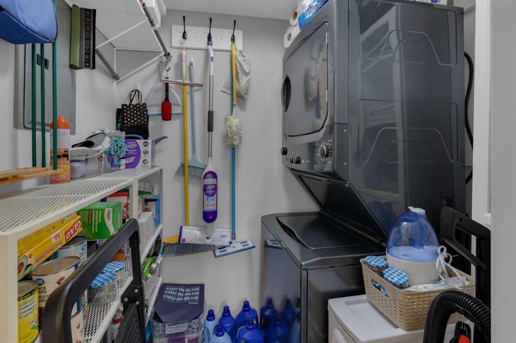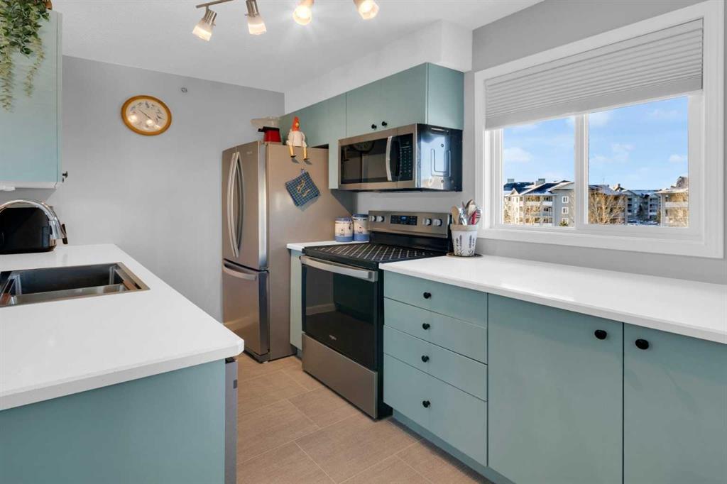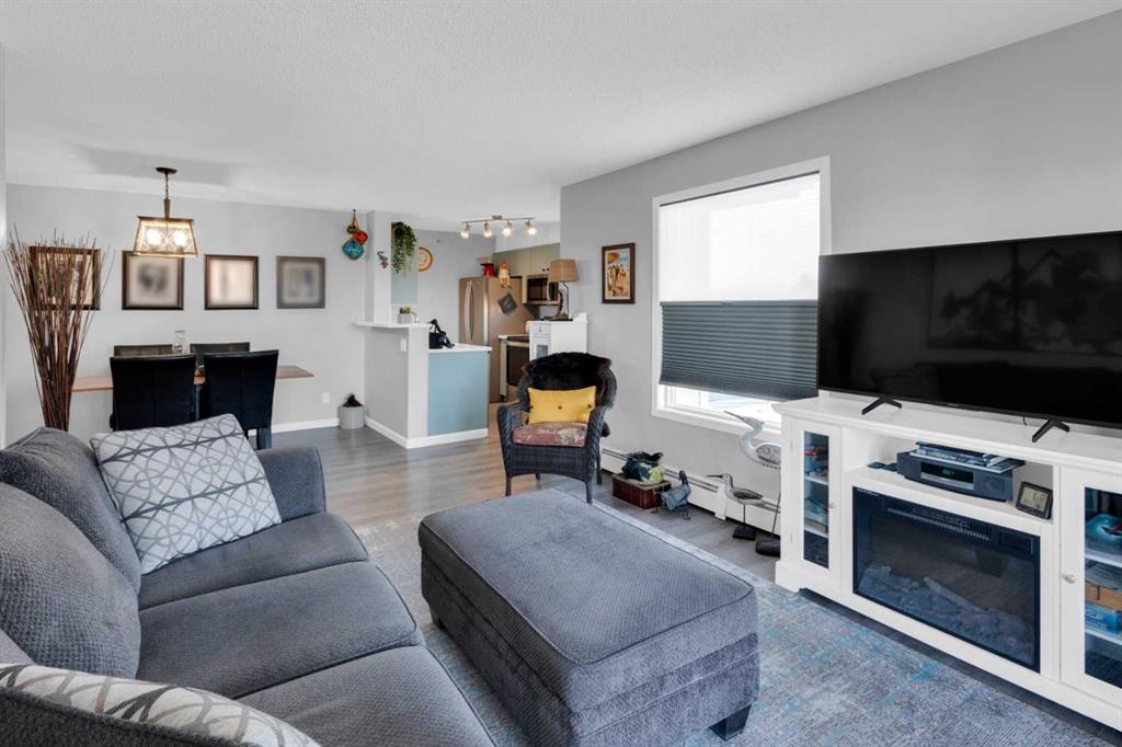 Welcome to MacKenzie Pointe, a well-maintained condo complex ideally located in the heart of Airdrie. This updated top-floor corner, 2-bedroom, 1-bathroom unit offers exceptional privacy with no neighbours above and only one shared wall. Enjoy a walkable lifestyle just steps from shopping, restaurants, health services, and the pathways and activities of Nose Creek Park. Inside, the bright corner layout creates an open, welcoming feel. The kitchen features contemporary coloured cabinetry and stainless steel appliances (2022), including a convection oven with air-fryer function, dishwasher, microwave with hood fan, and a refrigerator with bottom-drawer freezer. A farmhouse sink with pull-down faucet adds both style and everyday practicality. Recent updates include a new washer and dryer (2025), updated switch plates, upgraded lighting, and ceiling fans in both bedrooms. Foil-lined sunshades in the kitchen and living room improve year-round comfort, while mirrored closet doors enhance light and storage. The bathroom features a professionally refinished bathtub that’s easier to clean. Step outside to a large two-sided balcony, perfect for relaxing or enjoying evening sunsets. The unit includes titled, heated underground parking located near the elevator, complete with a lockable storage area. Condo fees conveniently cover electricity, heat, water, sewer, and waste removal. A rare combination of location, privacy, and thoughtful updates within MacKenzie Pointe — this is condo living done right.