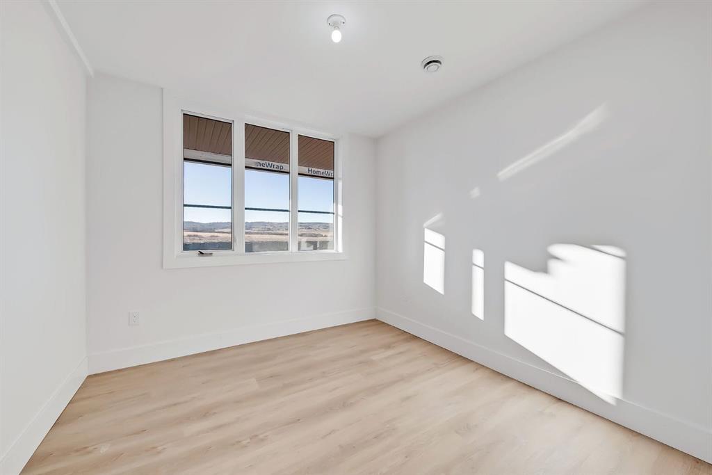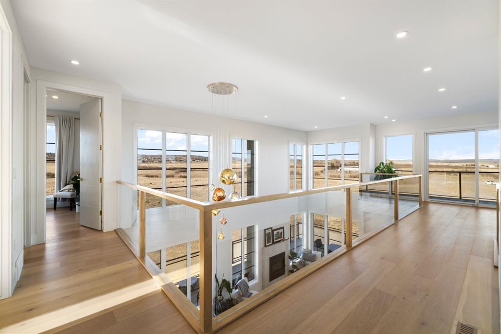 Upstairs, an open-to-below walkway enhances the sense of space while showcasing the home’s architectural design and scenery. This level includes three well-sized bedrooms, including a luxurious primary retreat with stunning mountain views, a walk-in closet, and a spa-inspired ensuite featuring a stand-up shower with blue tile and gold fixtures, double vanities, and a soaker tub. Additional bedrooms are complemented by a versatile flex space overlooking a serene patio, offering the perfect vantage point to take in Foothills sunsets.
