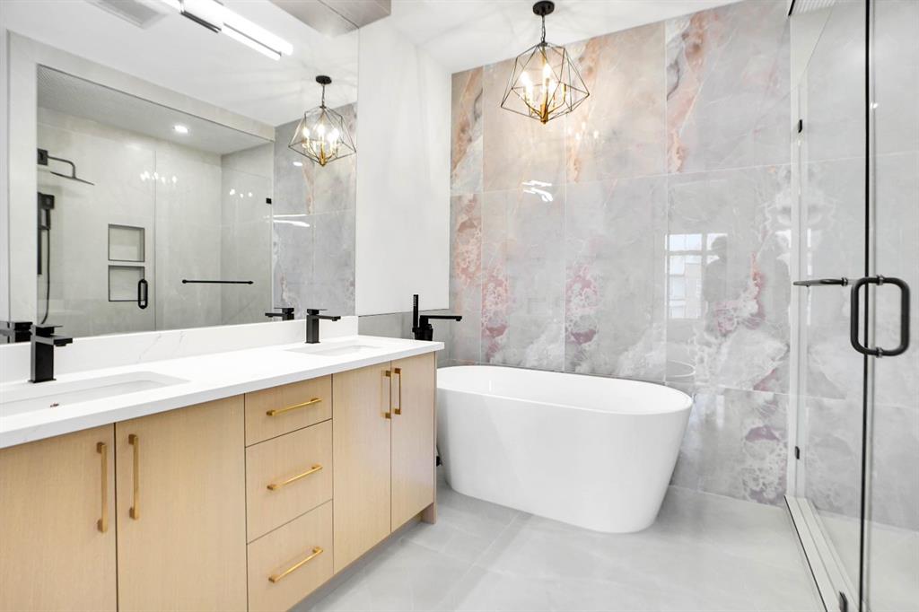 Upstairs, a spa-like primary suite with walk-in closet, dual sinks, freestanding tub, and glass custom shower, plus two additional bedrooms and full bath.