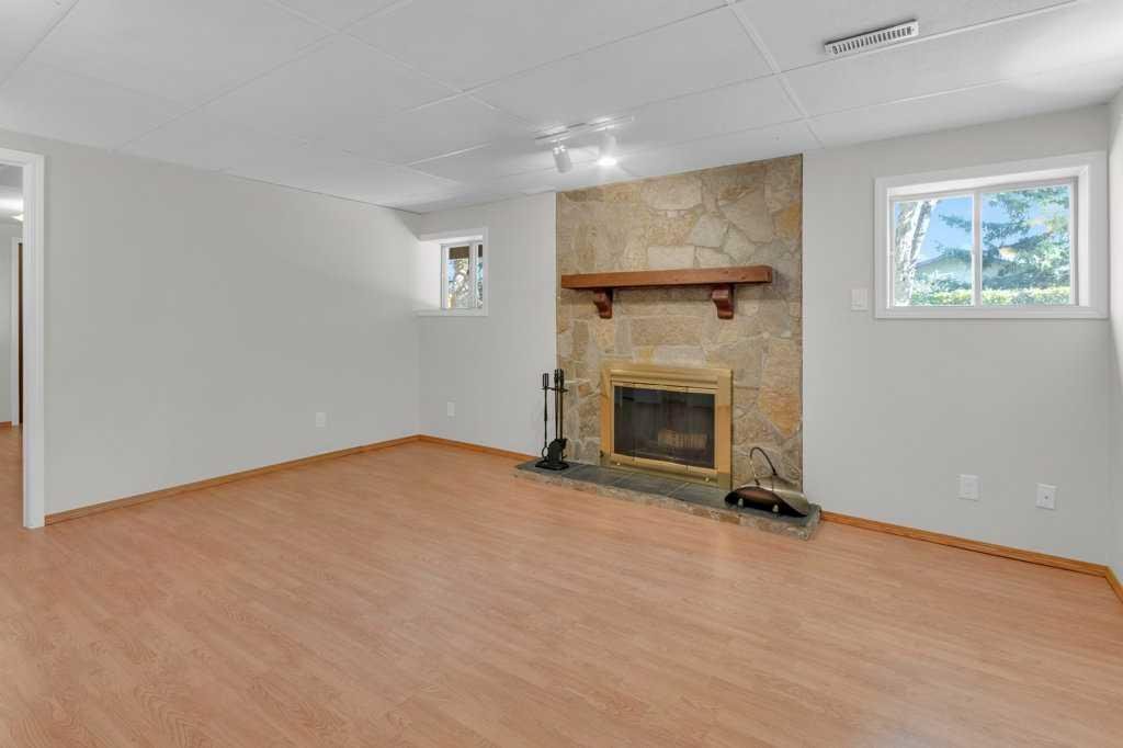 Downstairs, the fully developed basement offers flexible living options, including a potential for a nanny with its private bedroom and ensuite bath. The expansive recreation room is filled with light and features a second stone fireplace, perfect for cozy family evenings. A dedicated laundry area includes a washer, dryer, and a utility sink, with plenty of storage space throughout.