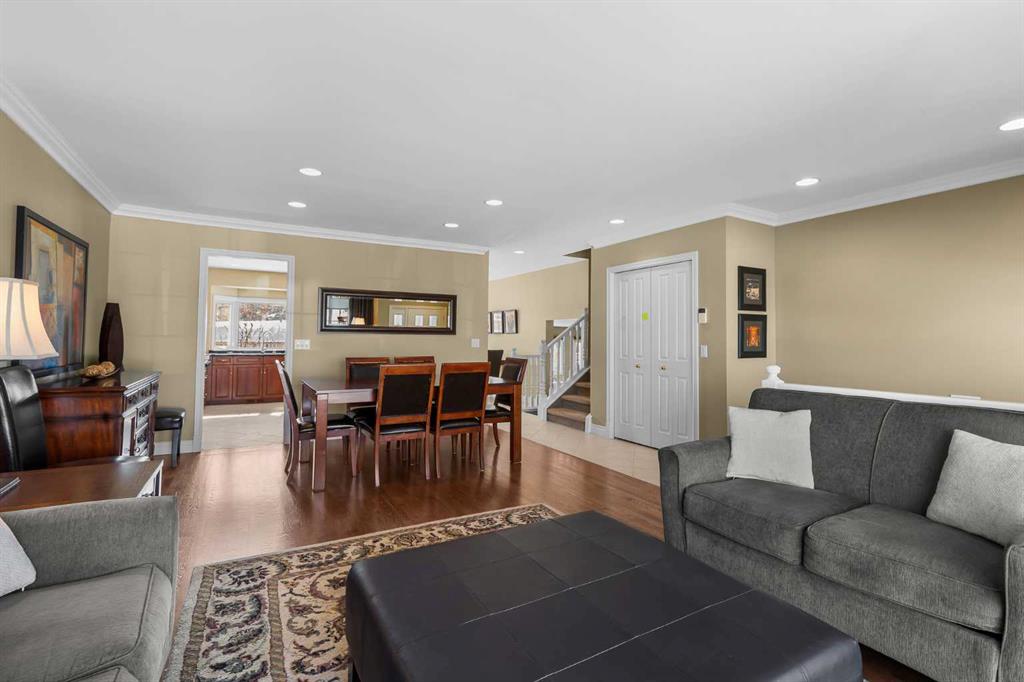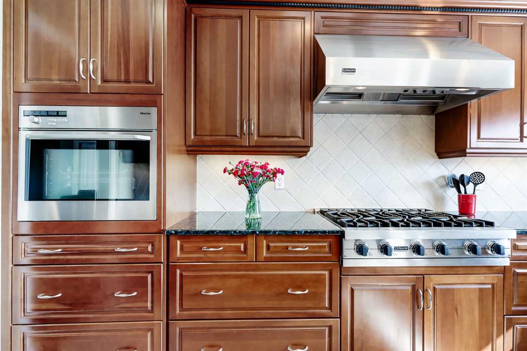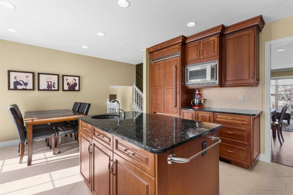 BOASTING 1924 SQ. FEET ON THREE LEVELS plus further basement development this lovingly cared for and thoughtfully upgraded split-style home offers comfort, quality craftsmanship, and an exceptional location. The bright and inviting front living room is filled with natural light and flows seamlessly into the dining area, creating a warm and functional space for everyday living as well as entertaining guests. The beautifully renovated kitchen has been expanded to include a large island, providing a more open and efficient layout. It showcases rich cherry wood cabinetry, elegant granite countertops, and an impressive collection of high-end appliances including Viking, Miele, and Dacor. Cooking enthusiasts will appreciate the powerful 650 CFM hood fan system, professionally interlocked to the furnace and make-up air fans for optimal ventilation. The upper level features a generous primary bedroom retreat complete with a renovated ensuite highlighted by an oversized shower enclosure. Two additional well-sized bedrooms provide comfortable space for family or guests, while the renovated main family bathroom offers modern finishes and functionality. The third level adds even more versatile living space, boasting a spacious family room with large, bright windows that fill the area with natural light. This level also includes a fourth bedroom/den/laundry room and an upgraded two-piece powder room, making it ideal for guests, teenagers, or a private work-from-home setup. The developed basement provides additional flexible space perfect for a home office, hobby area, or recreation room. Numerous key upgrades have been completed throughout the home, including replacement of all windows with triple-pane units where possible and double-pane elsewhere, along with updated front and garden doors. Hardwood flooring adds warmth and character to the living and dining rooms, while heated tile floors provide comfort in select areas of the home. Attic insulation was upgraded with blown-in insulation in 2016, and the roof shingles were replaced with durable 30-year shingles in 2019. The oversized front-attached garage is insulated and drywalled, offering excellent storage and workspace potential. Outside, the fully fenced and beautifully landscaped backyard provides a peaceful and private retreat, highlighted by a stunning mature weeping birch tree, irrigation system and backs onto a large green space for added privacy and open views. Ideally located with excellent access to schools, shopping, city transit, and the expansive pathways and natural beauty of Nose Hill Park, this property represents a wonderful opportunity to own a meticulously maintained and extensively upgraded home in a highly desirable setting.
