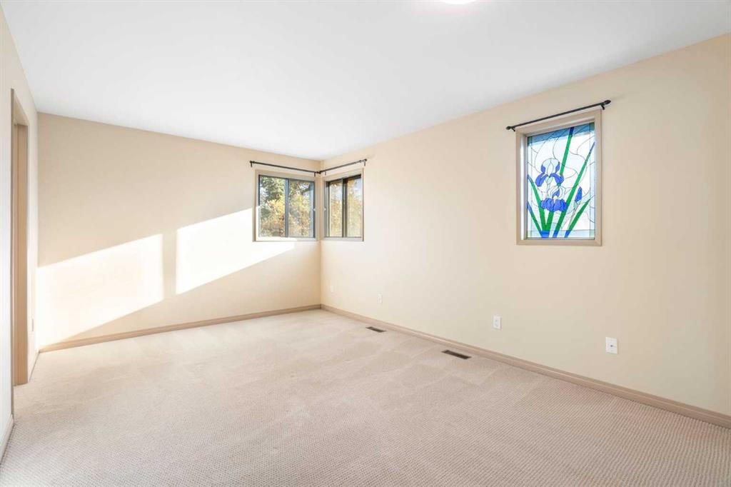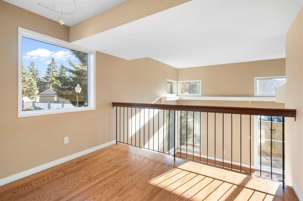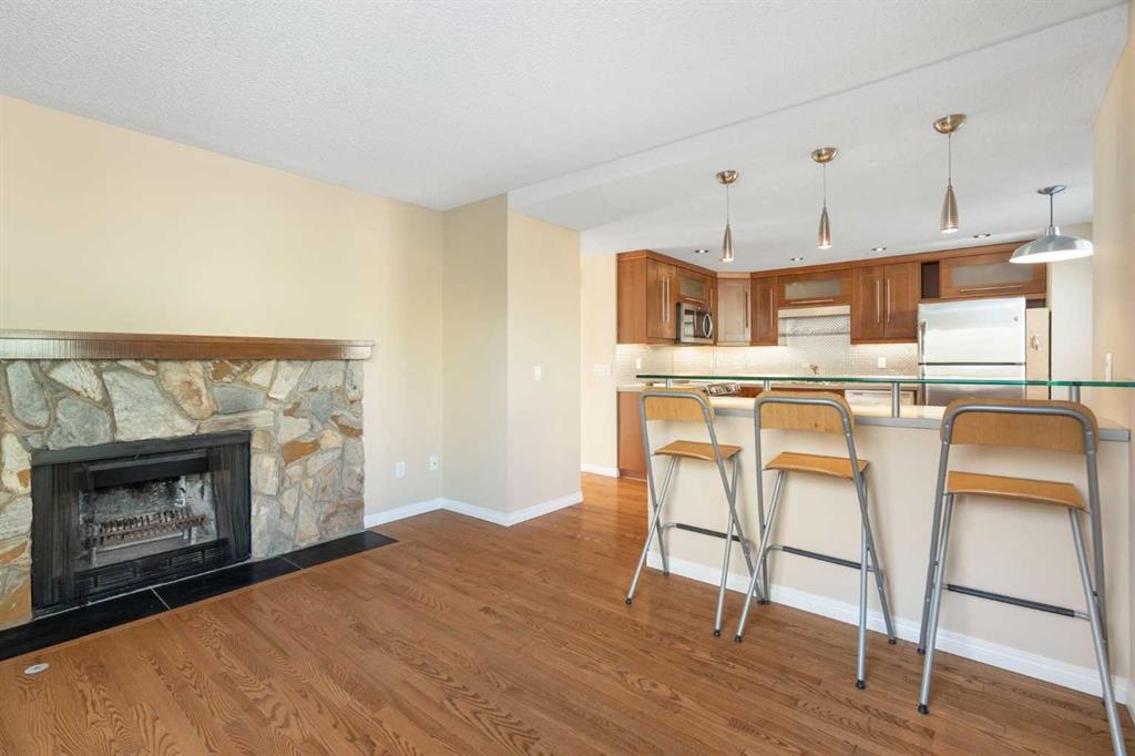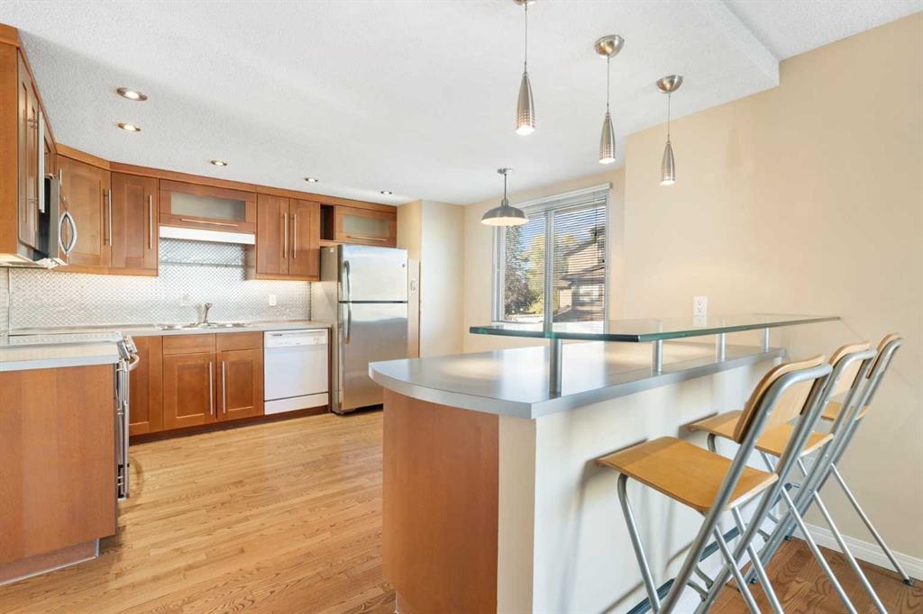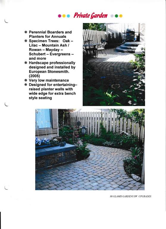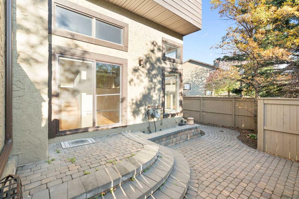EASY LIVING in Glamis Gardens! Terrific end unit Townhome has wonderful natural light throughout the spaces. Separate entry level with closet and access to the attached two-car garage provides a nice introduction to the unit. Step up to the bright living room with vaulted ceiling and sliding doors out to the large private, professionally designed cobblestone patio and garden (please also see Supplements). On the next level are the kitchen, dining and family rooms. Kitchen features beautiful custom cabinetry, checker plate backsplash, plenty of counter and cupboard space, tempered glass raised eating bar, upgraded lighting and full pantry. Separate dining area to comfortably host your guests. Relax in the family room with warm fieldstone wood burning fireplace. Gleaming solid Quebec hardwood (see Supplements) throughout the living, dining, kitchen and family rooms. Two-piece bathroom with custom sink completes this level. Spacious master bedroom with previously upgraded (see Supplements) three-piece ensuite and dual closets. Two other good-sized bedrooms (currently configured as a large single bedroom, great for combined sleeping and work space) and upgraded main bathroom complete the upper level. Partial basement utility space provides open laundry area, storage and large crawl space. Recent updates include; Freshly Painted (Oct. 2025), Stove (2024), Microwave/Hood Fan (2024), Garage Door (2023) and High Efficiency Furnace (2022). Unit, carpets, furnace and ducts professionally cleaned just prior to listing. Minutes from Westhills shopping, restaurants, and services, plus Canadian Tire, London Drugs, Co-Op, and many more. Close to schools, Mount Royal University, and transit. Easy access to Sarcee, Glenmore and Stoney Trails so very quick to get around town or go out of town. READY to move in, RELAX and ENJOY!