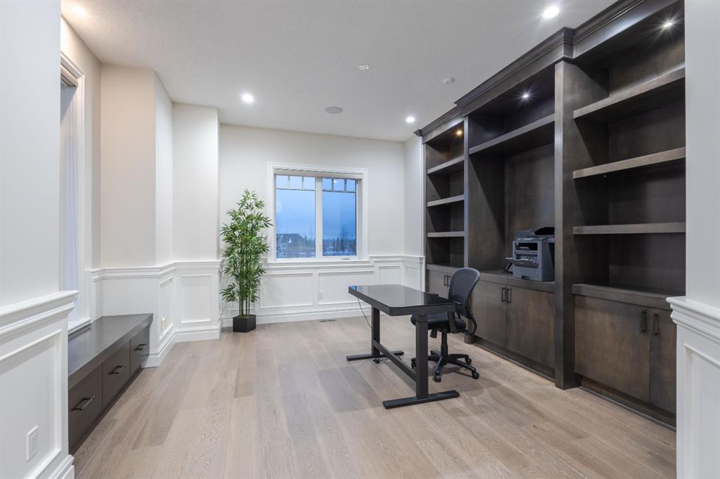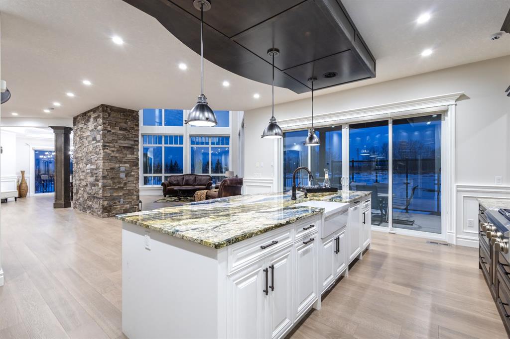 Located on two acres in the heart of prestigious Bearspaw, this exceptional custom-built estate offers over 7,000 square feet of refined living space, blending timeless elegance with modern luxury. From the moment you arrive, the grand entrance makes a lasting impression with soaring open-to-below ceilings, a breathtaking sense of scale, and stunning west-facing views that stretch toward the mountains. Expansive windows throughout the home flood the interior with natural light, enhancing the open-concept design and creating a seamless connection to the surrounding landscape. The chef-inspired kitchen is both beautiful and functional, featuring rich granite countertops, stainless steel appliances, generous bar seating, and a fully equipped spice kitchen—perfect for entertaining or everyday living. Thoughtful design continues with a convenient 2-piece bathroom on the main level. Just beyond, the living room is a true showpiece, anchored by a striking gas fireplace with stone surround and wooden mantel, while panoramic west and mountain views create an unforgettable backdrop. Step outside to the expansive west-facing wraparound deck, offering both covered and open-air spaces designed for relaxation and entertaining. With its private setting and sweeping mountain vistas, this outdoor retreat is truly one of a kind. Upstairs, the home continues to impress with an open-to-below design and a remarkable abundance of windows that showcase the incredible views. In addition to the primary retreat, there are four spacious bedrooms, two well-appointed bathrooms, and a thoughtfully designed laundry room complete with built-in cabinetry and a sink. A dedicated storage room adds even more practicality to this level. The primary suite is a luxurious sanctuary, featuring a double-sided gas fireplace, a spacious walk-in closet with custom built-ins, and a lavish 6-piece ensuite with a soaking tub, dual vanities, and premium finishes throughout. Step out onto your private balcony to take in the mountain views, or enjoy the attached flex space—perfect as an art studio, lounge, or private retreat. The fully developed walkout basement is designed for both entertainment and wellness. Enjoy movie nights in the dedicated theatre area with built-in sound system, host gatherings at the wet bar with custom built-ins, or relax in the sauna after a workout in the home gym. This level also includes in-floor heating, two additional bedrooms, a 3-piece bathroom, and direct access to the backyard. Dual staircases provide convenient and elegant access throughout the home, while features such as a water softener enhance everyday comfort. Car enthusiasts and hobbyists will appreciate the impressive heated six-car garage with ample space for storage and projects. With its unparalleled craftsmanship, luxurious finishes, and breathtaking setting with views of the northern lights and just minutes from the city, this extraordinary Bearspaw estate offers a lifestyle of sophistication and natural beauty.