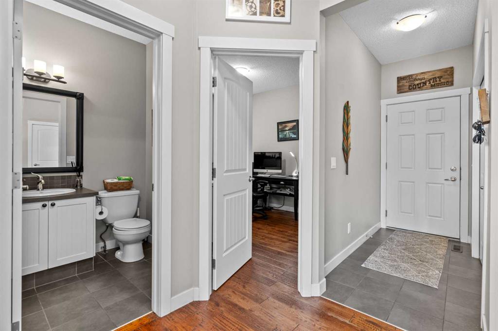 Located in Heritage Hills on Cochrane’s west side, this gorgeous two-story home is beautifully decorated and has an amazing family vibe with a touch of elegance. Walking in, whether you come in through the garage or front door, you will be welcomed home by lots of room to kick off your shoes on the easy to maintain ceramic tile entryways. Both entries also include ample closet space for all your outerwear. The main floor is open concept, with scraped hardwood floors throughout, and a super functional kitchen with quartz countertops with a big center island. The kitchen is truly the heart of this home, with a raised bar for hosting your guests, tons of cupboards for storage and counter space for whipping up some snacks and a huge pantry. The dining nook is bright and open with large sunny south facing windows, and the great room includes a cozy gas fireplace which makes it the perfect place to relax. There is also easy access to the deck and backyard, for hosting in the beautiful outdoors. The main floor also includes a dedicated office and a half bath on the main floor and access to the double attached garage.