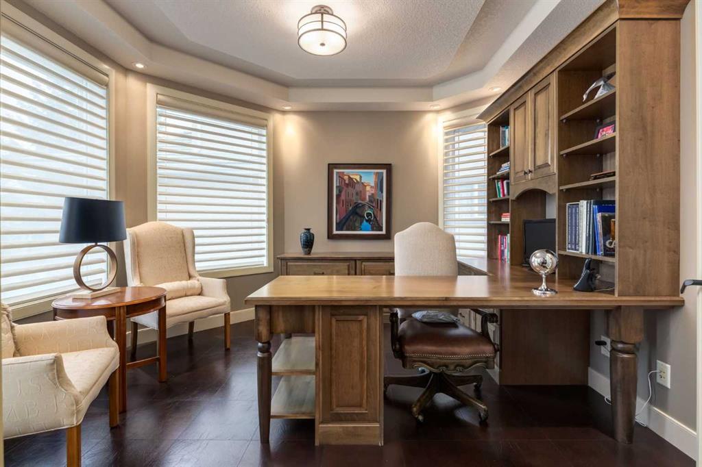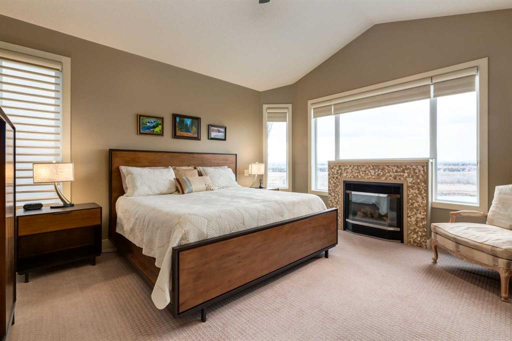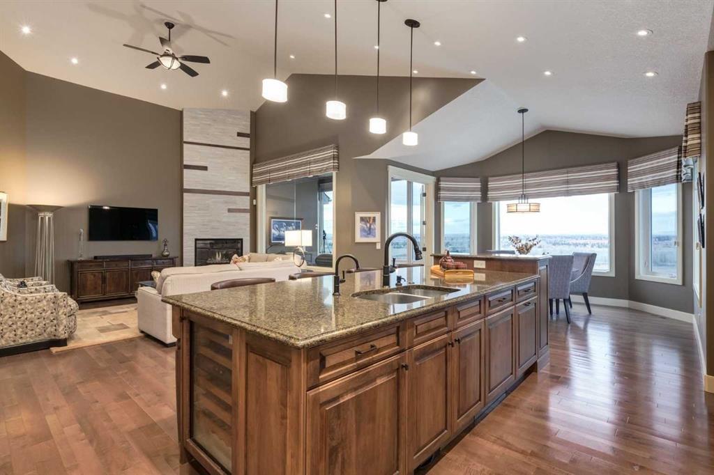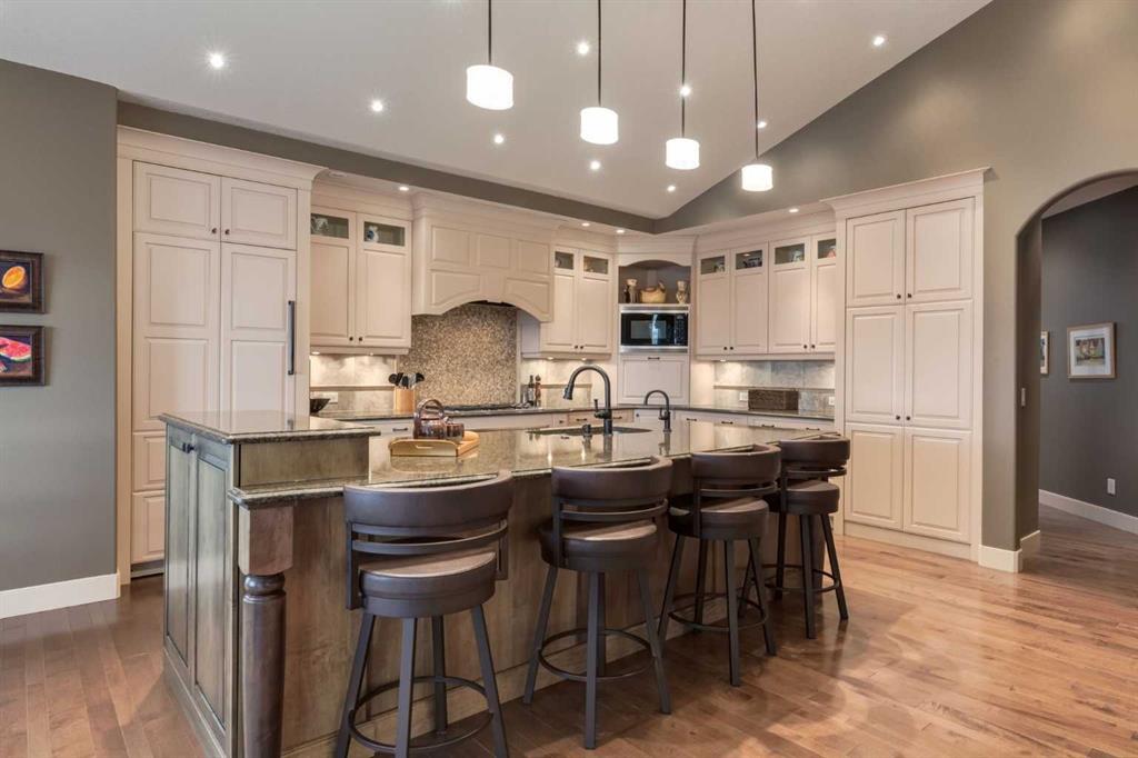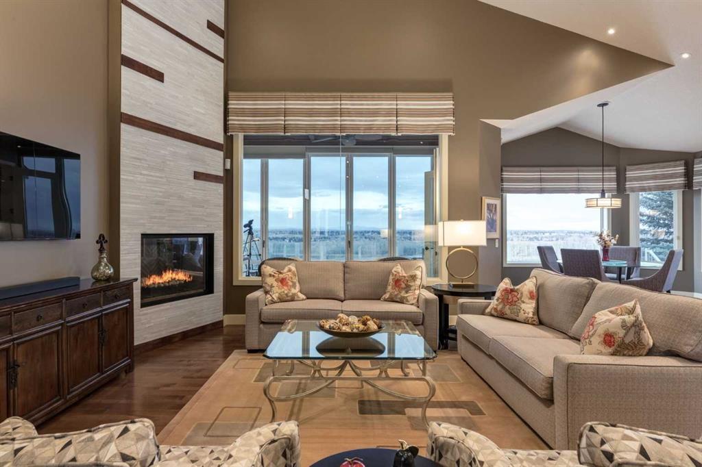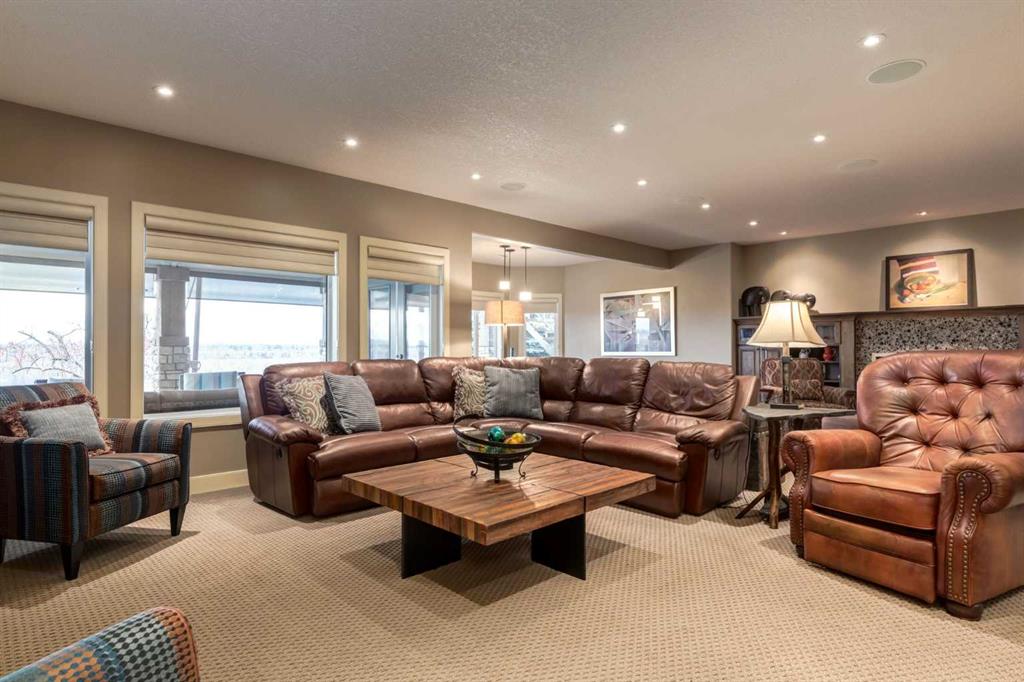 Spectacular view of world famous Bow River, valley and mountains from the Heated Sunroom which is an integral part of this home in all seasons and is included in the measurements. (The entire wall opens by folding/sliding doors). Walk out to deck with glass-paneled railings and stairs leading to the fully landscaped yard. As you walk up to and enter through the gorgeous front entry, you will enjoy the solid hardwood front door and beautifully tiled entry. The adjacent office/flex room with built-in desk and wall shelving unit is bright and private with its double doors and inviting tiled floor. Dining room with built-in cabinetry and ample space for a big table is adjacent to the Living room which has a well designed gas fireplace for intimate conversations and again, ample space for entertaining while enjoying the view through the large glass window. You will love the kitchen with breakfast nook as well as the island with sink and seating space for visiting. Loving this kitchen with the spectacular view will be easy. Also high quality appliances in kitchen include Wolf Microwave, Sub Zero Fridge, Wolf built-in oven, Gas stove, Wine fridge. Appliance garage. Recycle bins. What a delight to have the view while preparing delectable meals with a glass of your favorite wine. Great, spacious pantry too. Primary Bedroom/walk-in closet also overlooks the fabulous view and has its own gas fireplace as well as a walk-in closet. Laundry is just steps away to the garage entry as well with a walk-in coat closet and 2-piece bathroom. The curved staircase leading you down to another beautiful space with full bar, lovely cabinetry and granite countertops. Fisher & Paykel dishwasher (double drawers), Sharp microwave drawer, Sub Zero wine fridge and stainless sink. Family room with gas fireplace, games/dining area and fabulous built in cabinetry, three bedrooms with walk-in closets, 4-piece bath, art/flex room, Utility room. 2 Hot water tanks, one dedicated to floor heating down, high efficiency furnace, water softener, sprinkler system.