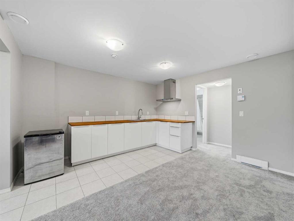 The main floor features a functional open-concept layout with a bright living area, dining space, and a modern kitchen complete with stainless steel appliances, ample cabinetry, and a central island with a wood countertop that adds warmth to the space.