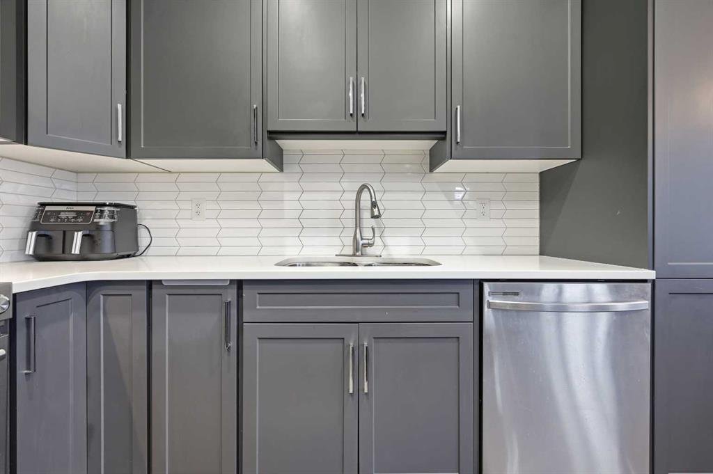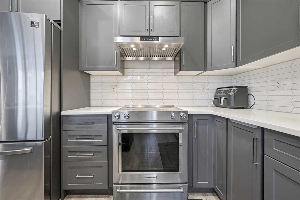 The spacious, modern kitchen is ideal for both everyday living and entertaining, featuring stainless steel appliances, custom crisp white countertops, ample grey cabinetry, and a large center island with a sit-up breakfast bar—perfect for gatherings with family and friends.