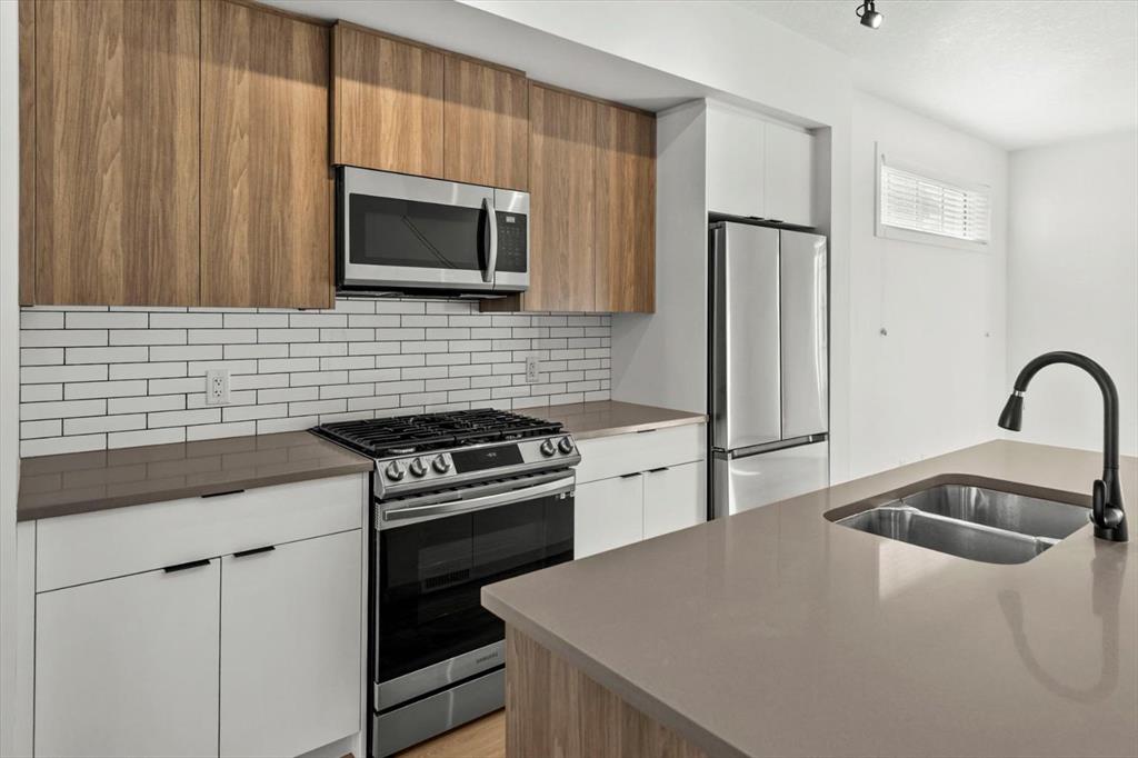 Are you looking for bright, air-conditioned open concept living? What about with a convenient location near Township Shopping Center with easy access to Macleod Trail and Stoney Trail. The original owner of this home, it has been lovingly maintained and is pet/smoke free. Set along the courtyard, this townhome has a tandem double attached garage. On the main floor, the open concept layout is elevated by 9’ ceilings, durable LVP flooring and modern finishings. The two-tone kitchen offers a large island, and is finished with grey quartz counters and upgraded stainless steel appliances – including a gas range. South sunshine floods into the dining area – which is separate from the kitchen and overlooks the courtyard. The living room has a media nook and leads out to your balcony. Perfect for grilling, chilling and making the most of summer nights. This level is complete with a private powder room just before heading upstairs. On the top level, the airy owners retreat features natural light and a modern 3 piece ensuite. This level also offers 2 additional bedrooms, another 4 piece bathroom and convenient laundry. This is a great starter home, or for downsizing folks who are done taking care of the yard and want a lock and go lifestyle. Contact your trusted agent to book a showing before She Gon’!