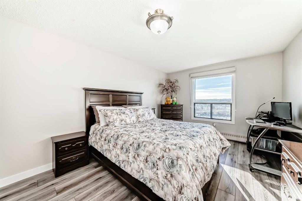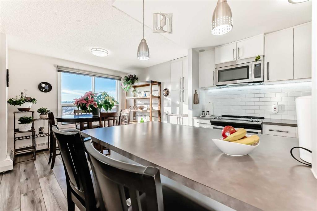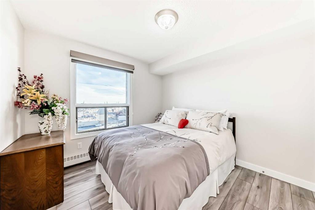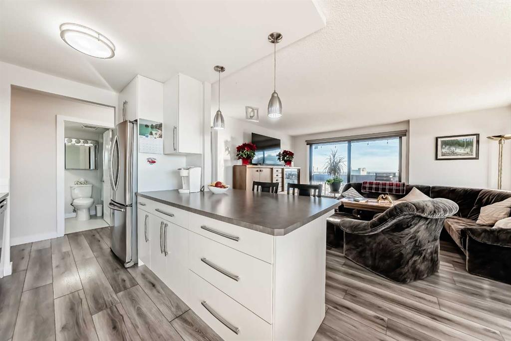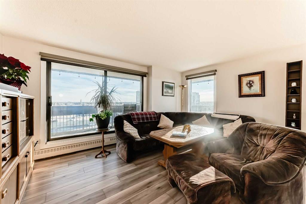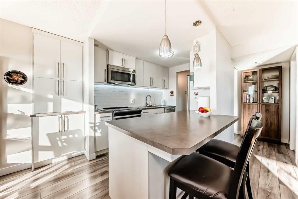 Stunning, fully renovated two-bedroom condo boasting south exposure and breathtaking panoramic views from the wrap around balcony! This bright and beautiful unit features an open-concept layout with an eating counter overlooking the spacious living area, flooded with natural light from expansive windows and a wrap-around balcony. The modern kitchen is equipped with custom cabinetry, premium stainless-steel appliances, ample counter space, an additional pantry, and stylish laminate and tile flooring. Enjoy high-end window treatments throughout, including blackout blinds in both bedrooms. Convenience is at your fingertips with in-suite laundry. Located in a highly sought-after building offering top-tier security, concierge service, and a welcoming community atmosphere. Amenities include a lobby with parcel lockers, social room is fully appointed with a kitchen, washrooms, comfortable seating, TV, vending machines, a book collection, and puzzles—perfect for gatherings and relaxation and there is a well-equipped fitness centre on the 3rd floor. CONDO FEES INCLUDE: all utilities—electricity, heat, water, sewer, parking, and full access to building facilities. This is an 18+ building. Don’t miss the opportunity to call this exceptional condo home! Dogs not allowed but cats are ok.