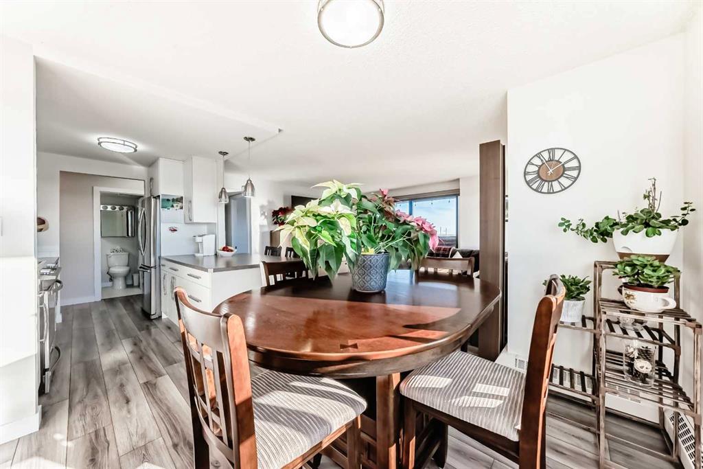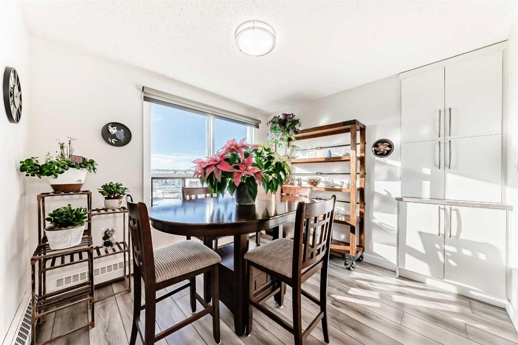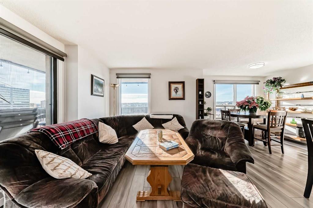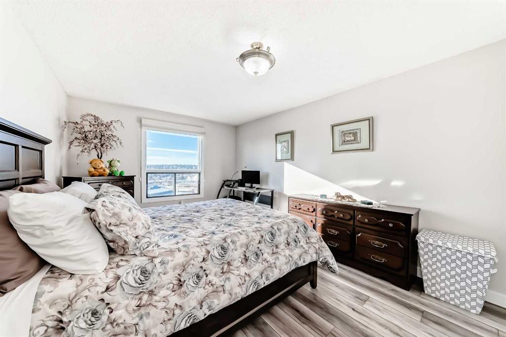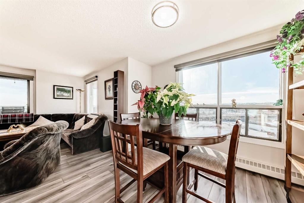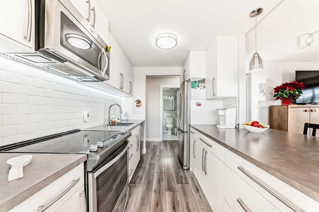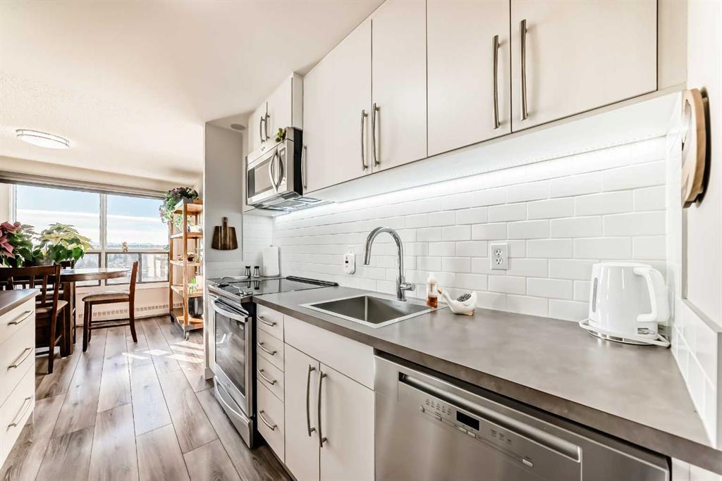 Stunning, fully renovated two-bedroom condo boasting south exposure and breathtaking panoramic views from the wrap around balcony! This bright and beautiful unit features an open-concept layout with an eating counter overlooking the spacious living area, flooded with natural light from expansive windows and a wrap-around balcony. The modern kitchen is equipped with custom cabinetry, premium stainless-steel appliances, ample counter space, an additional pantry, and stylish laminate and tile flooring. Enjoy high-end window treatments throughout, including blackout blinds in both bedrooms. Convenience is at your fingertips with in-suite laundry. Located in a highly sought-after building offering top-tier security, concierge service, and a welcoming community atmosphere. Amenities include a lobby with parcel lockers, social room is fully appointed with a kitchen, washrooms, comfortable seating, TV, vending machines, a book collection, and puzzles—perfect for gatherings and relaxation and there is a well-equipped fitness centre on the 3rd floor. CONDO FEES INCLUDE: all utilities—electricity, heat, water, sewer, parking, and full access to building facilities. This is an 18+ building. Don’t miss the opportunity to call this exceptional condo home! Dogs not allowed but cats are ok.
