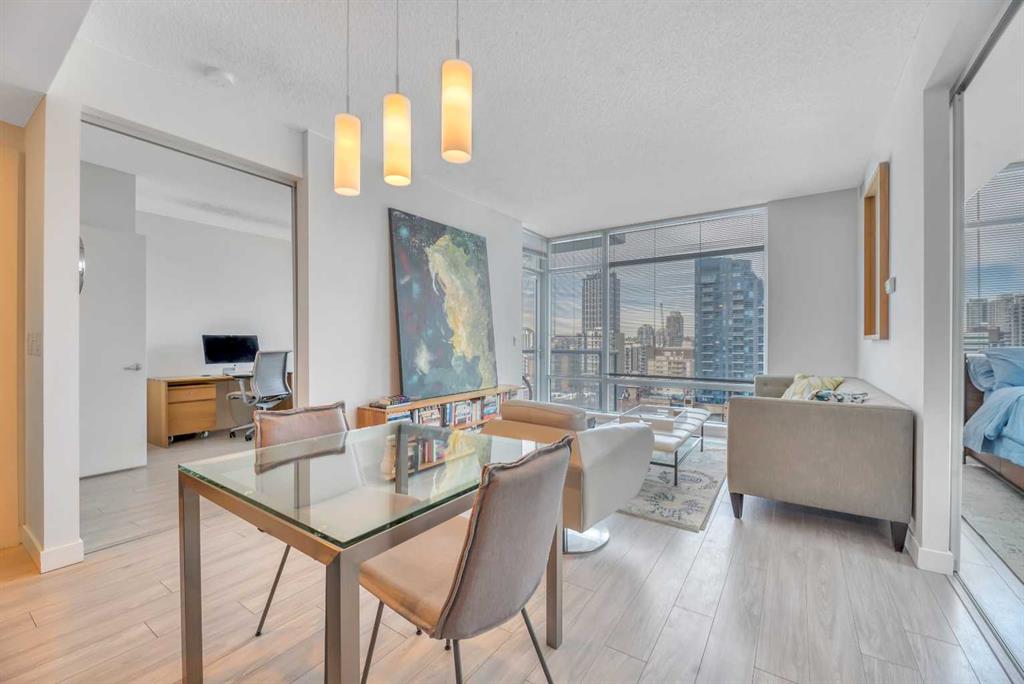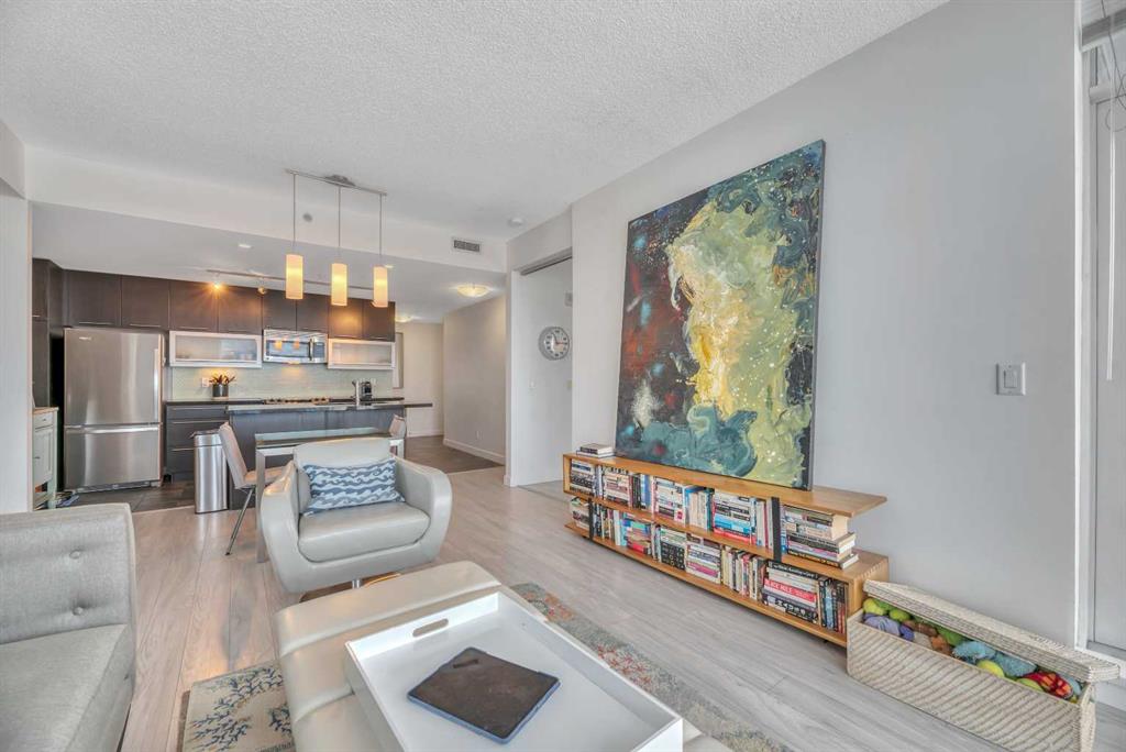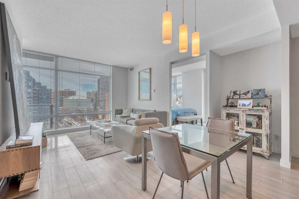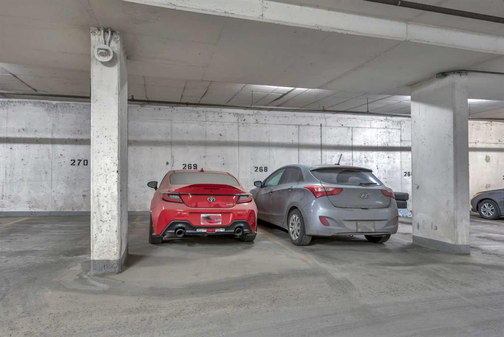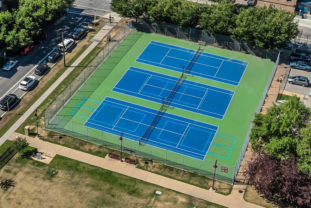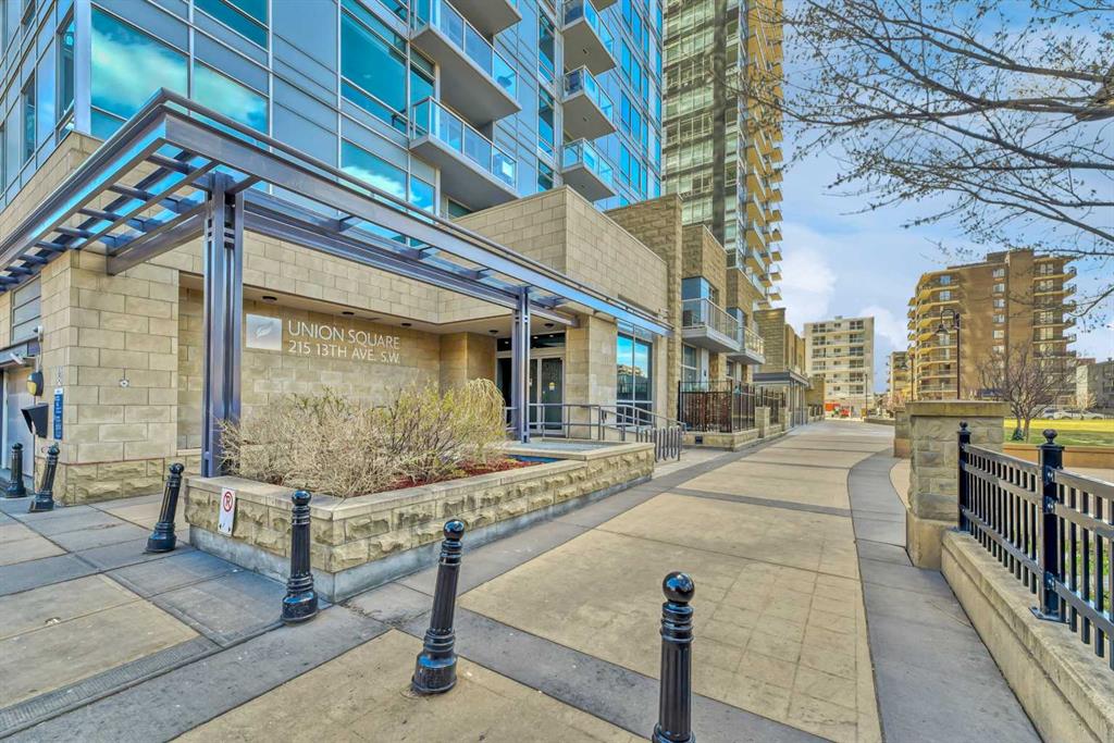DESIRABLE NW CORNER 2 BEDROOM, 2 BATH UNIT, FLOOR TO CEILING WINDOWS with 9 foot CEILINGS. Enjoy the 270 degree views spanning the downtown skyline, Haultian Park and the mountains. Very desirable location with the west views directly overlooking the park-enjoy an evening beverage from the covered balcony or BBQ using the convenient gas line. The bedrooms are separated by the living room, at opposite ends of the condo, for added privacy Excellent finishing inside the unit with granite counters, eating bar area, glass backsplash and SS appliances(fridge less than 2 years old). Enjoy warm summer nights with comfortable central AC, and park conveniently in the heated underground parkade, with additional storage. Classy corner, primary bedroom with an enormous walk in shower. The second bedroom is a wonderful option as a bedroom or a home office with a view. Laminate and tile floors are easy to clean and durable. In suite laundry in a closet as part of the main bath is both functional and practical. Ideal location with only a 15 minute walk to the downtown core, steps away from restaurants, shops, C-train and Stampede Park venues. All this and a park, playground, updated tennis courts right out your door makes inner city living at UNION SQUARE feel like home.