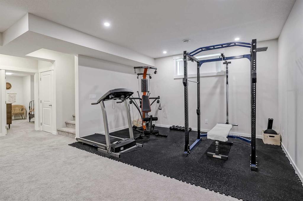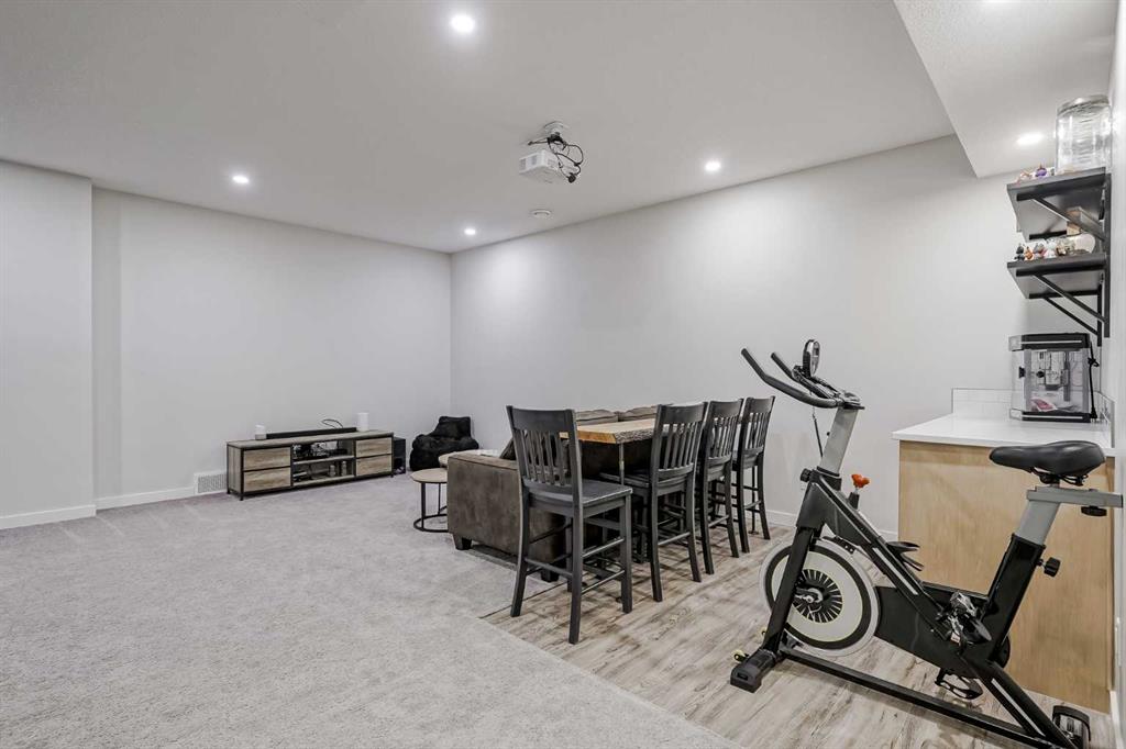 Upstairs, a vaulted bonus room provides a perfect retreat for family movie nights or a play area. The luxurious primary suite features dual walk-in closets, dual vanities, and a built-in makeup station. Two additional bedrooms, an upper-level laundry room, and a well-appointed full bath complete the upper floor. The professionally finished basement by Basement Builders continues the home’s quality, featuring 9-foot ceilings, a large recreation area with a home gym on one side and a cozy family room with a bar on the other, plus a fourth bedroom and a full bathroom—ideal for guests or extended family.