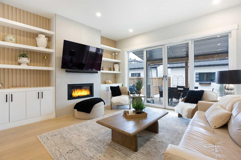 The living area is anchored by a gas fireplace with custom millwork and opens to the backyard through large Kulu Tilt & Slide tilt-and-turn doors, leading to a covered composite deck and professionally landscaped yard.