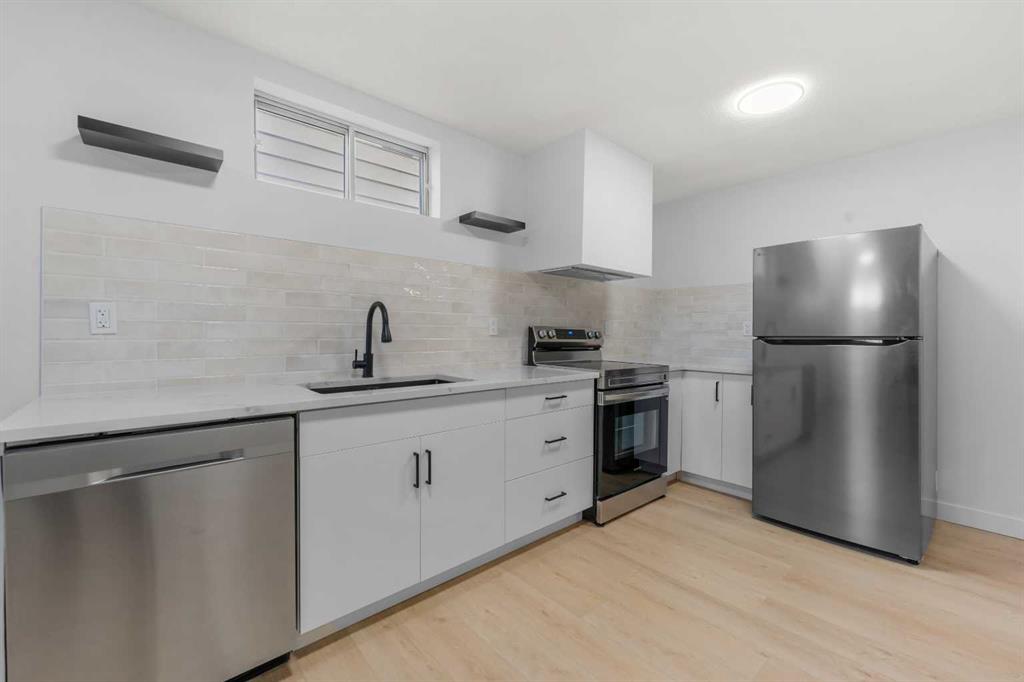 Welcome to “Paradise at Berkley”! This 5 bed + 2.5 bath fully remodeled semi-detached Bungalow with a WALKOUT Basement has been thoughtfully REMODELED from the studs up in a modern farmhouse style. With a beautifully finished 2 bed + 1 bath illegal SUITE, this home offers the perfect balance of family living with a downstairs rental, or a multi-generational household. With Brand NEW PLUMBING throughout the entire home, this property makes an incredible investment! Inside, the Open Concept floor plan is bursting with style. Superior craftsmanship is showcased throughout — from the massive Oak BEAM framing the kitchen paired with 8mm light oak LUXURY VINYL PLANK flooring running seamlessly across the home, custom ‘hidden’ laundry tucked behind dual Barn Doors, and new windows that flood the home with natural light. Your guests will love cozy evenings around the custom electric fireplace, where elegant tilework and a tailored frame add warmth and sophistication. The chef-inspired kitchen is a showstopper, featuring a statement Custom Range Hood, Quartz Countertops with an undermount Composite Sink, light oak Floating Shelves, a spacious Black Fluted Island with breakfast bar, matte black Hardware, a striking cloudy tile backsplash — all tied together with a full suite of Stainless Steel Appliances. The main level features 3 spacious bedrooms and 1.5 baths, including a tranquil primary suite with a VIEW and walk-through closet leading to the private ensuite bath. The Walkout Basement offers a spacious 2 bed + 1 bath illegal SUITE, designed with the same attention to detail — featuring a second CUSTOM Kitchen with crisp white cabinetry, black matte Hardware, and modern finishes throughout. Enjoy the backyard, offering a private space for your family, or tenants and access to your oversized driveway. Whether you’re looking to live up, rent down, or run an Airbnb (as the current owners have successfully done over the summer months), your options are endless. Don’t miss your chance to own ‘Paradise at Berkley’.