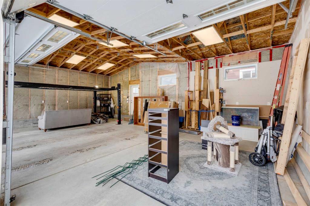 The detached triple garage is a standout feature, offering over 750 sqft of space with ceilings over 11 feet high. Two of the three bays are vaulted, and the garage is equipped with a car lift from Lift King, 220V wiring, and a gas line already installed for future heating. An additional parking pad provides space for extra vehicles or RV parking. The home also includes air conditioning, a solar panel system, and a hot water tank replaced in 2025.