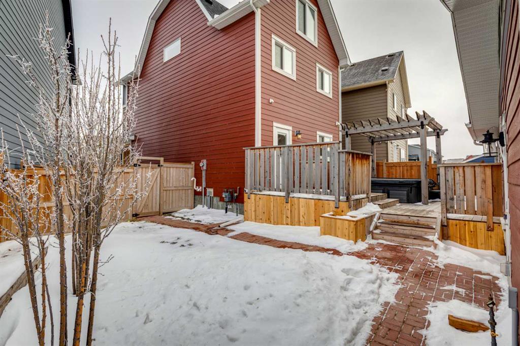 Triple Garage Alert! Welcome home to this inviting Mahogany 3 Storey home, perfectly positioned on a large pie-shaped lot offering exceptional indoor and outdoor living. A generous front porch sets the tone, welcoming you into a thoughtfully designed entry complete with a built-in bench for boots and jackets and a convenient front closet. The main floor opens into a bright, airy living space highlighted by large triple-pane windows, high ceilings, ceiling fans, and seamless flow between the living room, dining area, and kitchen—ideal for both everyday living and entertaining. Just beyond the kitchen is a discreet main-floor bathroom and a rear entry leading to the expansive backyard. Outdoor features include a large deck built around the Arctic Spas hot tub, a pergola, abundant garden beds, and a dedicated dog run. A cleverly hidden dog door, concealed within a closet, provides direct access to the run. The low-maintenance landscaping continues with a no-mow front yard and a clover lawn in the backyard. Upstairs, the primary bedroom serves as a private retreat with a walk-in closet and ensuite. Two bedrooms with full closets and an additional bathroom complete this level. Luxury vinyl plank flooring was installed throughout the second and third floors in 2022, with new carpet on the stairs.