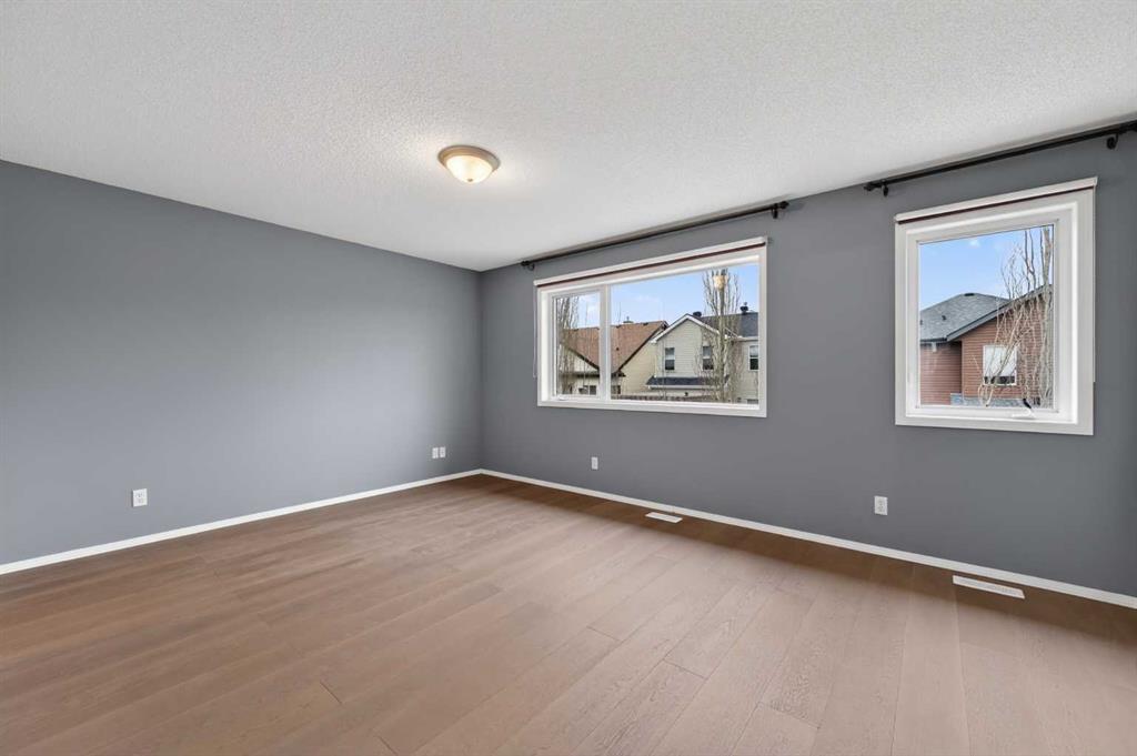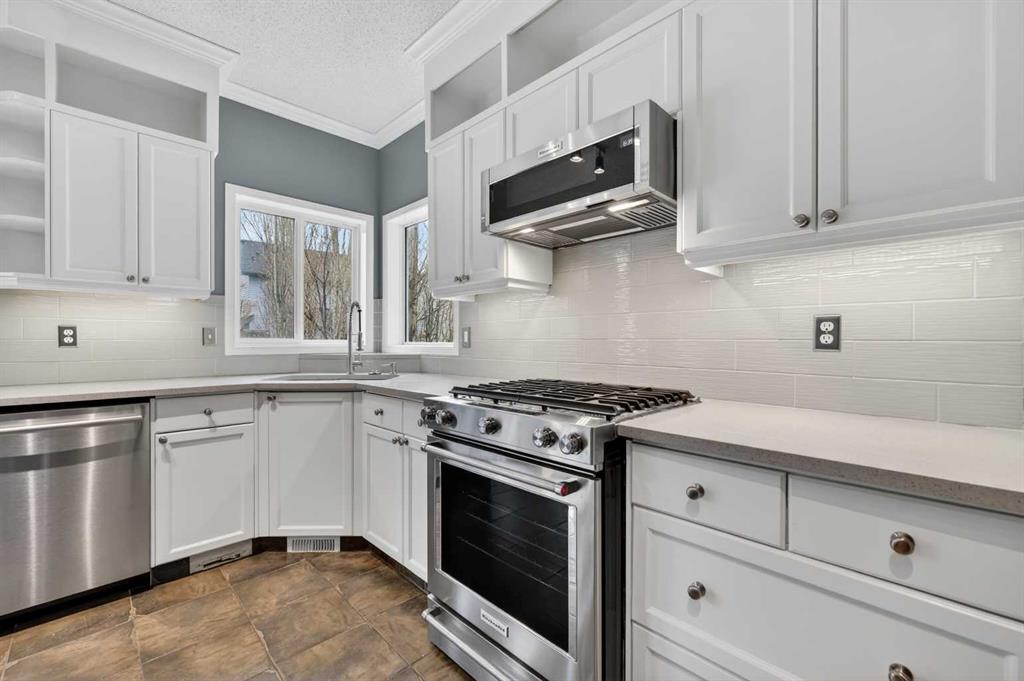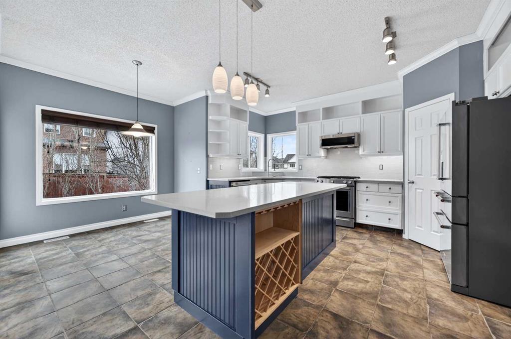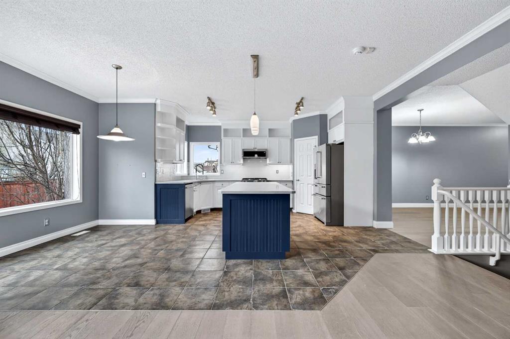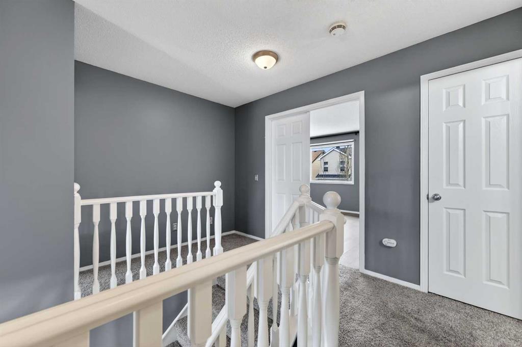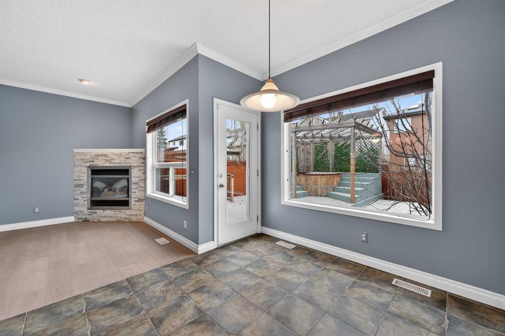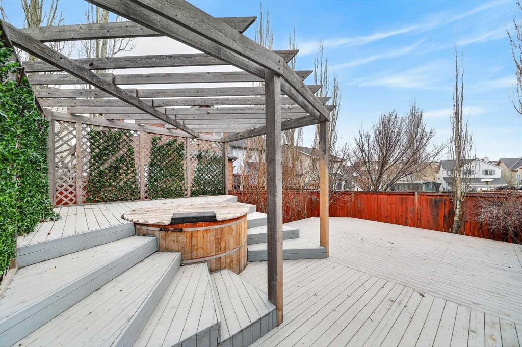 OPEN HOUSE SAT & SUN, MAR 18-19 FROM 2-4PM. This splendid 3 bed/2.5 bath large family home has been lovingly maintained and updated through the years by original owner! A wide and inviting entrance leads to an expansive main floor with vaulted ceilings, front living room & formal dining, and updated kitchen featuring trendy two-tone cabinetry, quartz counters, tile flooring and stainless steel appliances including high-end gas cafe-style range. Corner sink is surrounded by windows and large island provides ample preparation space and built-in wine rack while corner pantry offers tons of storage. Newer hardwood flows throughout main floor including the MAIN FLOOR OFFICE and back Family room. This cozy family space features a gorgeously updated stone corner gas fireplace and large south facing windows! The main level is completed by a 2 pc bathroom and MAIN FLOOR LAUNDRY, big enough for a mud-room combo, with access to the insulated and over-sized garage (wall heater included!). Gorgeous custom staircase leads to upper floor and to French door entrance to the king-sized primary bedroom, large enough for a seating area, and over-sized walk-in closet! Ensuite has been updated with new vinyl tile including walls around separate soaker tub, new glass shower door, quartz counters, and built in storage shelves! Secondary bedrooms are of generous size, as big as many primary bedrooms! They share an updated full bathroom with full vanity (both drawers and cupboards!) and plenty of quartz counter space! Other upgrades include NEW ROOF & SIDING/one side of house (2025), NEW carpet (2026) on stairs and upper hallways, New Vinyl Tile in Full Bathroom and Ensuite (2026) New furnace (2023), H2O (2021), A/C with new motor and fan coil. Other upgrades and features include 9′ ceilings, niches, custom office wall decor, New Front Door (2026), Newer Lighting, Toilets, Sinks & Faucets and New Garage Door! The undeveloped basement offers ample opportunities! Note: the door envelope at the bottom of the stairs is removable (non-load bearing) and can be removed for expanded development options. Lots of room for another large family space, bedroom, den and (roughed-in) full bathroom. Newer 2 Person Sauna in basement also included (8 years of warranty). Backyard has an amazing multi-level deck construction including a 10 person cedar hot tub (Canhot Tubs), pergola and loads of entertaining space – lawn maintenance free! Plus, a dedicated Dog Run with stylish wrought iron gate! This is the original Evanston home – close to the creek, walking paths and bridge to all kinds of shopping amenities! 5 minute walk to Kenneth D. Taylor School (gr.1-6). Quiet mature street minutes to Stoney Trail commute, your new home is calling!