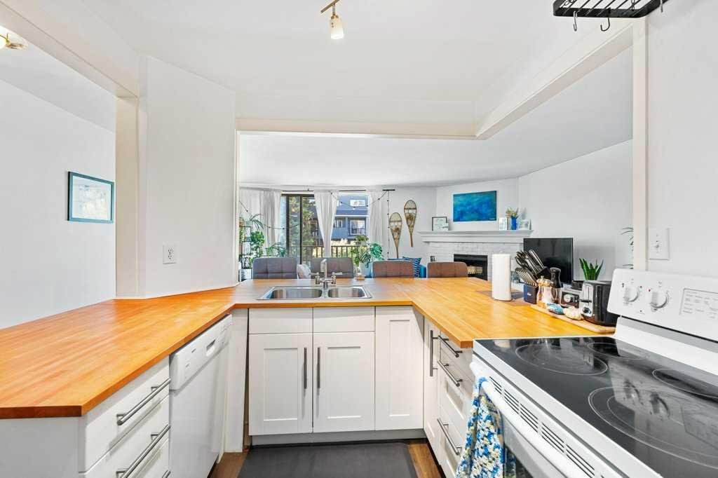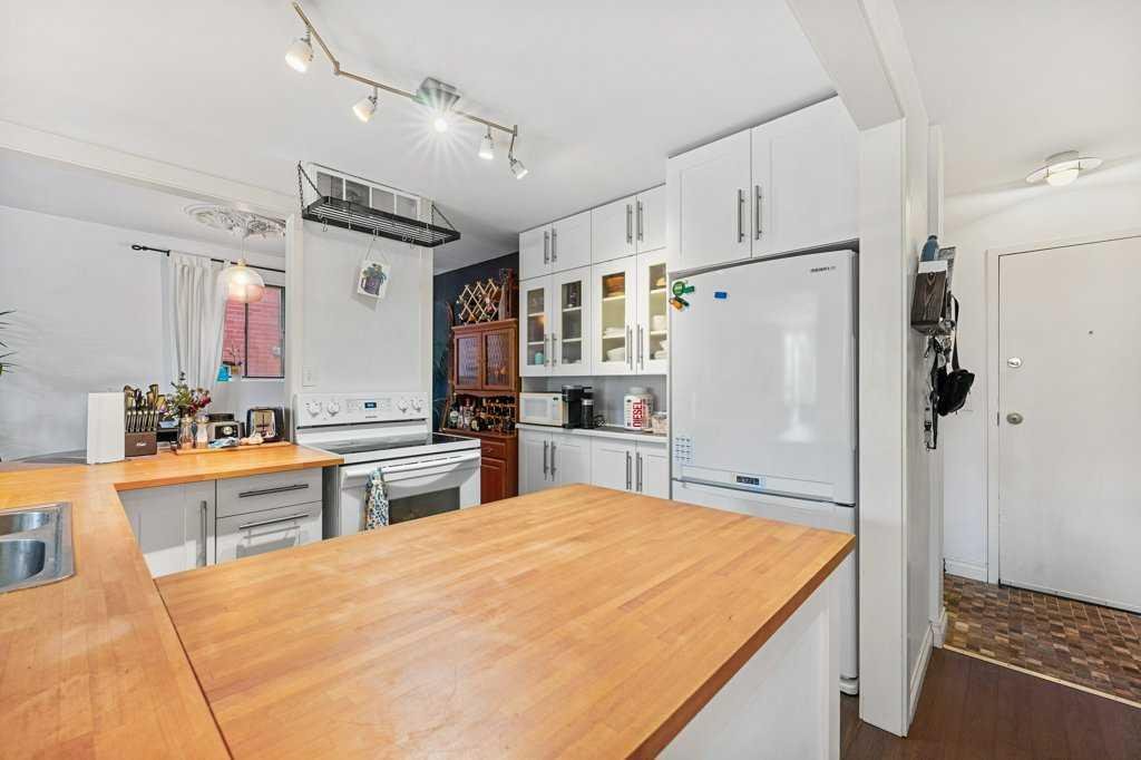 The superb layout of this condo ensures maximum space and functionality. The U-shaped chef’s kitchen, featuring stunning butcher block countertops, is absolutely wonderful. Adjacent to the kitchen is a dining area with custom lighting, ideal for entertaining guests.